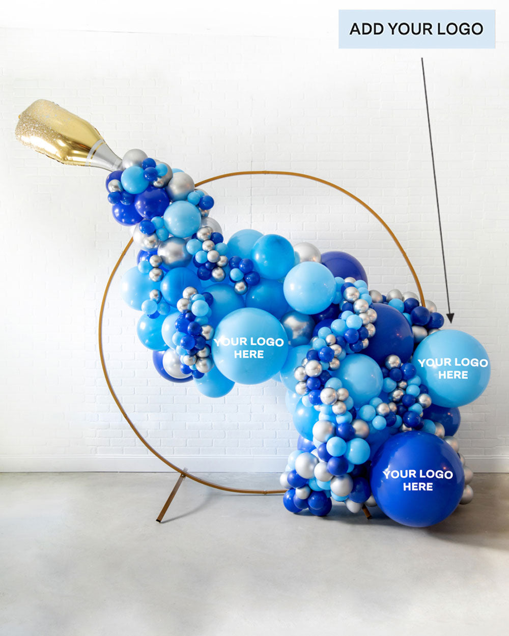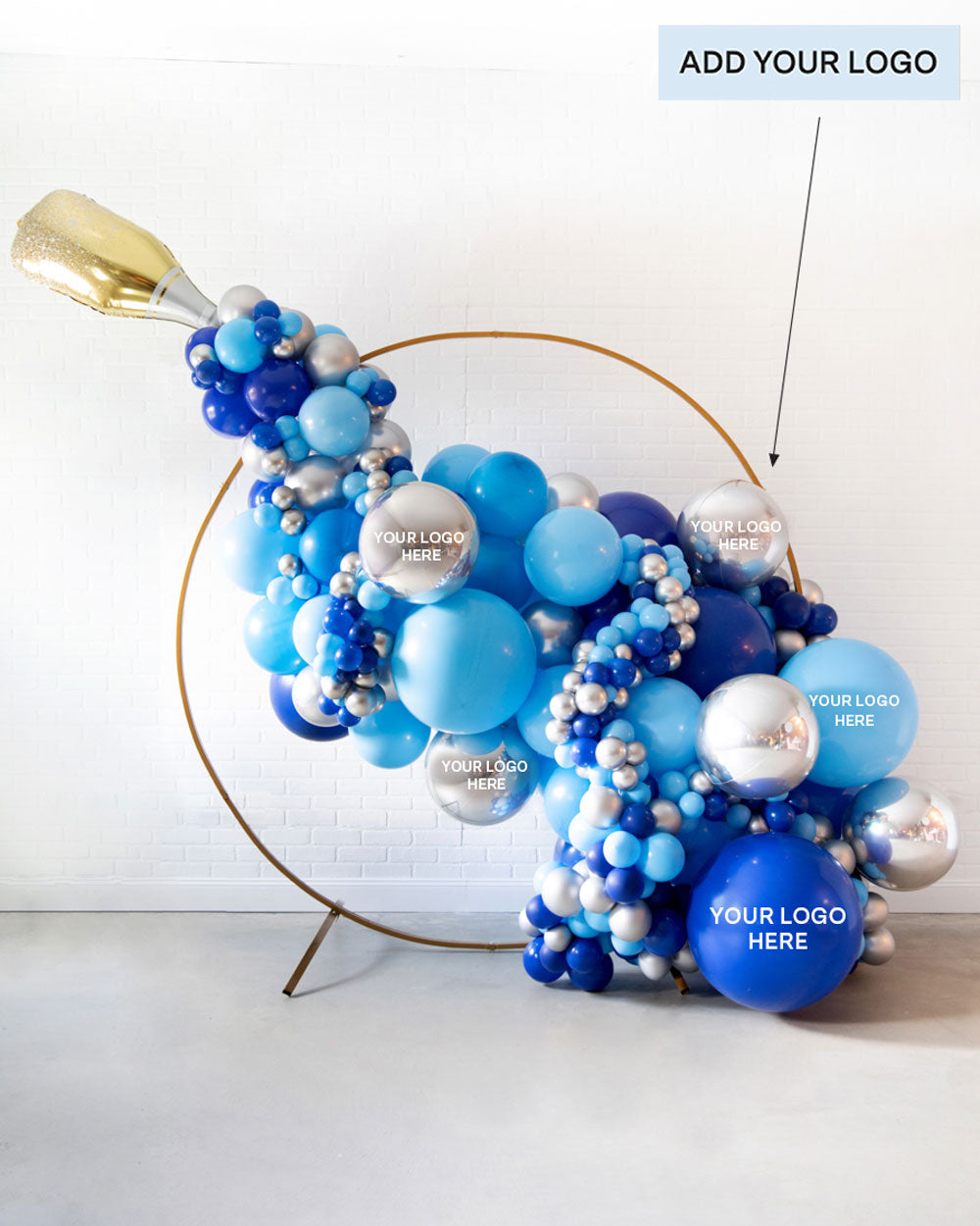 Create a show stopping event with our organic balloon backdrop on gold circle frame. This unique design allows for plenty of photo worthy moments at your corporate celebration. The champagne bottle adds an extra celebratory touch.