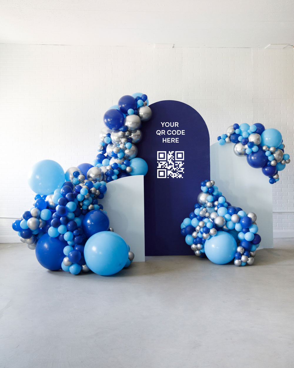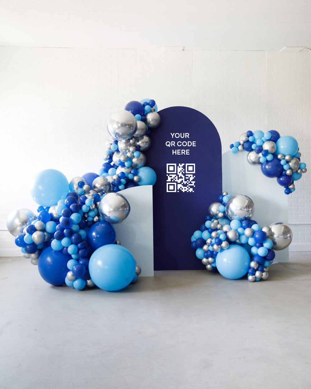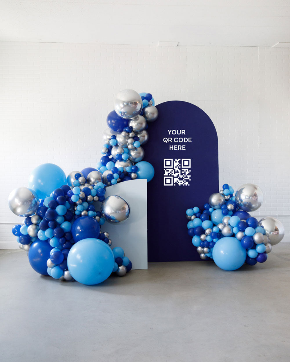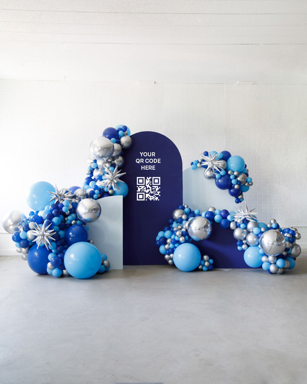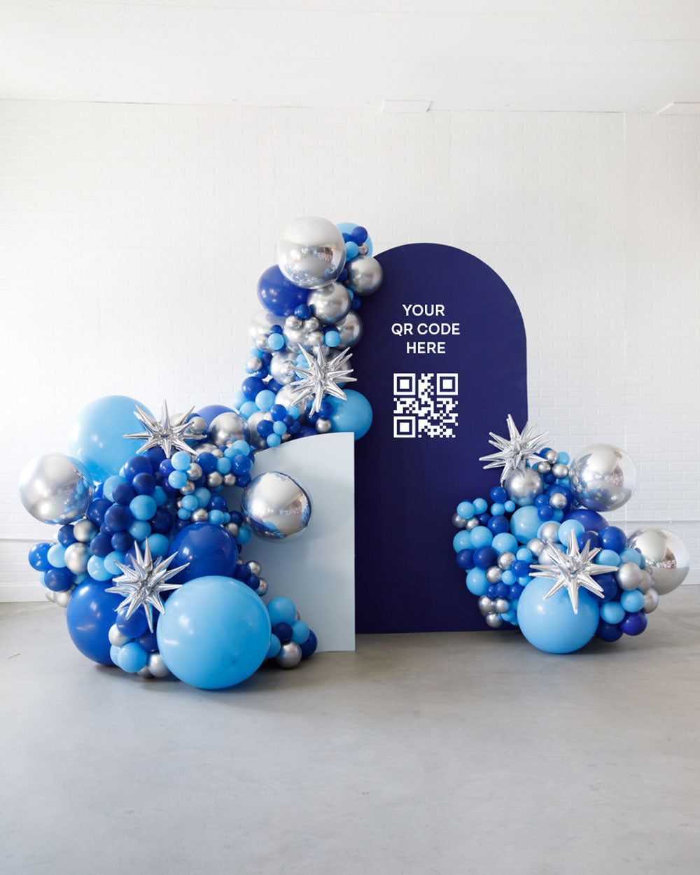 Make a sophisticated moment at your event with this panel and garland set! With an organic balloon garland and two panels, you enjoy your well decorated event. Additional foils and stars can bring more glam to the look. Pick your brand colors and add your logo to the panel or balloons for an extra presence.