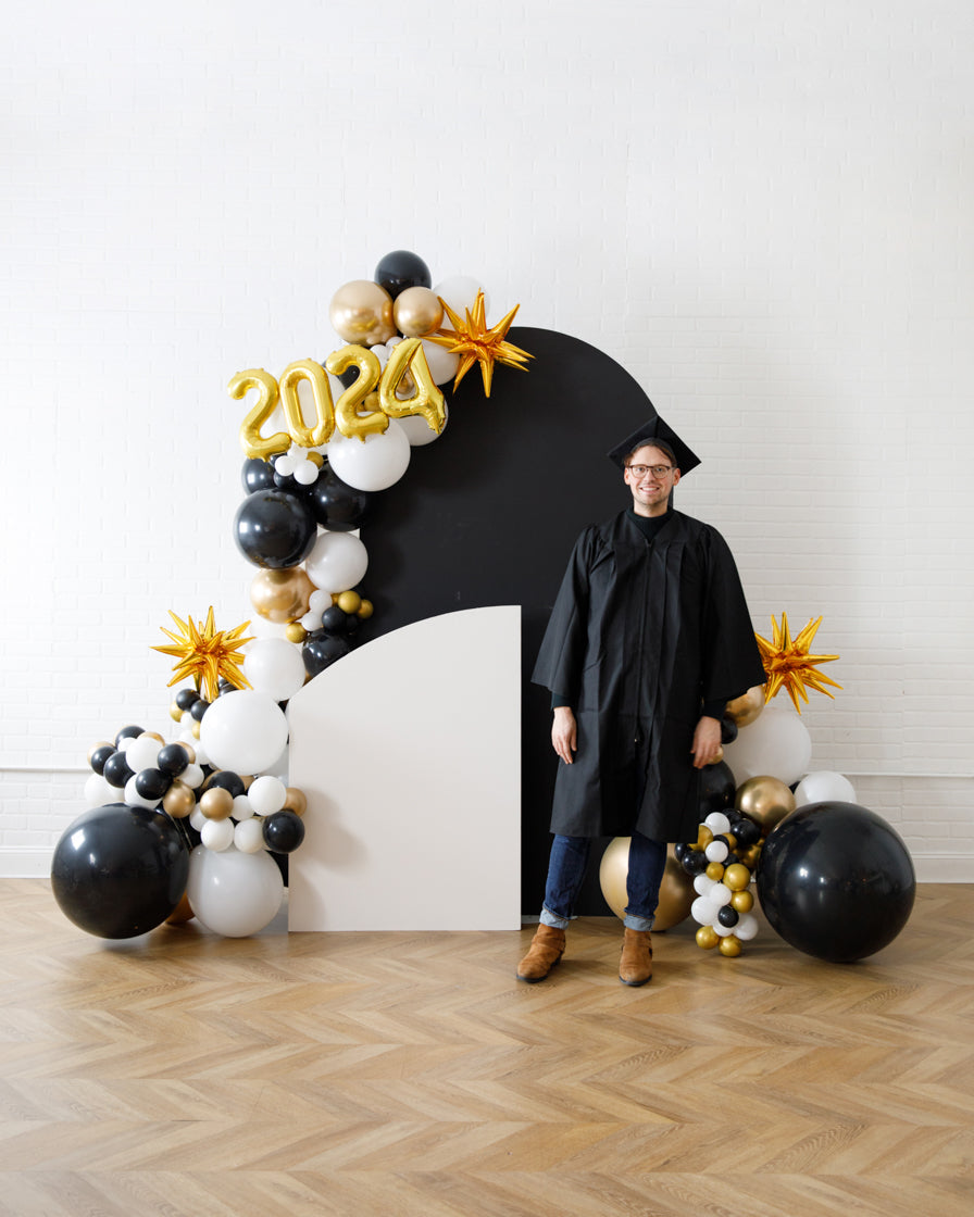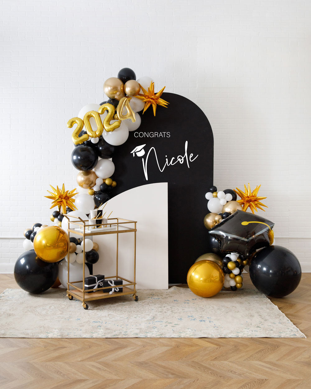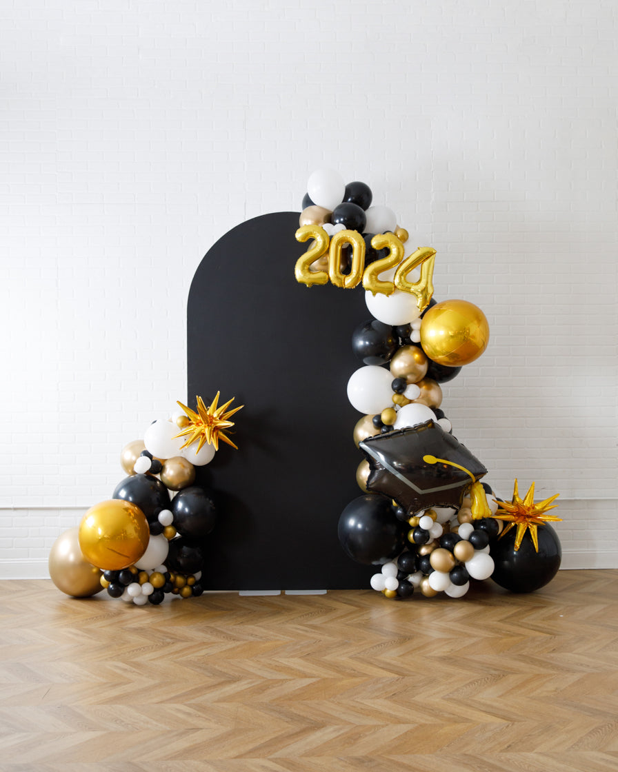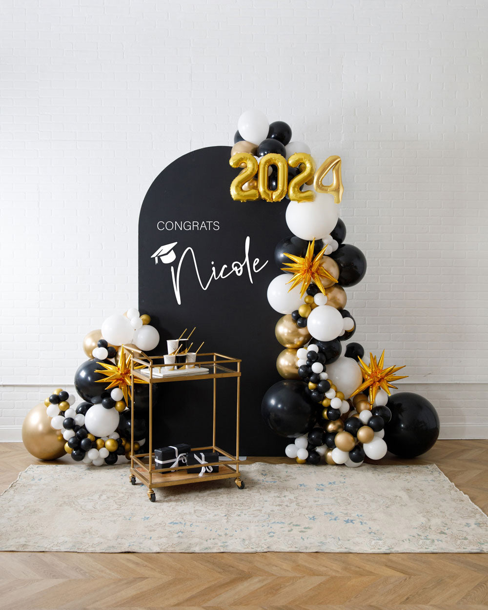Celebrate their Graduation with a backdrop like no other! This Panel and garland designs the perfect way to toast to new beginnings. Choose between three sizes and add a graduation message for the ultimate photo backdrop you and your guests will love!