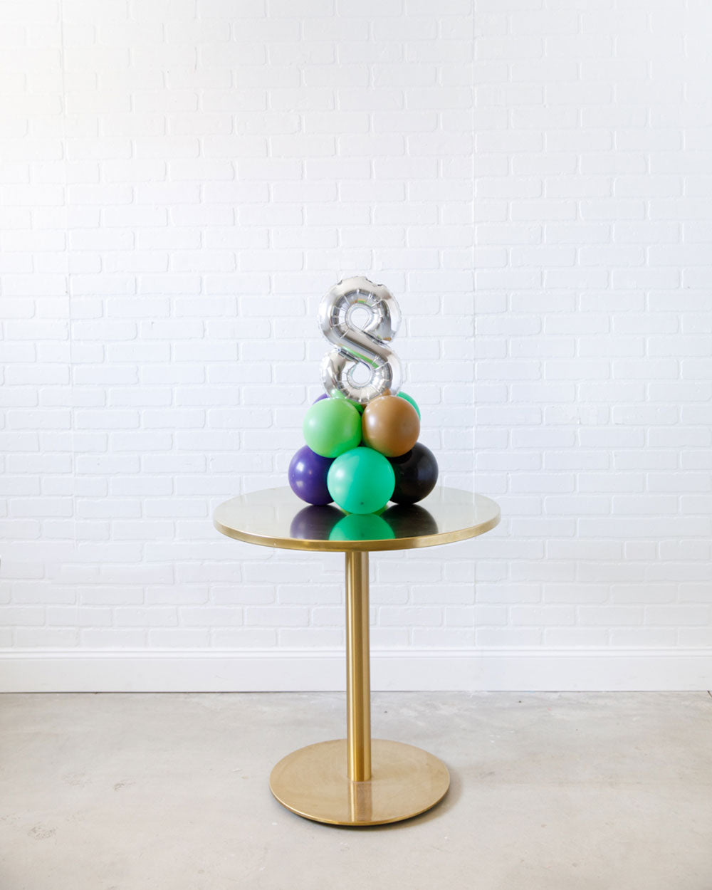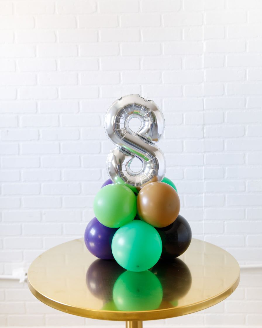 Dress up the table with a fun Minecraft birthday decoration. This easy table decor includes a silver number to celebrate any age and air filled latex balloons in bright shades for a fun Minecraft themed party.