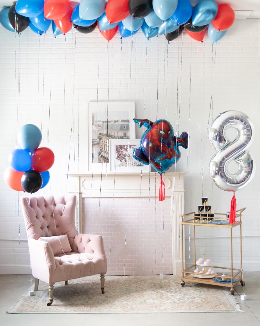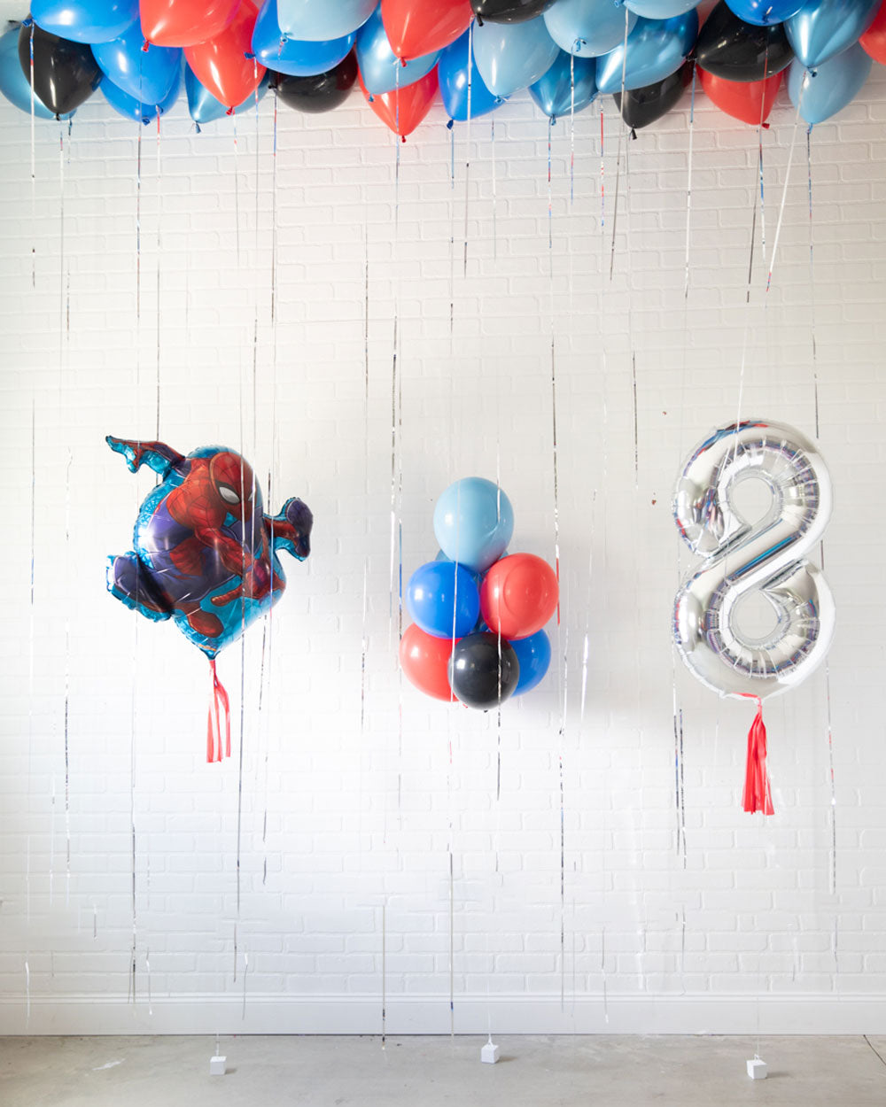 Fill the room with this super fun Spiderman balloon set! This includes ceiling balloons, a Spiderman balloon, number balloon and a balloon bouquet that make the perfect backdrop. Use these bright balloons for your little boys Spiderman themed party.
