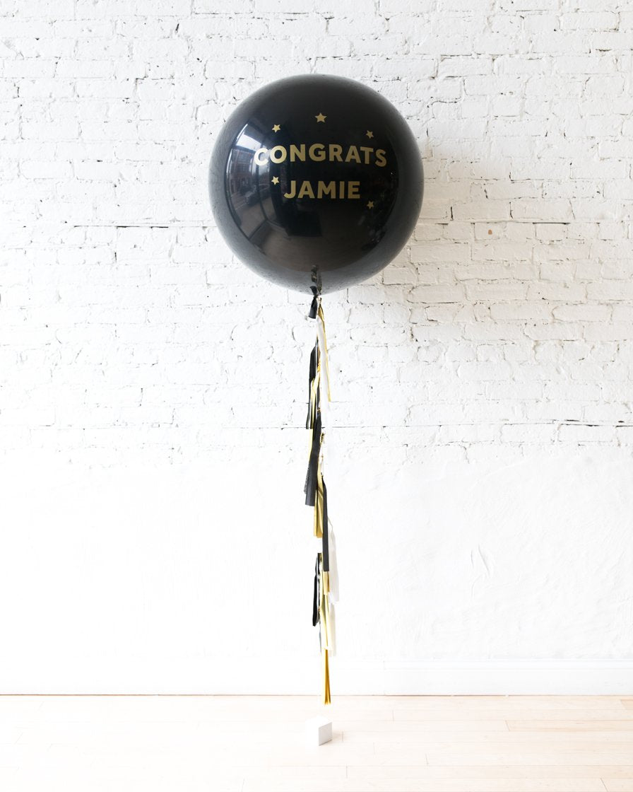 Celebrate a special day with this personalized giant balloon dressed with black, white and gold tassel. Add a card for maximum joy.