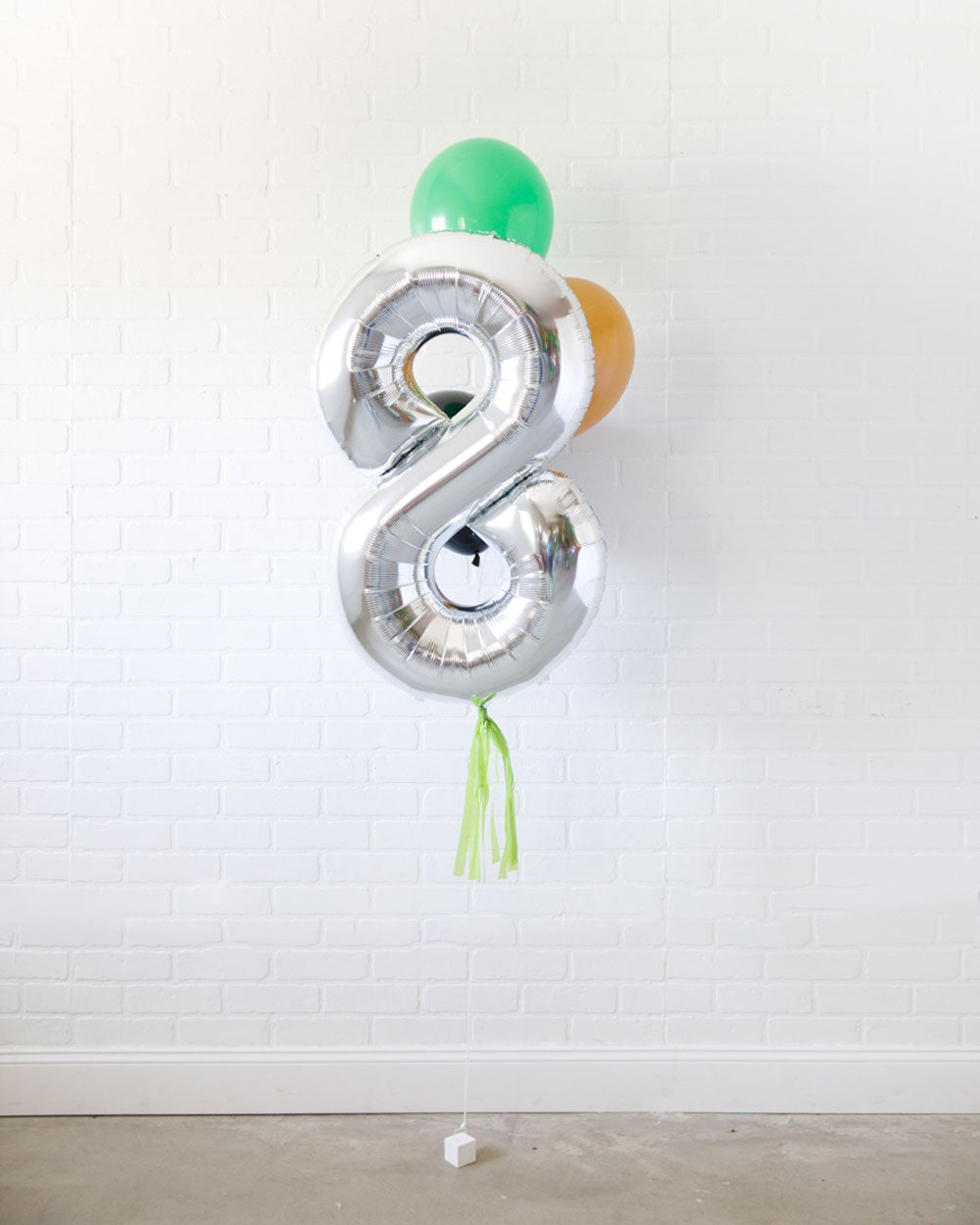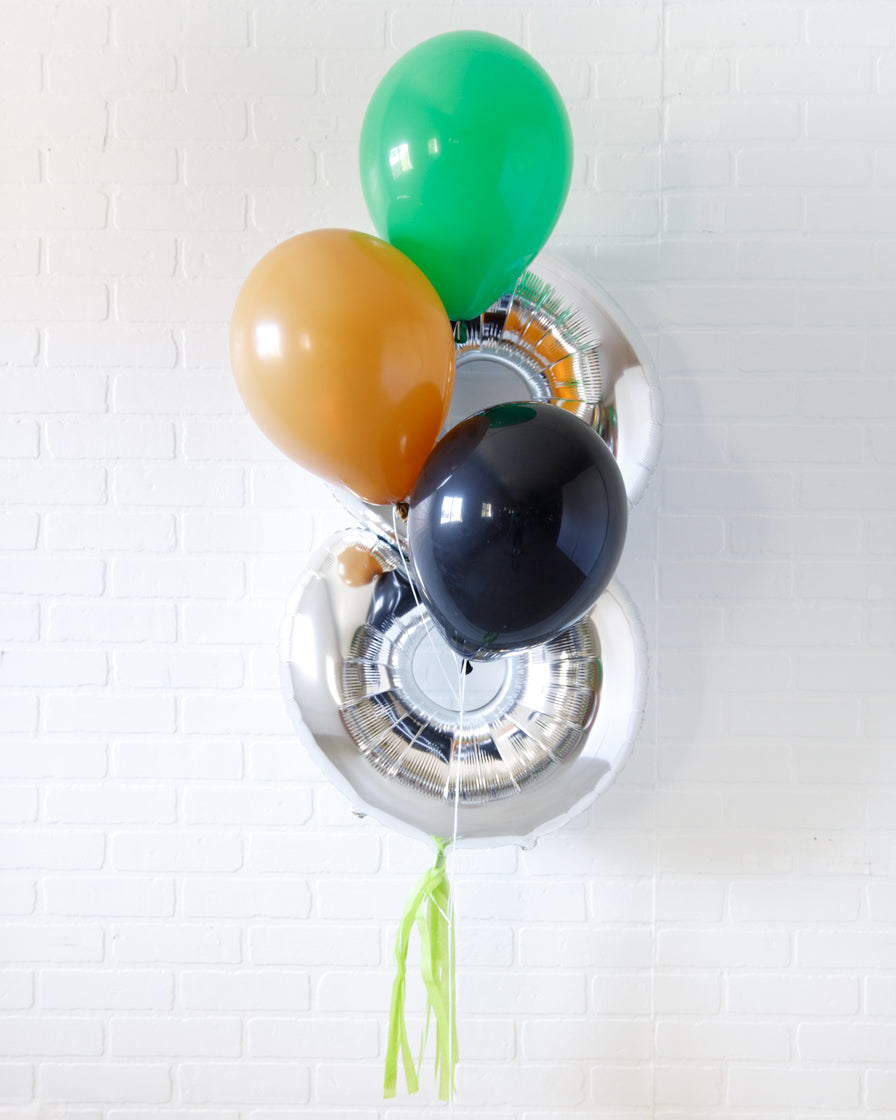 Everyone's favorite, the 34in foil number and skirt turned into a bouquet. This includes a silver number balloon and bright helium filled balloons for an effortless look. Great as decor or as photo prop.