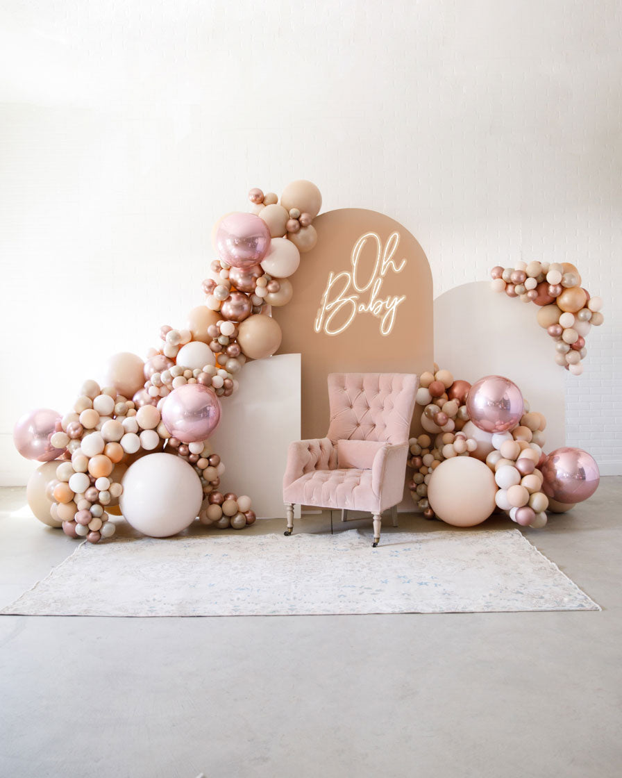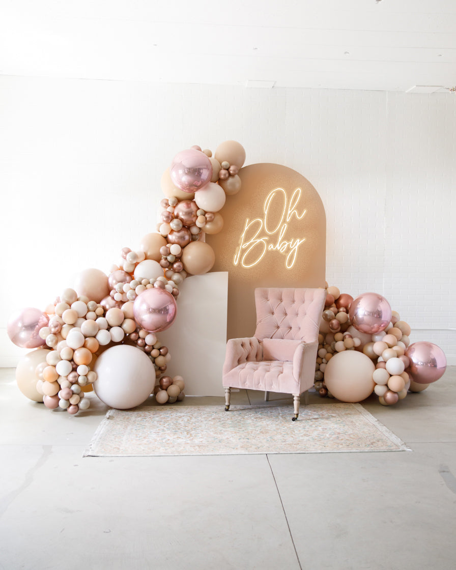Stand out in style with this panel and balloon garland design. This includes a 7ft panel backdrop with organic balloon garland to match. Add foil accents to make your photo backdrop stand out even more!