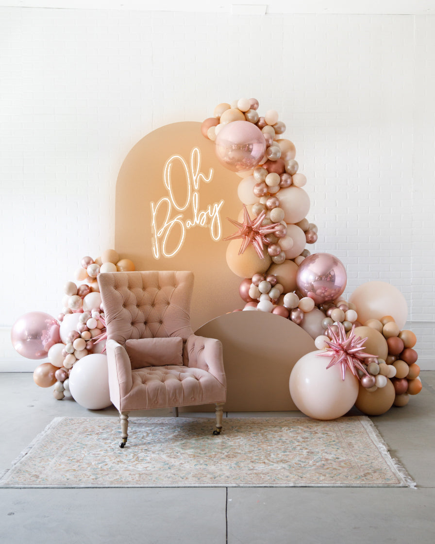 Stand out in style with this panel and balloon garland design. This includes a 7ft panel backdrop with organic balloon garland to match. Add foil accents to make your photo backdrop stand out even more!