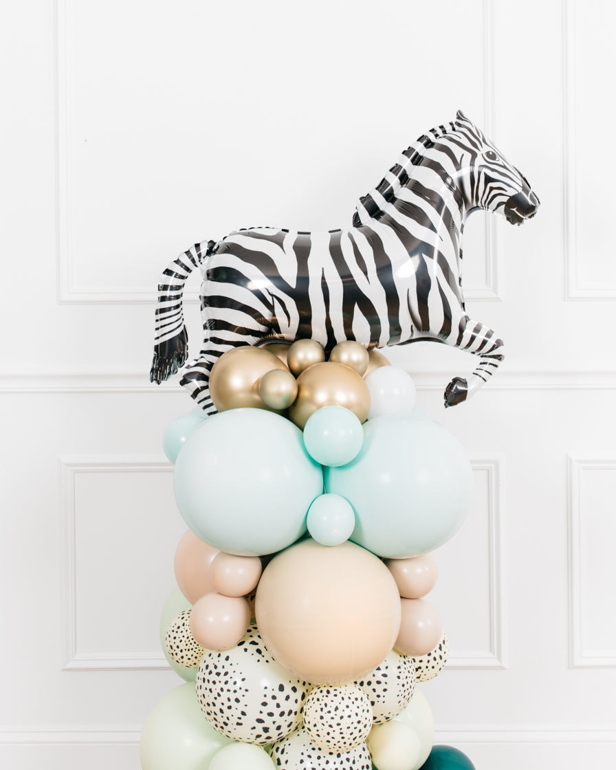 Bring your event together with a zebra balloon column. This air filled balloon column has green and gold balloons with a foil zebra balloon for a great photo op.
