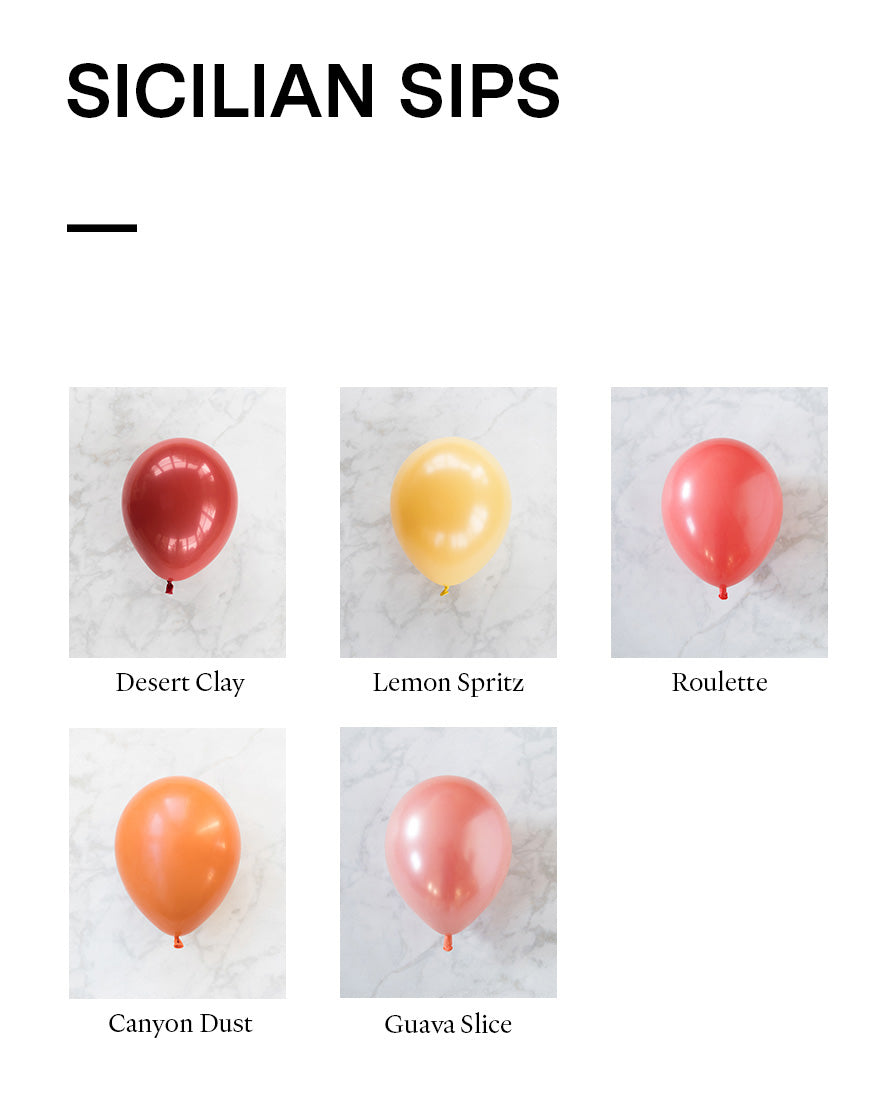 Create an elegant shower with a classic helium-filled balloon bouquet that can dress up any space. Includes 5 or 7 balloons in a a Sicilian Sips inspired palette! Perfect for events at home, restaurants, venue or party rooms.
