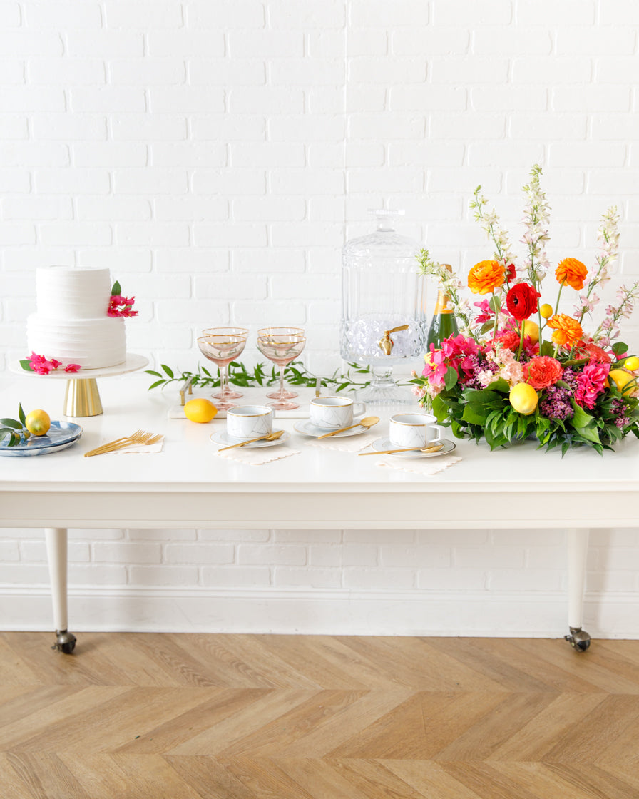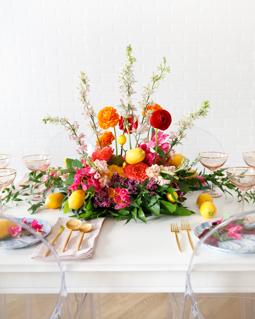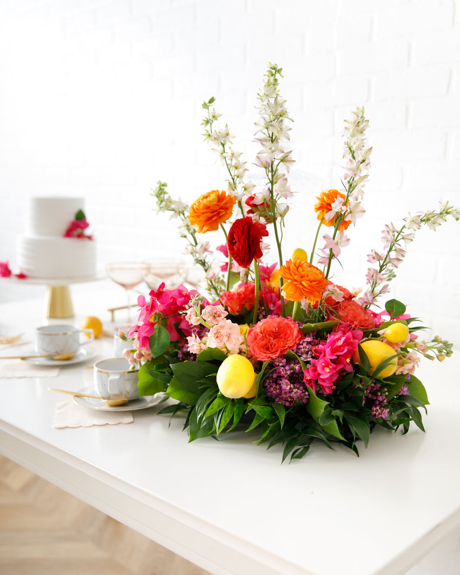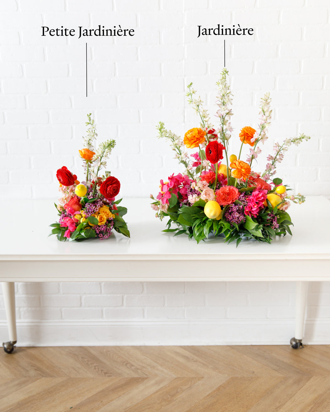 Our signature Jardinière is the ultimate floral centerpiece your celebration must have! This gorgeous arrangement in Sicilian Sips inspired shades includes garden roses, lisianthus and ranunculi that bring any table to life. This set includes two, perfect for your dining table, bar or sweets table.