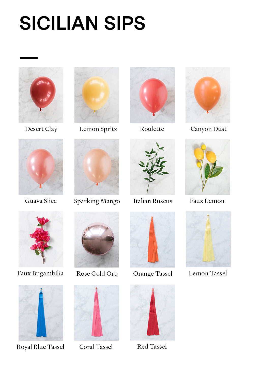 Fill your space with our Sicilian Sips themed balloon set. This includes a 7ft balloon garland with greenery, as well as a rose gold orb balloon. Add this to your space for a one of kind shower. The jumbo orb is finished in a colorful half-tassel for extra glam.