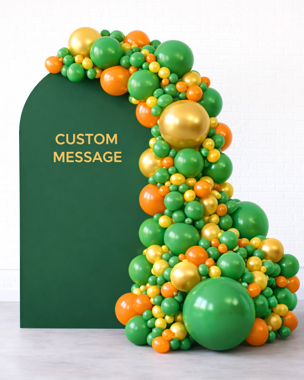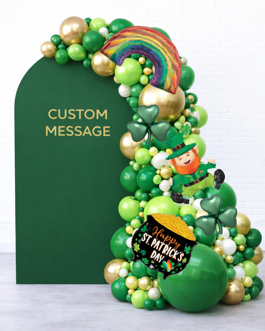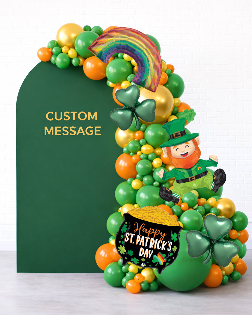 Stand out and make a statement with our St. Patrick’s Day Aadi panel and balloon garland display. Featuring a 7-foot modern backdrop paired with an organic balloon garland in vibrant tones, this eye-catching setup creates a high-impact focal point for entrances, photos, and branded moments.