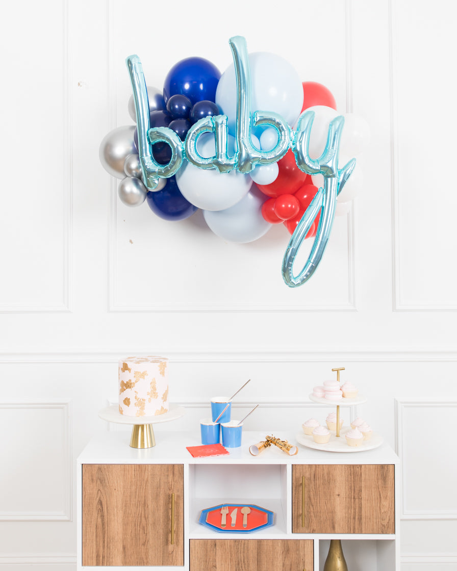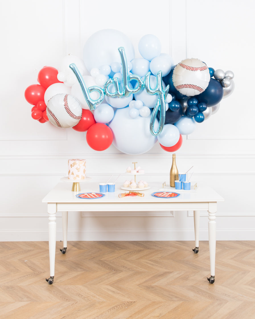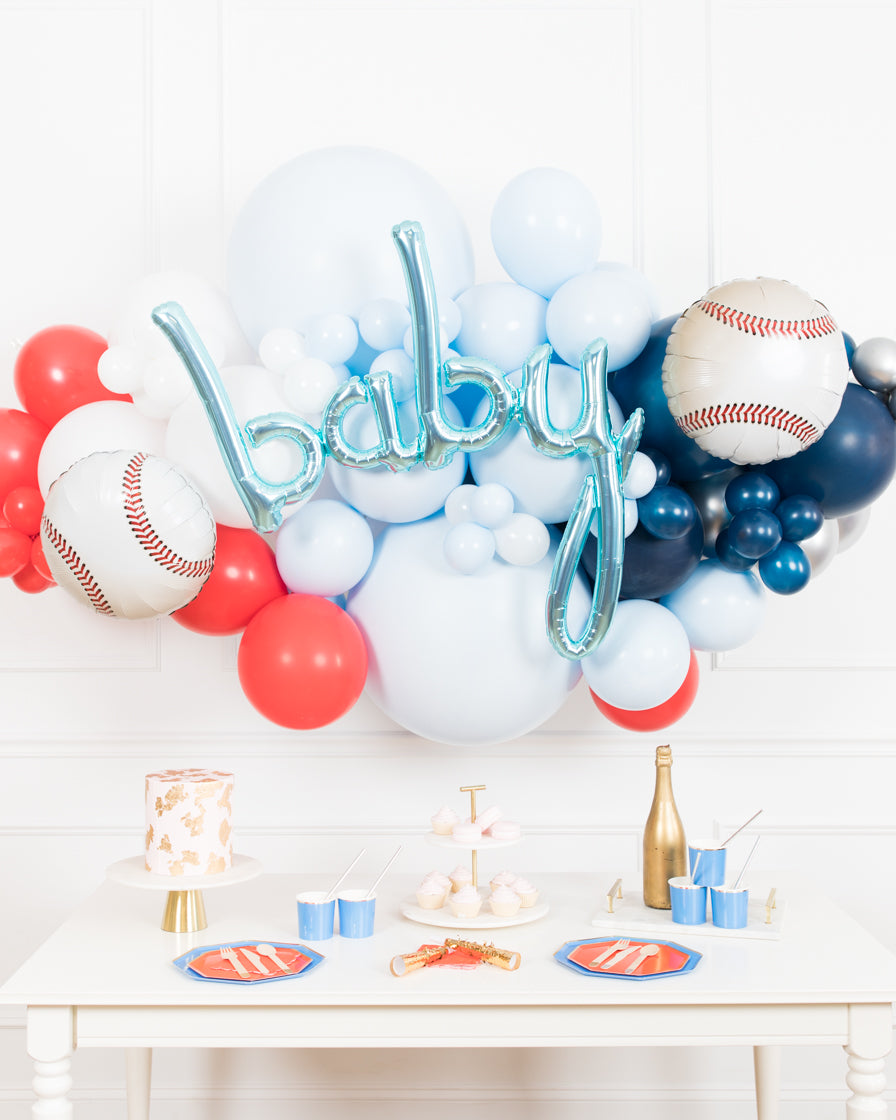 Bring some style to your baby shower with this balloon garland. This gorgeous piece is dressed with cute baseball foils and a blue baby script and can be installed above a sweets table or on a wall for a photo op.