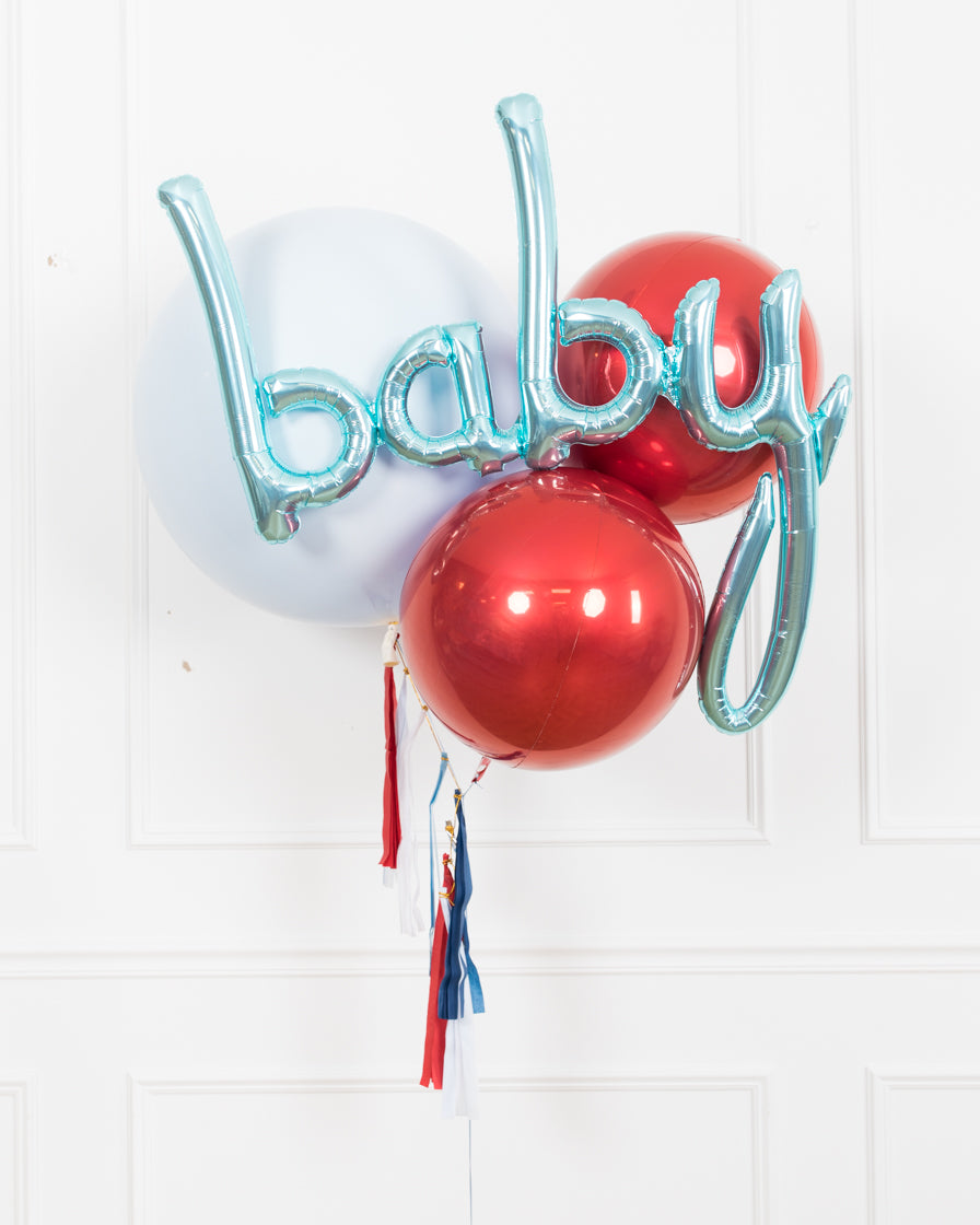 Make a statement with our baby giant balloon with orbs and blue baby script. This includes a giant light blue balloon with silver accents to create a stunning arrangement. Original and chic, place near a sweets table or photo backdrop for extra impact.
