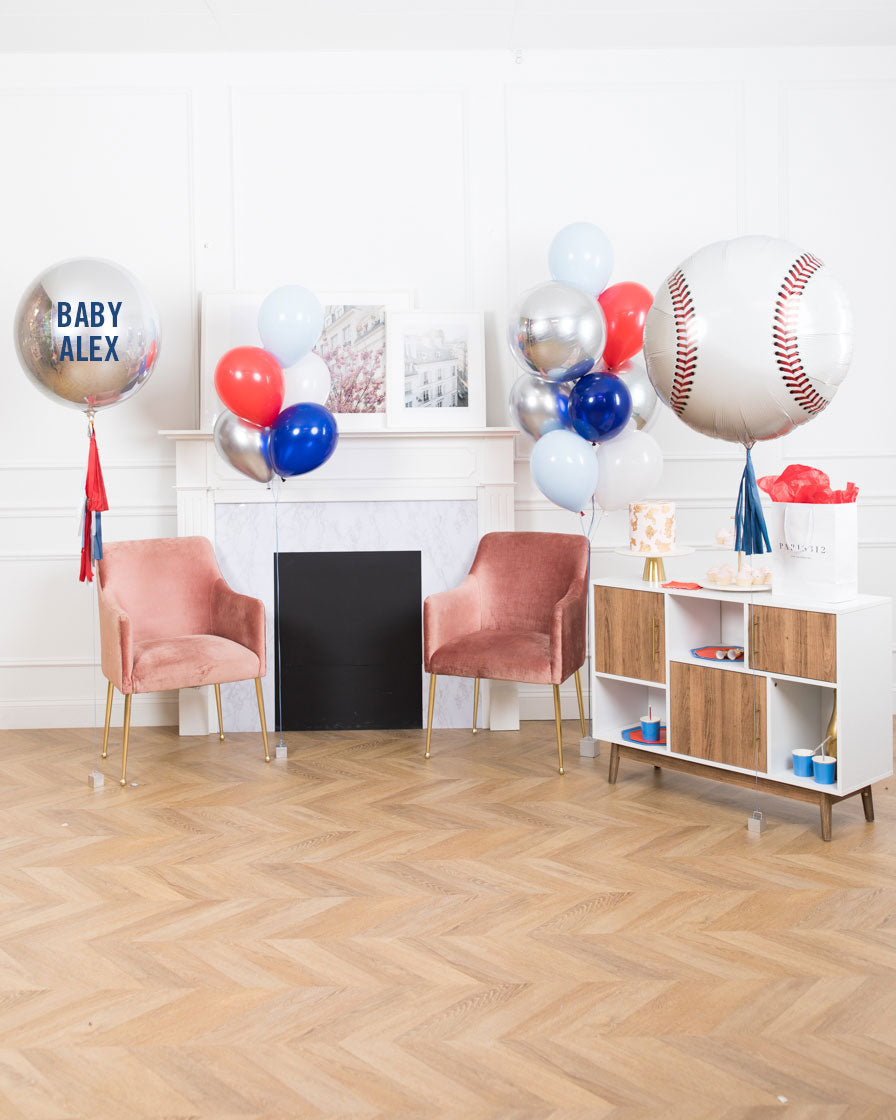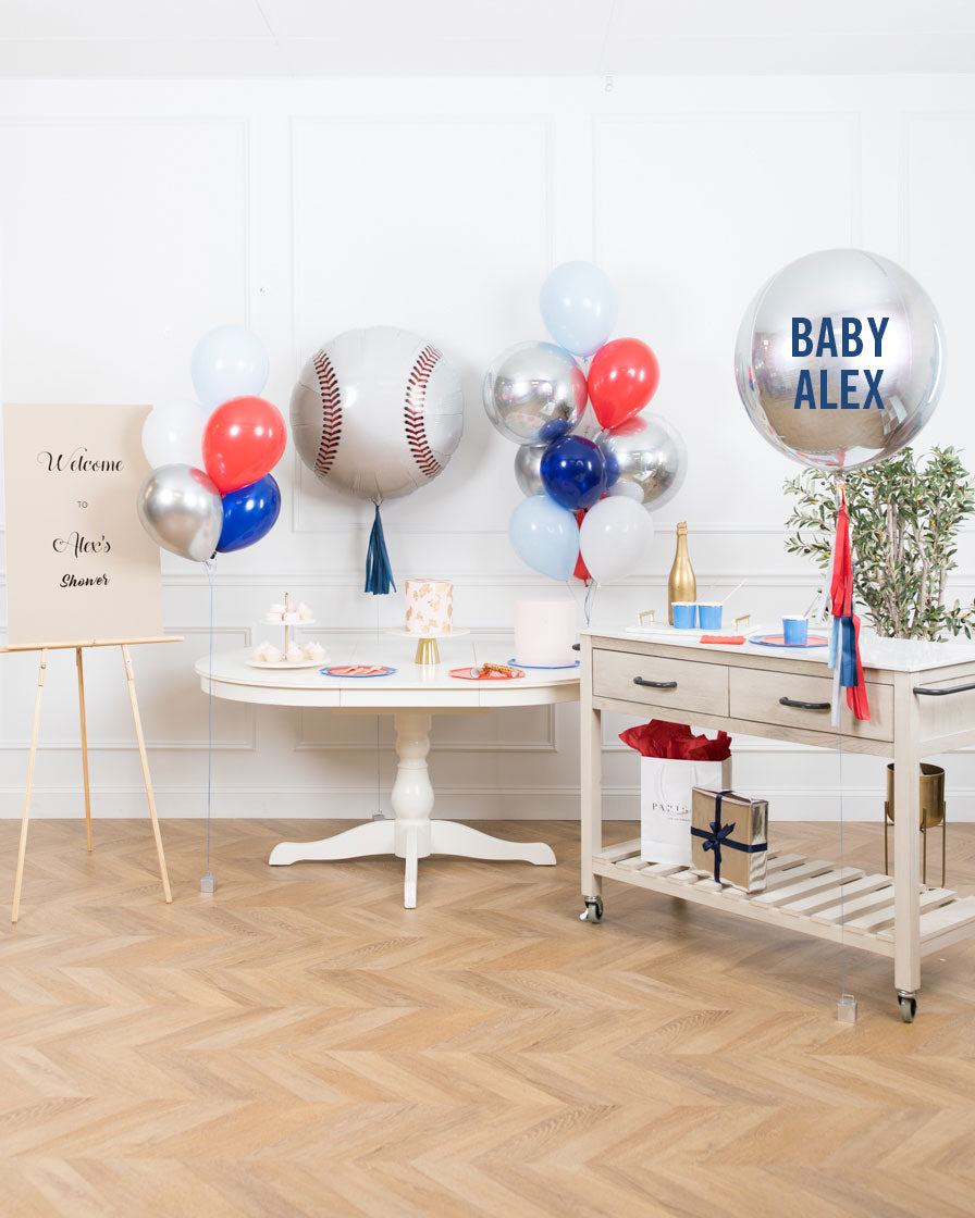 Create an extra sweet celebration with this adorable party set. This includes a baseball balloon, two balloon bouquets and a silver orb balloon with colorful tassel. Use this around the room of any space for extra fun baby shower.