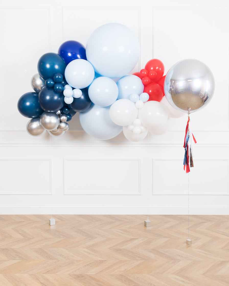 Create a beautiful celebration with this fun baseball themed set. This includes a 6ft floating balloon garland and silver orb balloon. Use this anywhere to create an instant party.