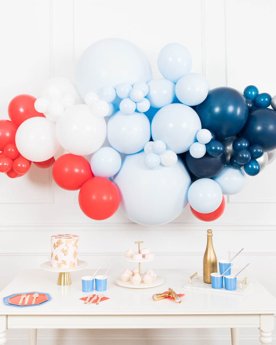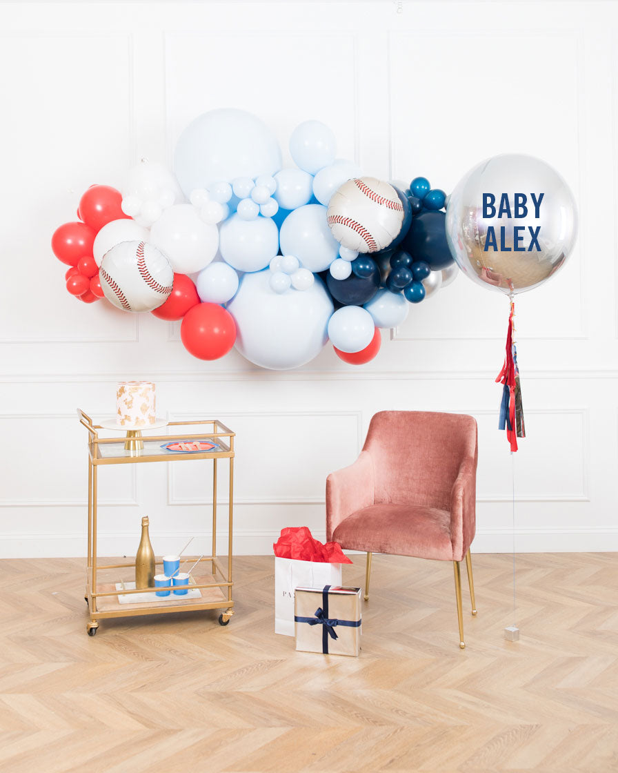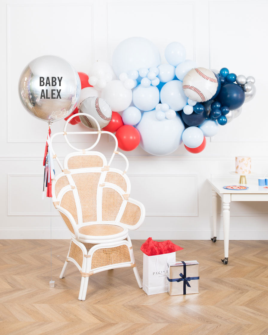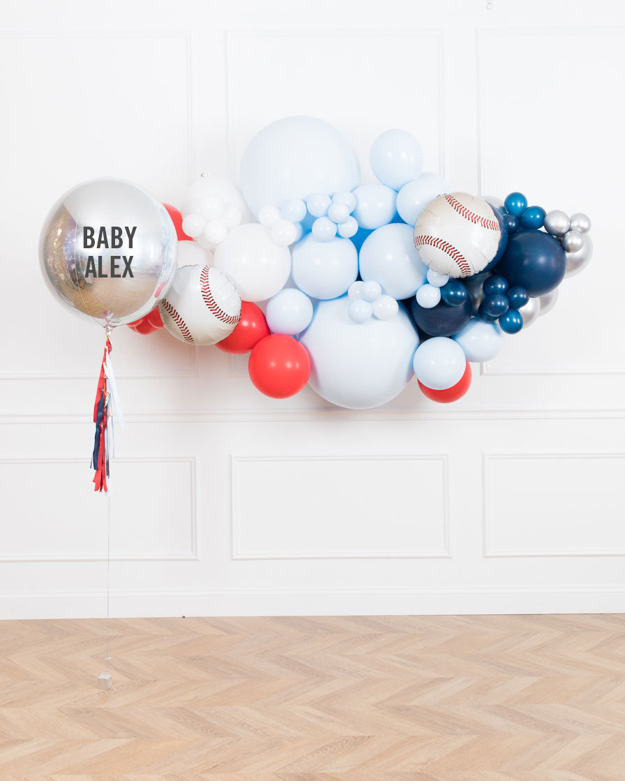 Fill your space with our baseball themed balloon set. This includes a 6ft red, white and blue balloon garland with baseball accents, as well as a silver orb balloon. Add this to your space for a one of kind baby shower.