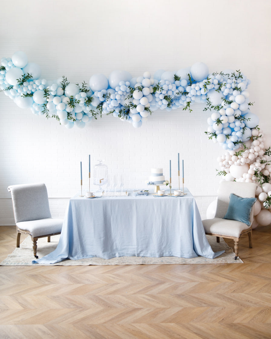 A balloon arch like no other, in stunning shades with our signature design and fresh greenery tucked in for a whimsical look, choose a size that works perfectly for your venue for a backdrop, entryway and more!