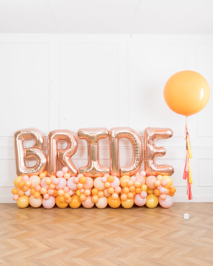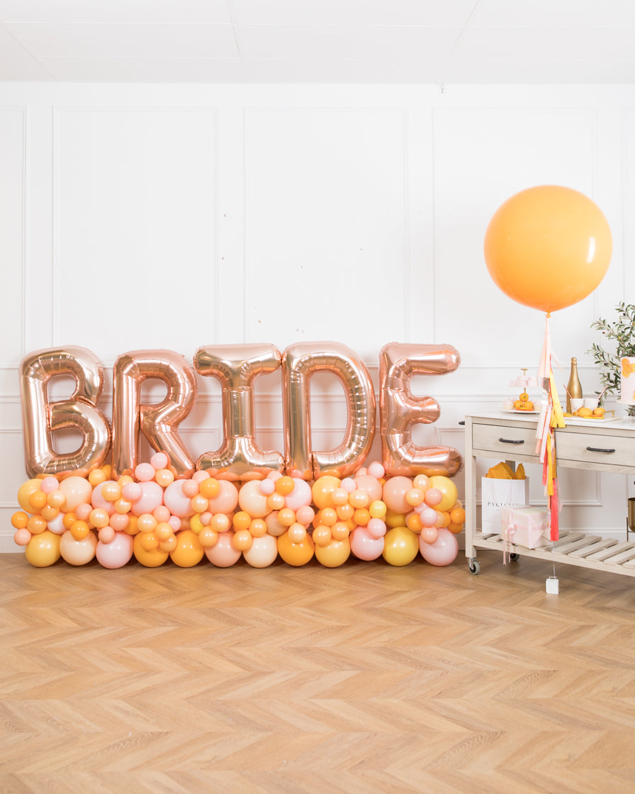 Make a bold and beautiful statement for citrus themed shower! Use this giant balloon with tassel garland and BRIDE pedestal to dress up any space! This design includes a rose gold letters and citrus inspired balloons.