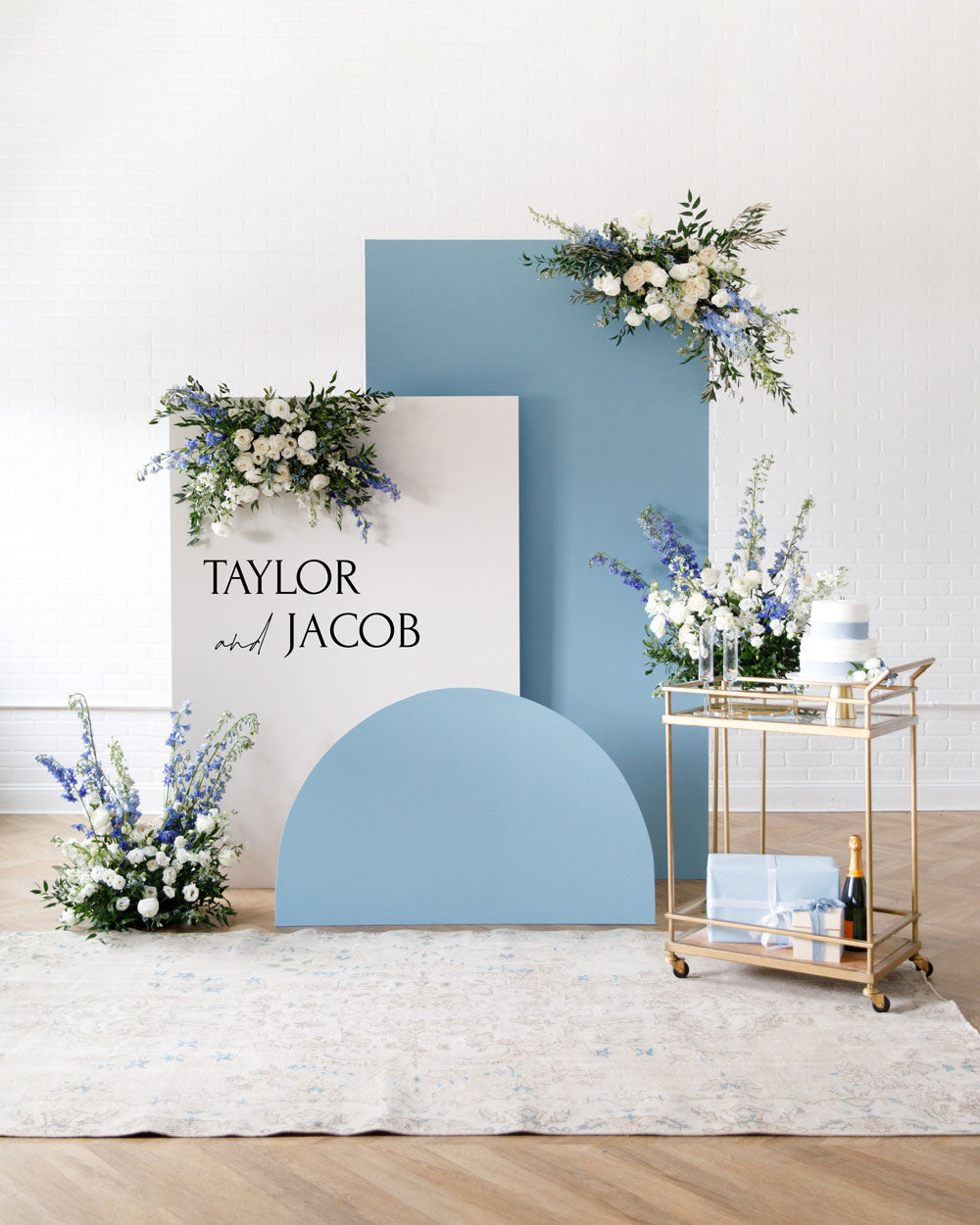Create a breathtaking moment for your bridal celebration with this panel and floral design. With unique floral centerpieces, and the option to add a balloon garland, you guest will fall in love with this unique backdrop.