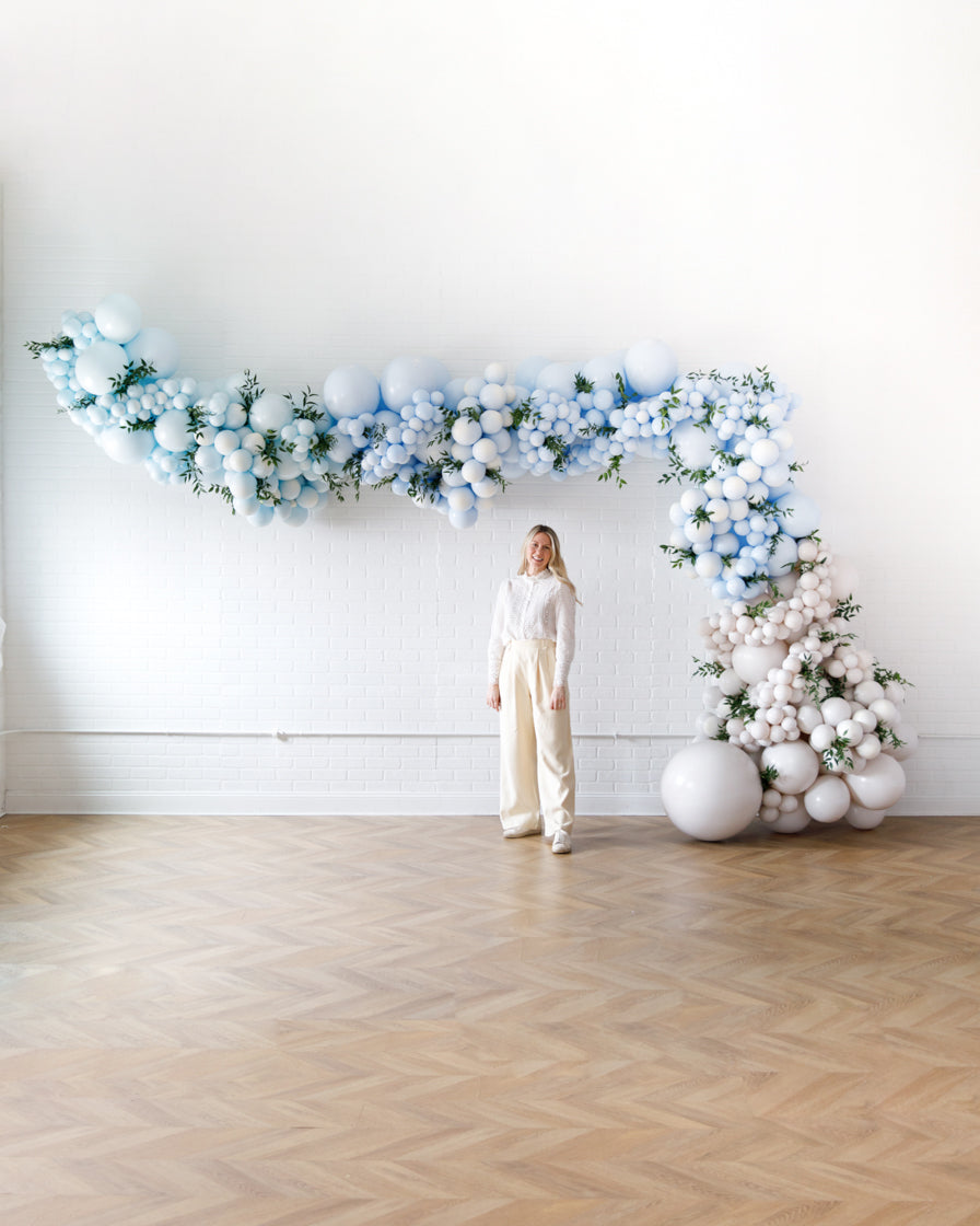 A balloon arch like no other, in stunning shades with our signature design and fresh greenery tucked in for a whimsical look, choose a size that works perfectly for your venue for a backdrop, entryway and more!