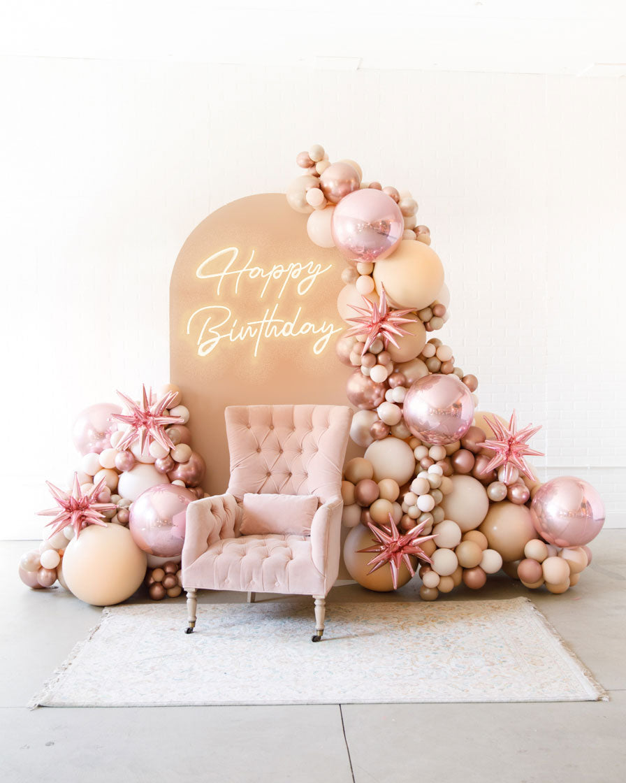 Stand out in style with this panel and balloon garland design. This includes a 7ft panel backdrop with organic balloon garland to match. Add foil accents to make your photo backdrop stand out even more!