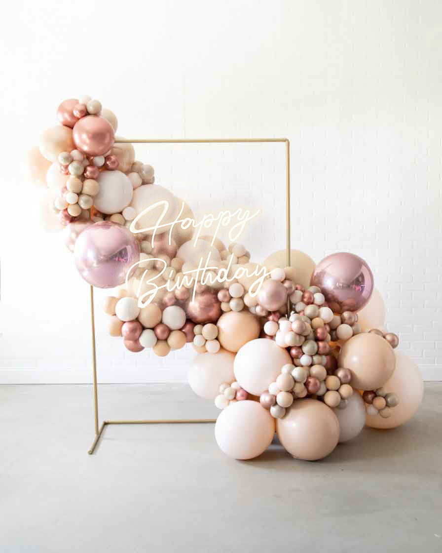 Light up your event with the ultimate backdrop! This balloon garland design includes balloons along a circular frame, as well as a beautiful neon sign to highlight your occasion in style! This works perfectly in any space and will wow your guests!