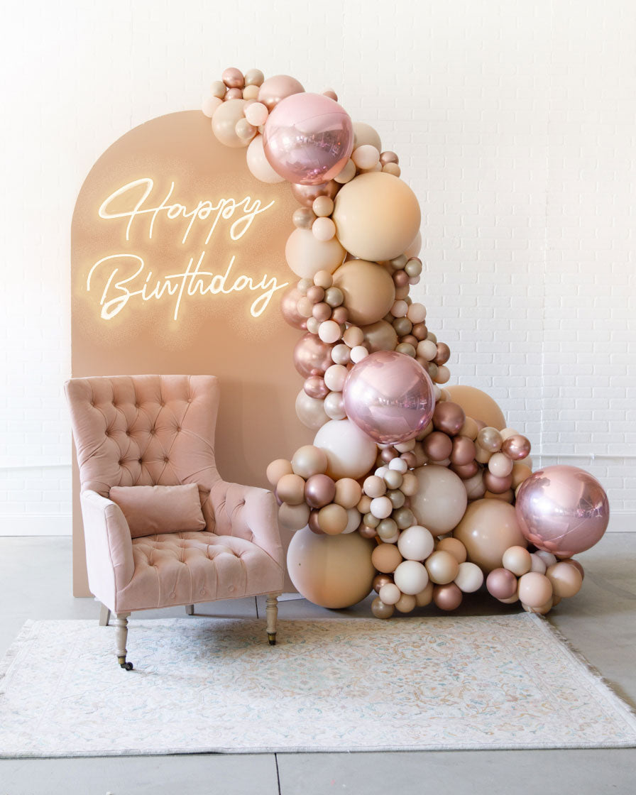 Stand out in style with this panel and balloon garland design. This includes a 7ft panel backdrop with organic balloon garland to match. Add foil accents to make your photo backdrop stand out even more!