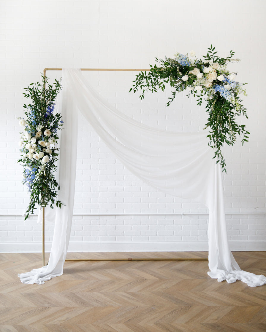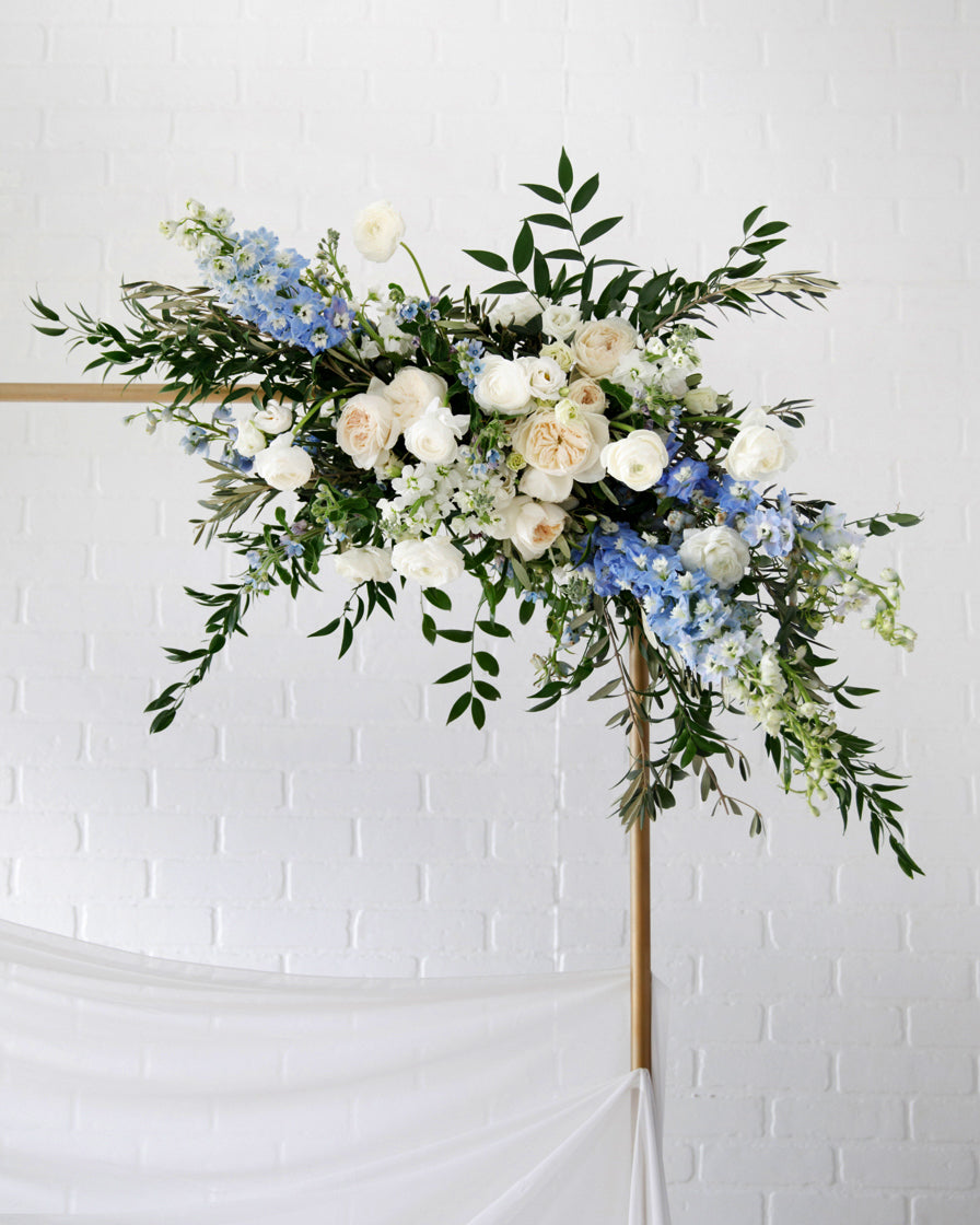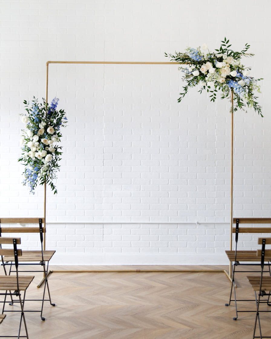 Elevate your event with this frame and floral pair. With our signature gold frame and two statement making floral arrangements, this works perfect for a photo backdrops, gift opening, or an entryway.