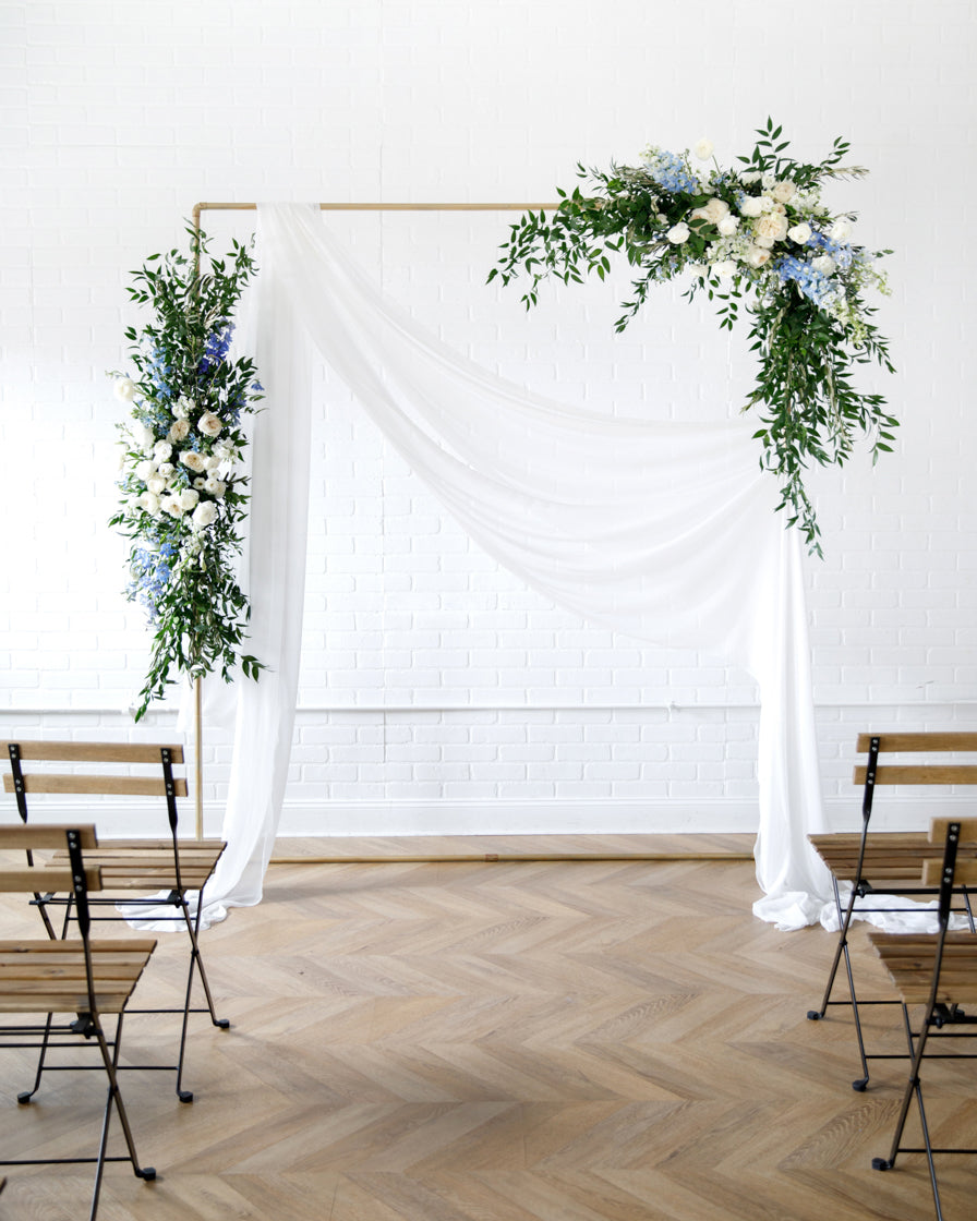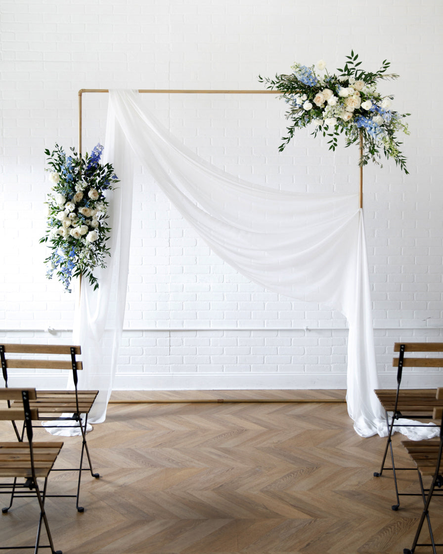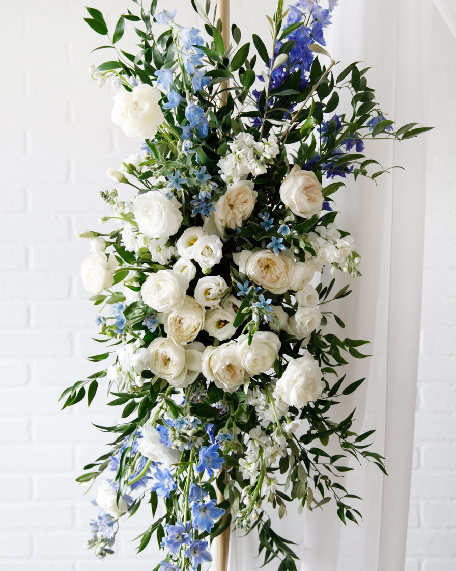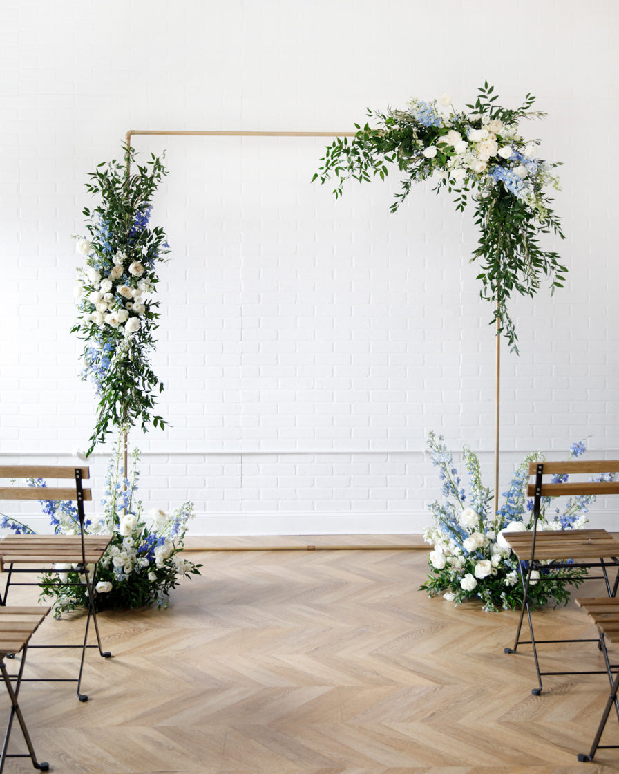 Elevate your event with this frame and floral pair. With our signature gold frame and two statement making floral arrangements, this works perfect for a photo backdrops, gift opening, or an entryway.