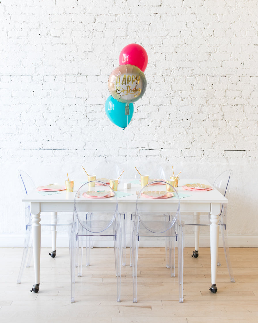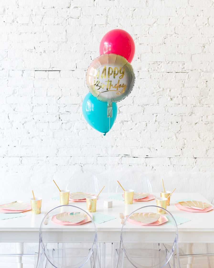 This balloon centerpiece adds a fun touch to your tablescape. Place on dinner table, dessert table, cocktail table or bar cart.