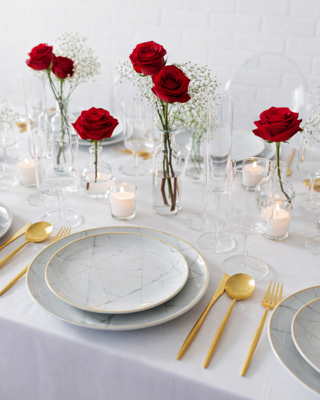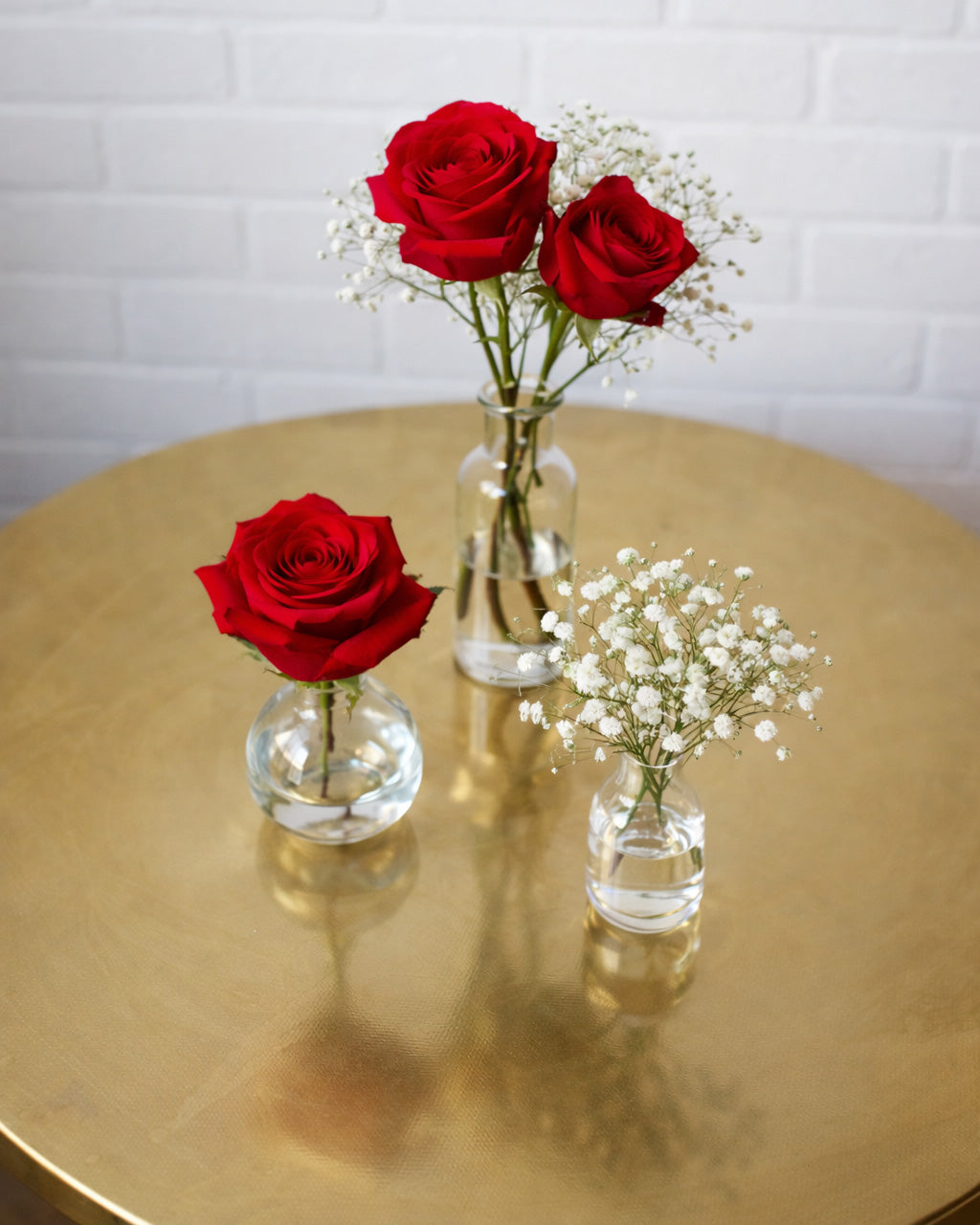 Our minimalist bud vase sets featuring red roses and baby's breath. Personalize your decor by adding our gold candlesticks or votive candles for an elegant touch that complements any setting.