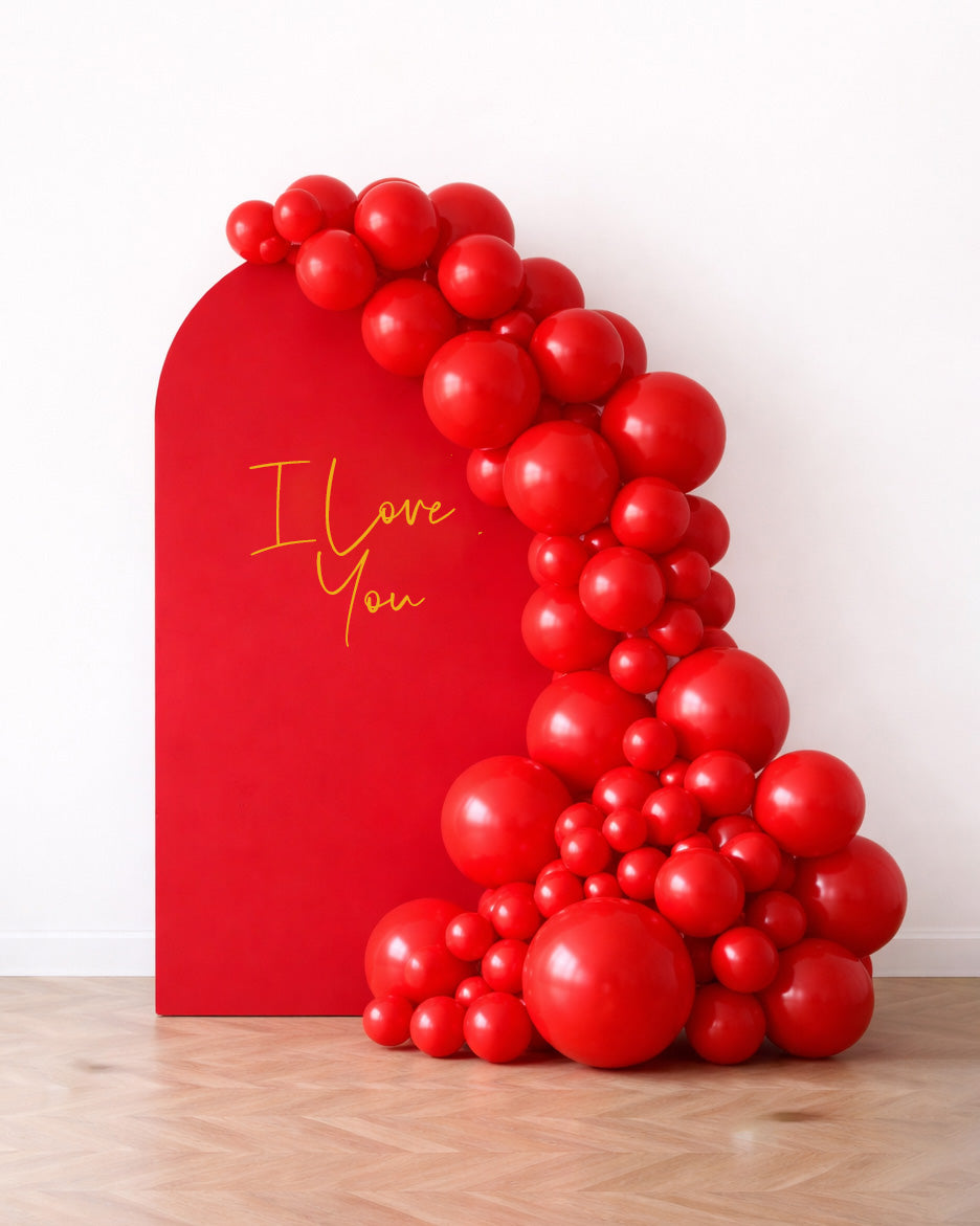 Make a bold romantic statement with this Valentine’s-ready panel and balloon garland design. Featuring a 7ft statement panel backdrop paired with a lush organic balloon garland, this setup instantly transforms any space into a love-filled moment.