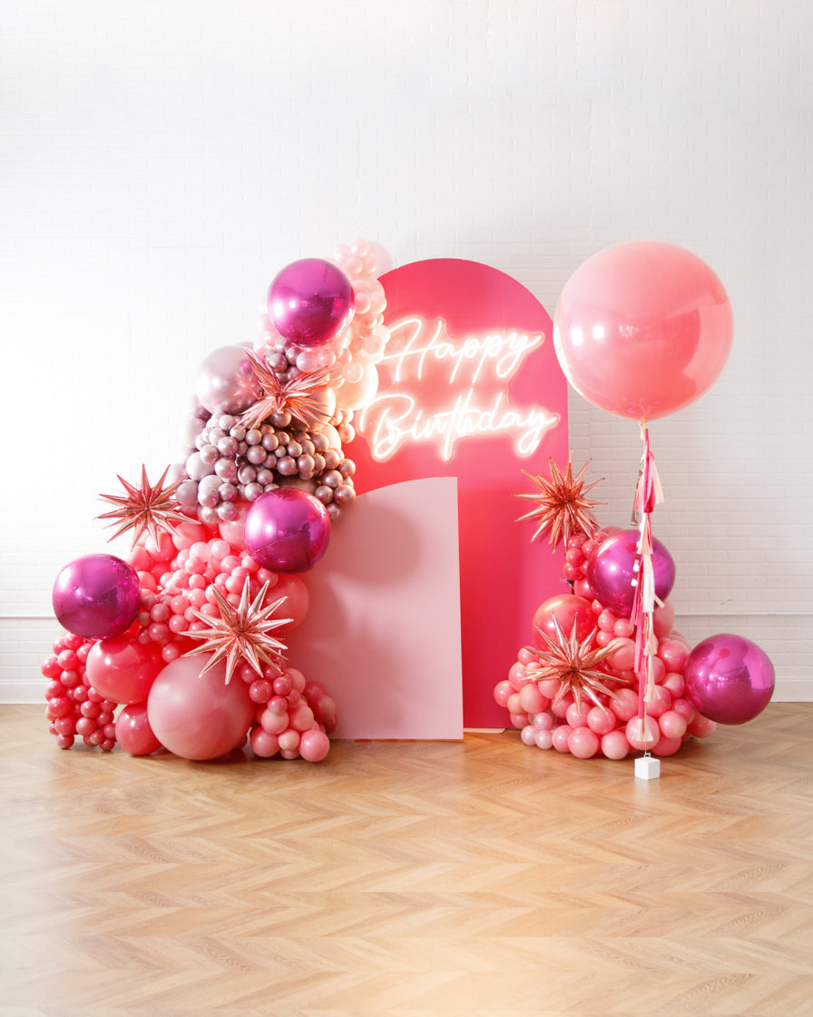 Wow your guests with this sophisticated and stylish backdrop for your teen's birthday! With two panels, a balloon garland, and giant balloon, this will be the ultimate backdrop. Our happy birthday neon sign will help light up the whole look for a Barbie themed birthday!