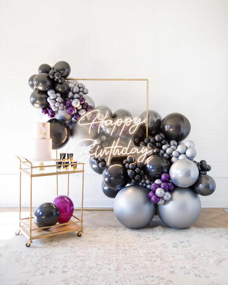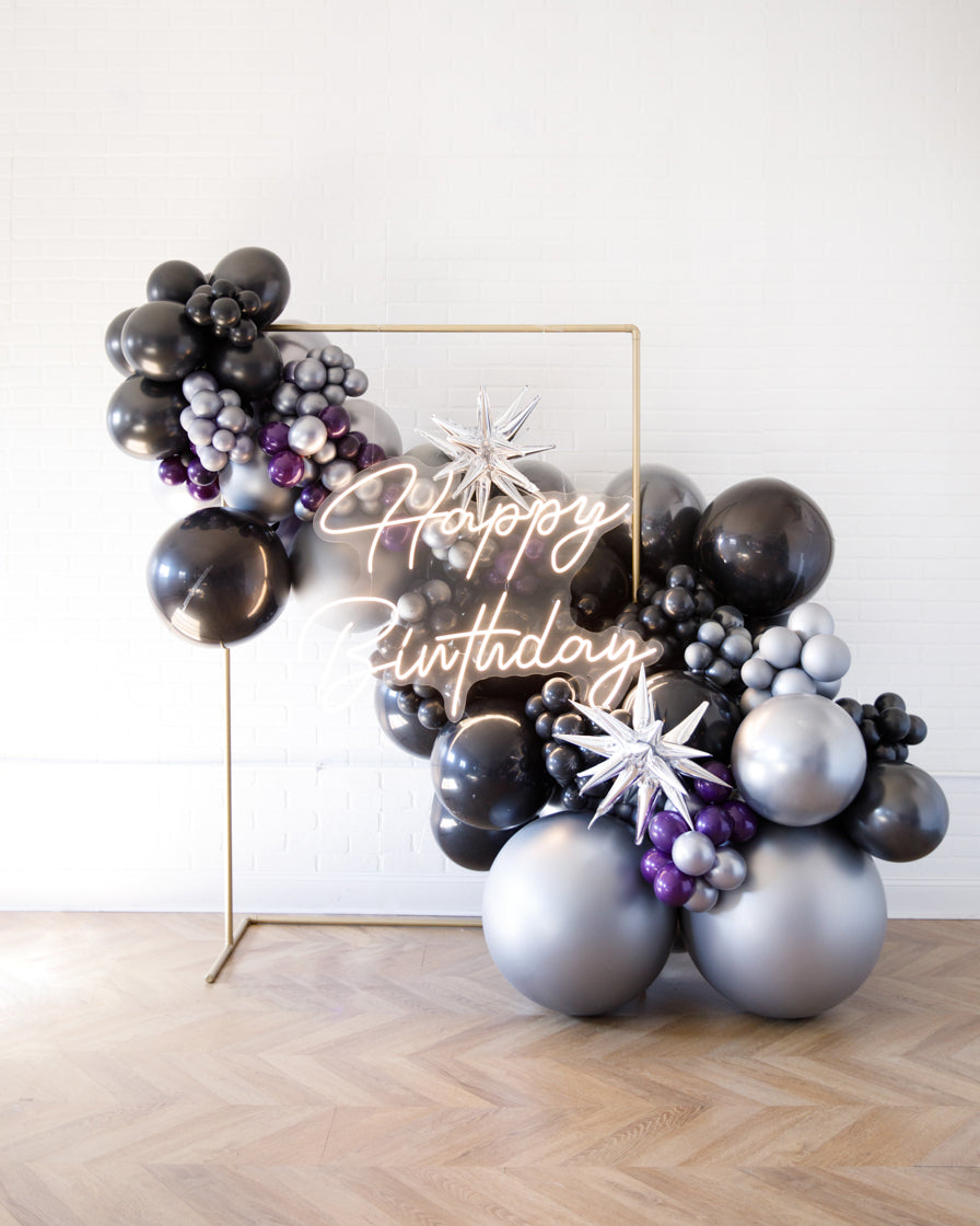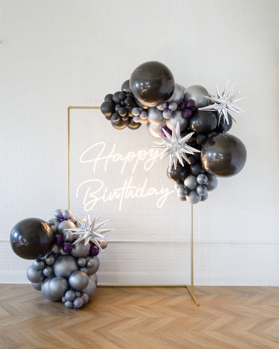 Light up your event with this neon sign, frame and balloon garland set! This picture perfect backdrop includes our neon sign, and an overflowing balloon garland draped around our small gold frame that creates a beautiful backdrop.