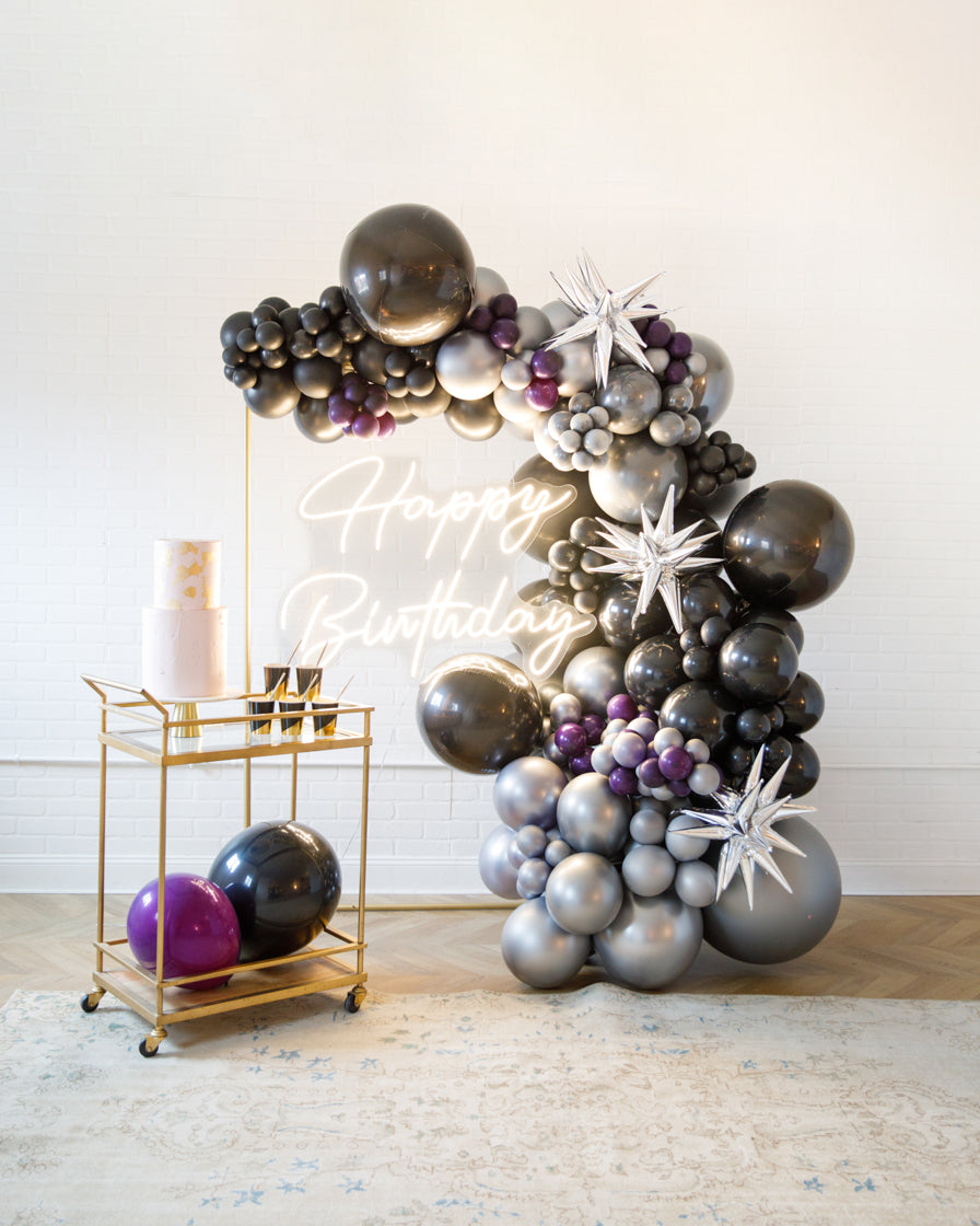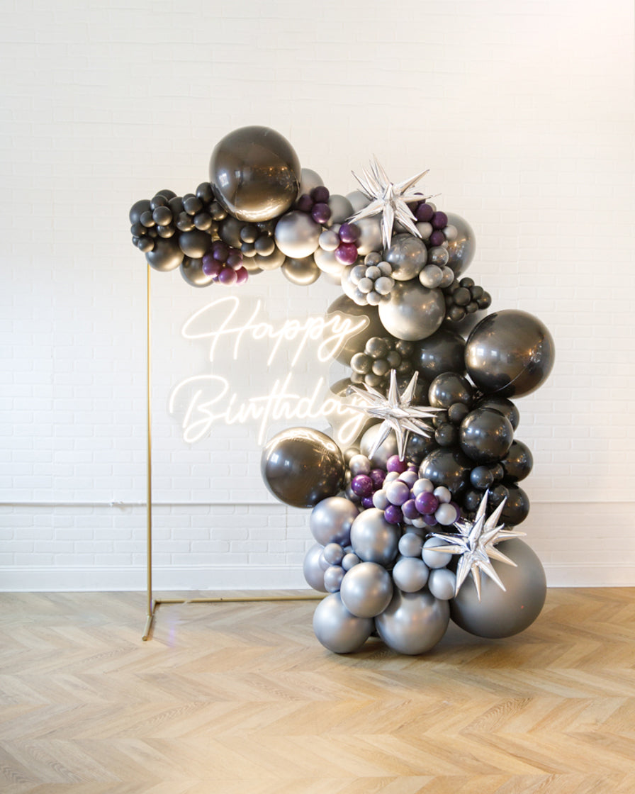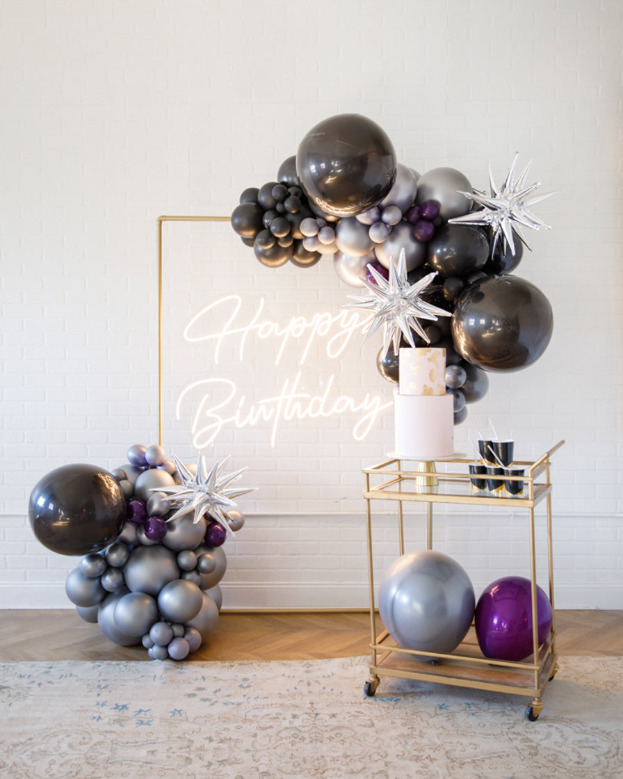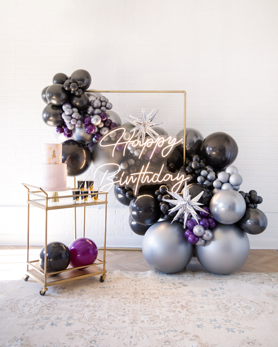 Light up your event with this neon sign, frame and balloon garland set! This picture perfect backdrop includes our neon sign, and an overflowing balloon garland draped around our small gold frame that creates a beautiful backdrop.