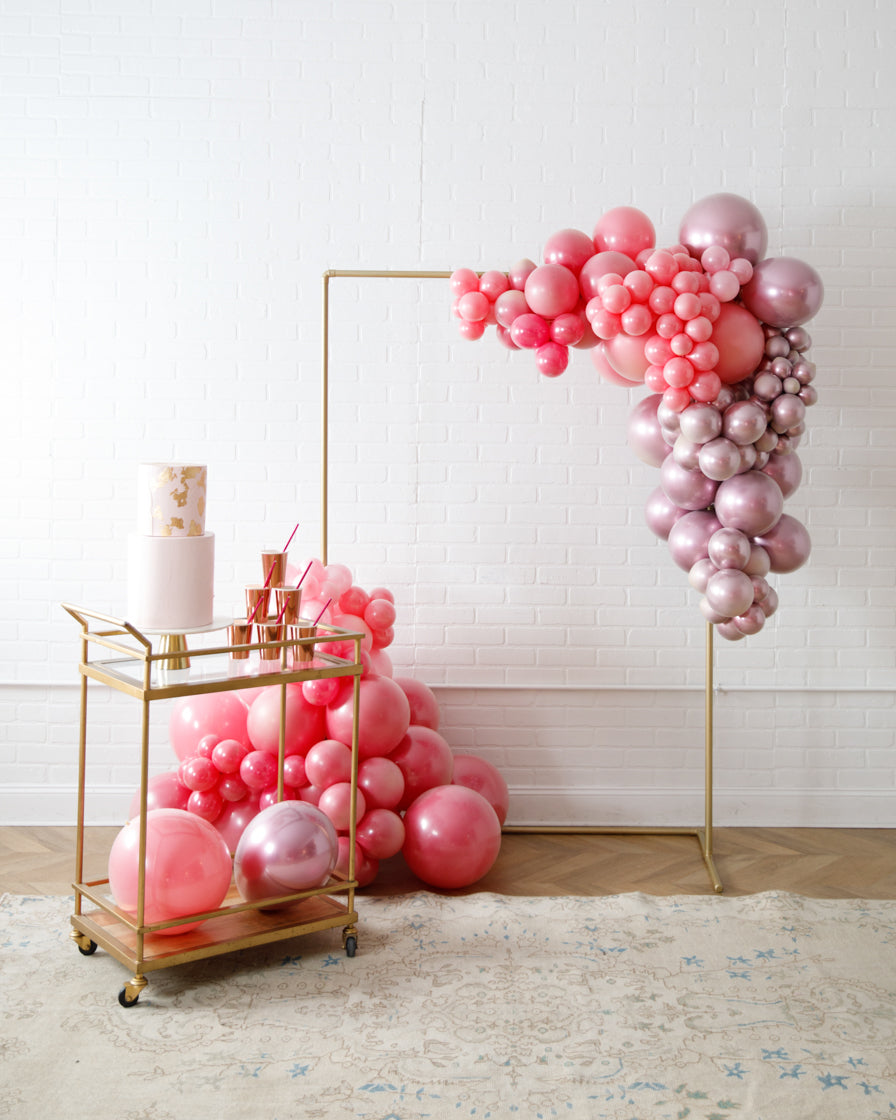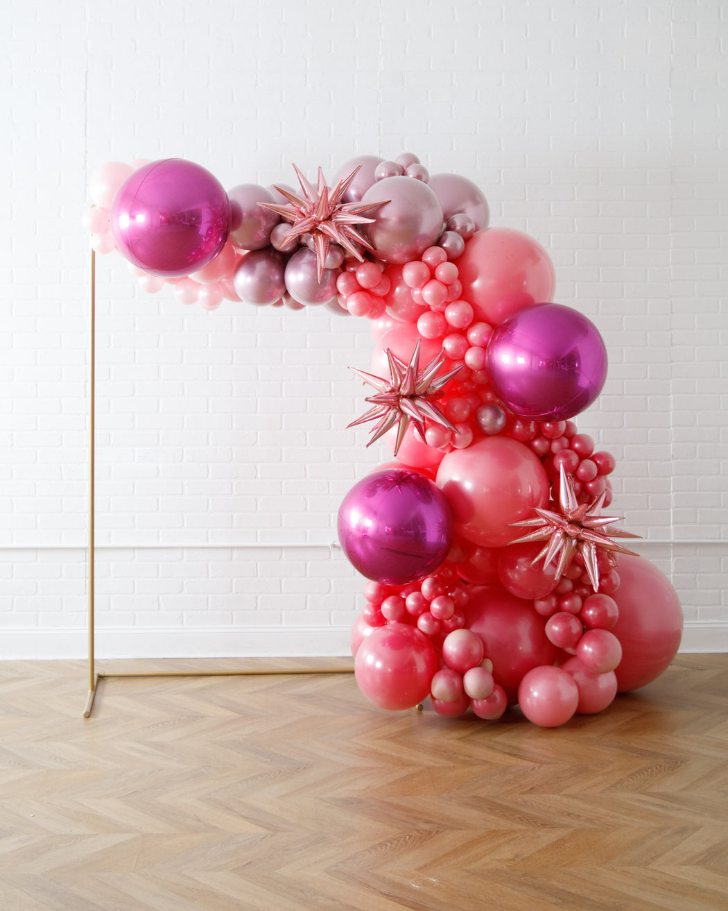 Instantly transform your event with our small frame and balloon garland design! This organic garland drapes around our signature gold frame for a one of a kind look! Bring even more glam to the look with foil accents.