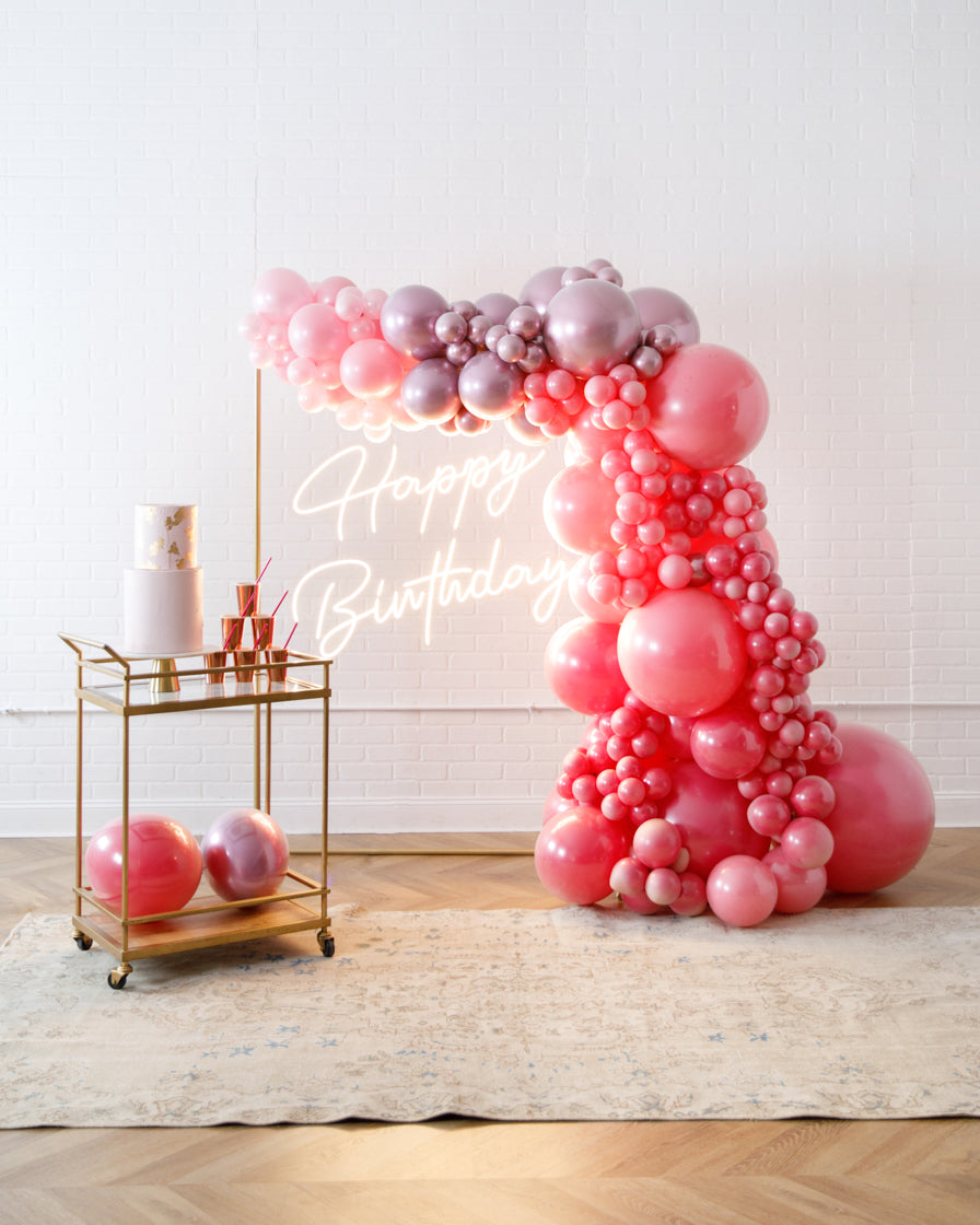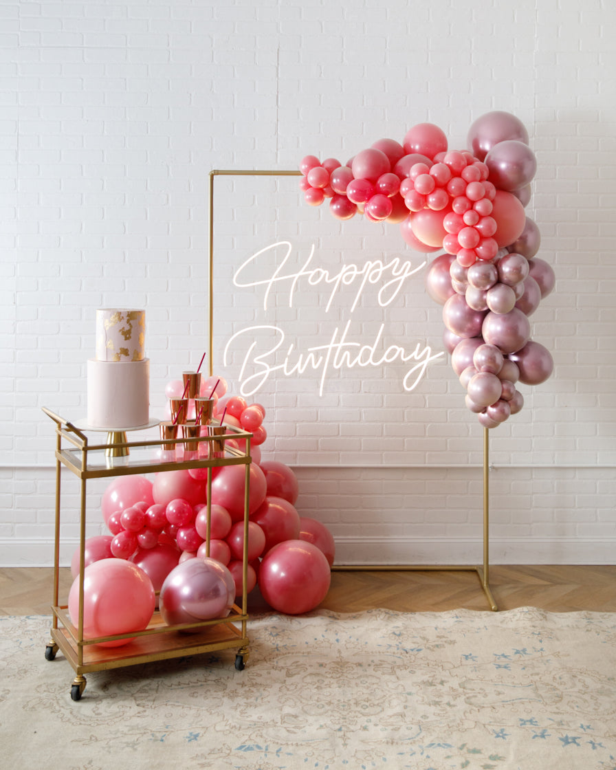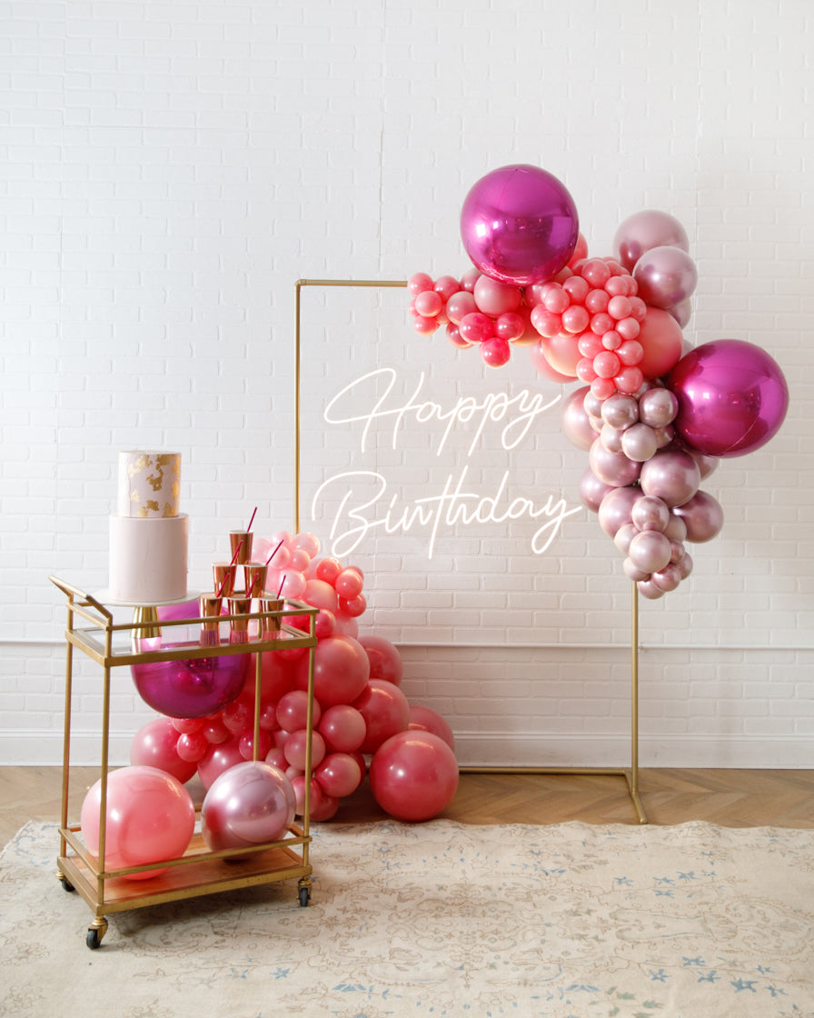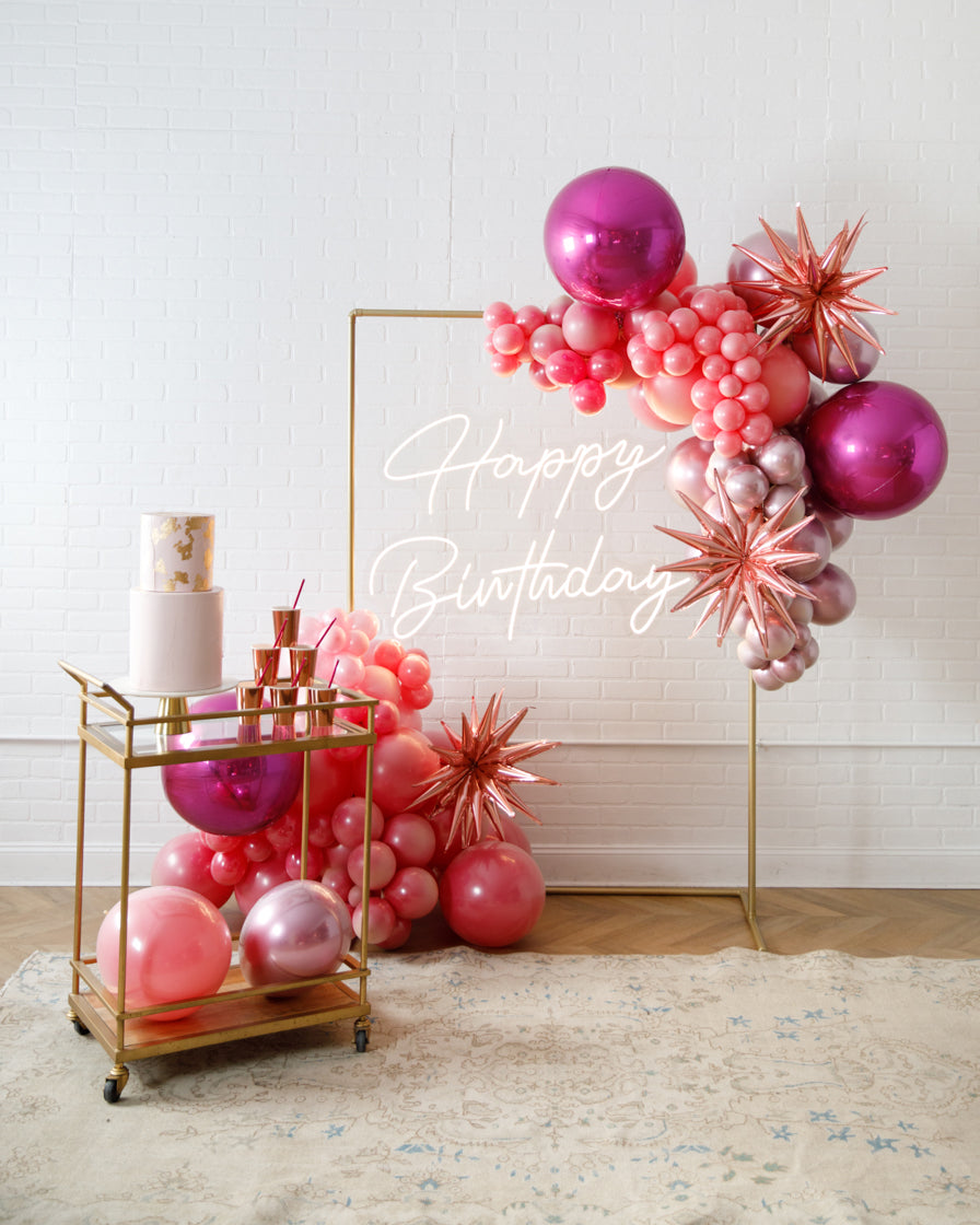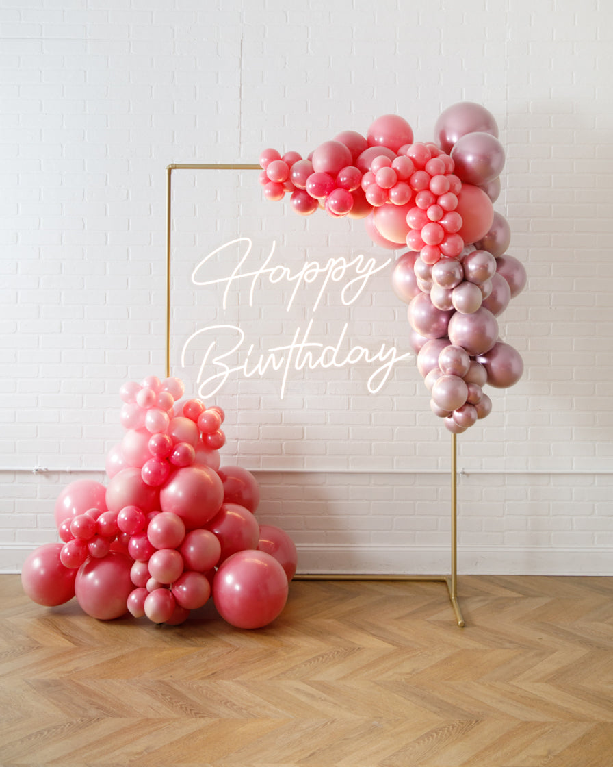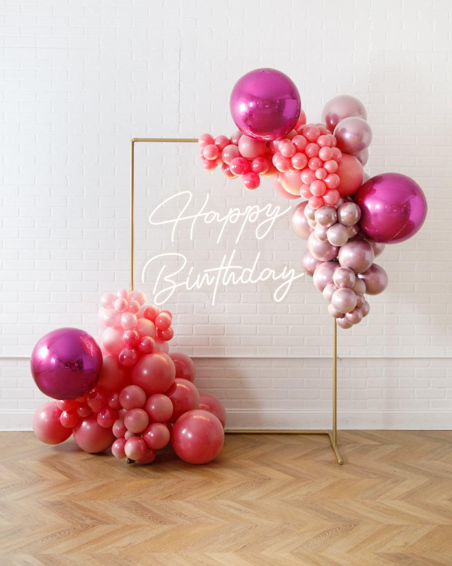 Light up your event with this neon sign, frame and balloon garland set! This picture perfect backdrop includes our neon sign, and an overflowing balloon garland draped around our small gold frame that creates a beautiful backdrop.