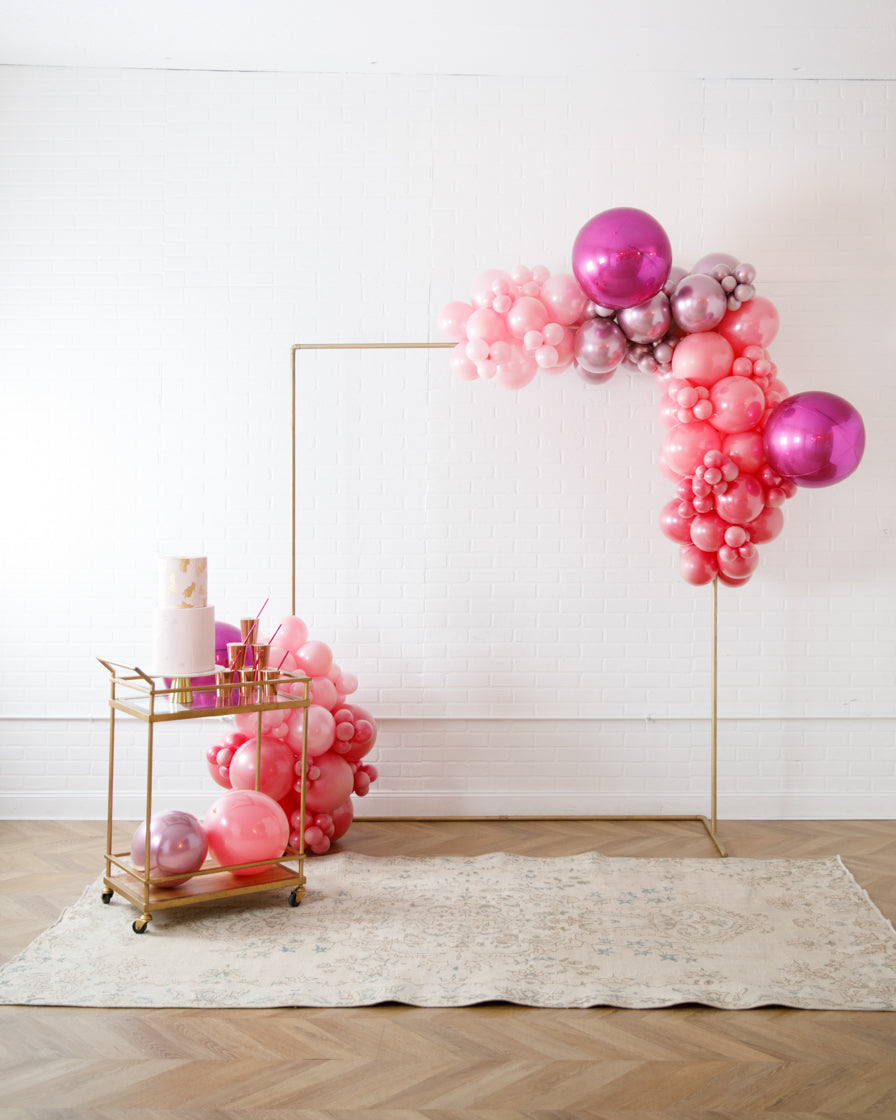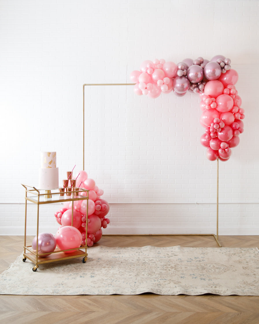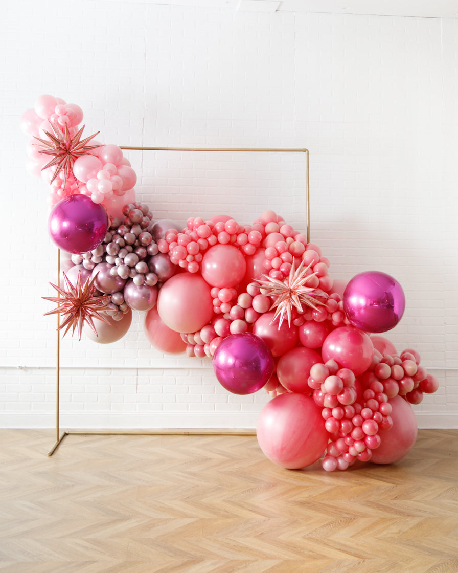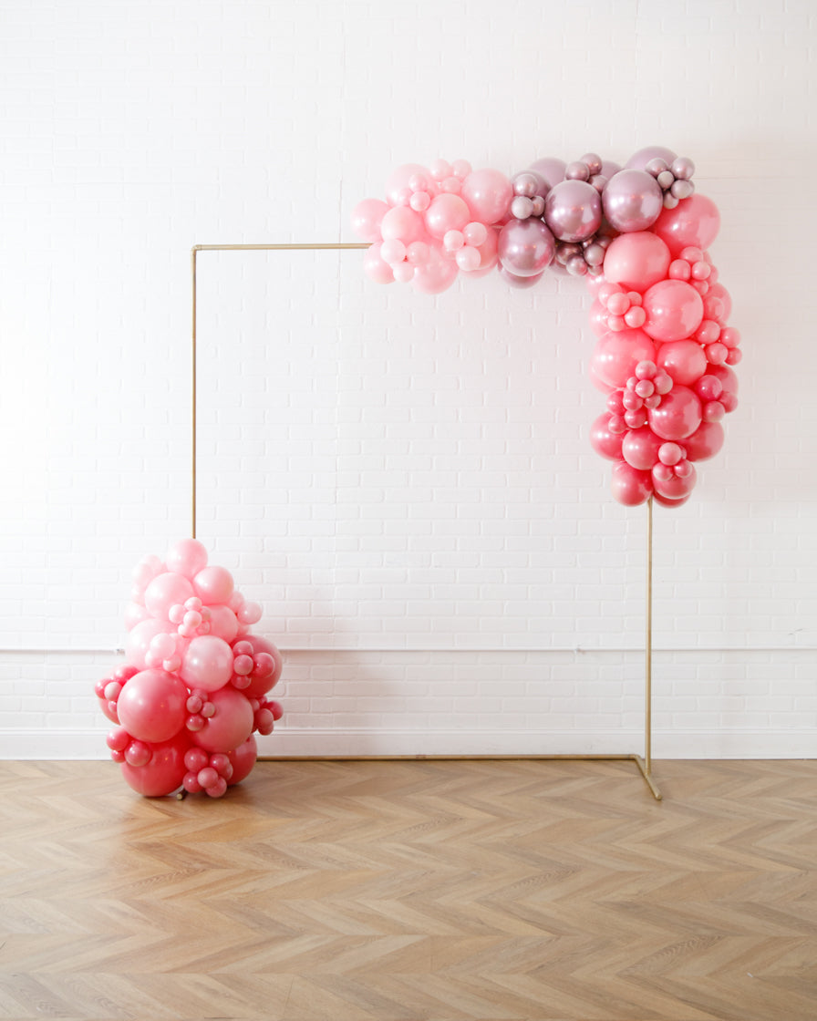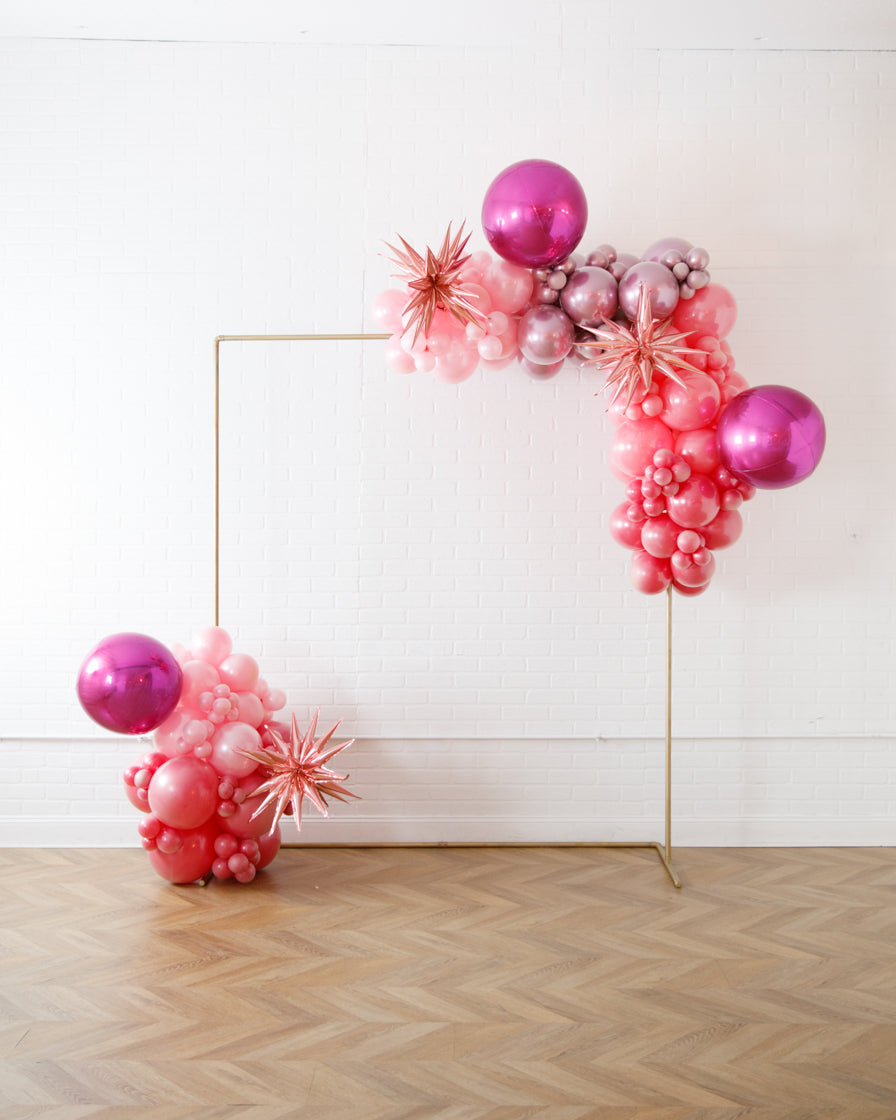 Celebrate boldly with our signature gold frame and diagonal organic garland design! This includes a full balloon garland cascading across the frame, perfect for photos. With added foils, it's an even grander affair!