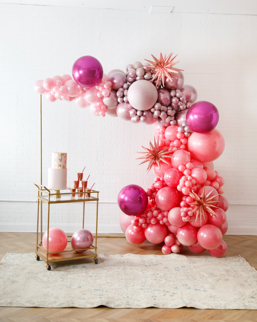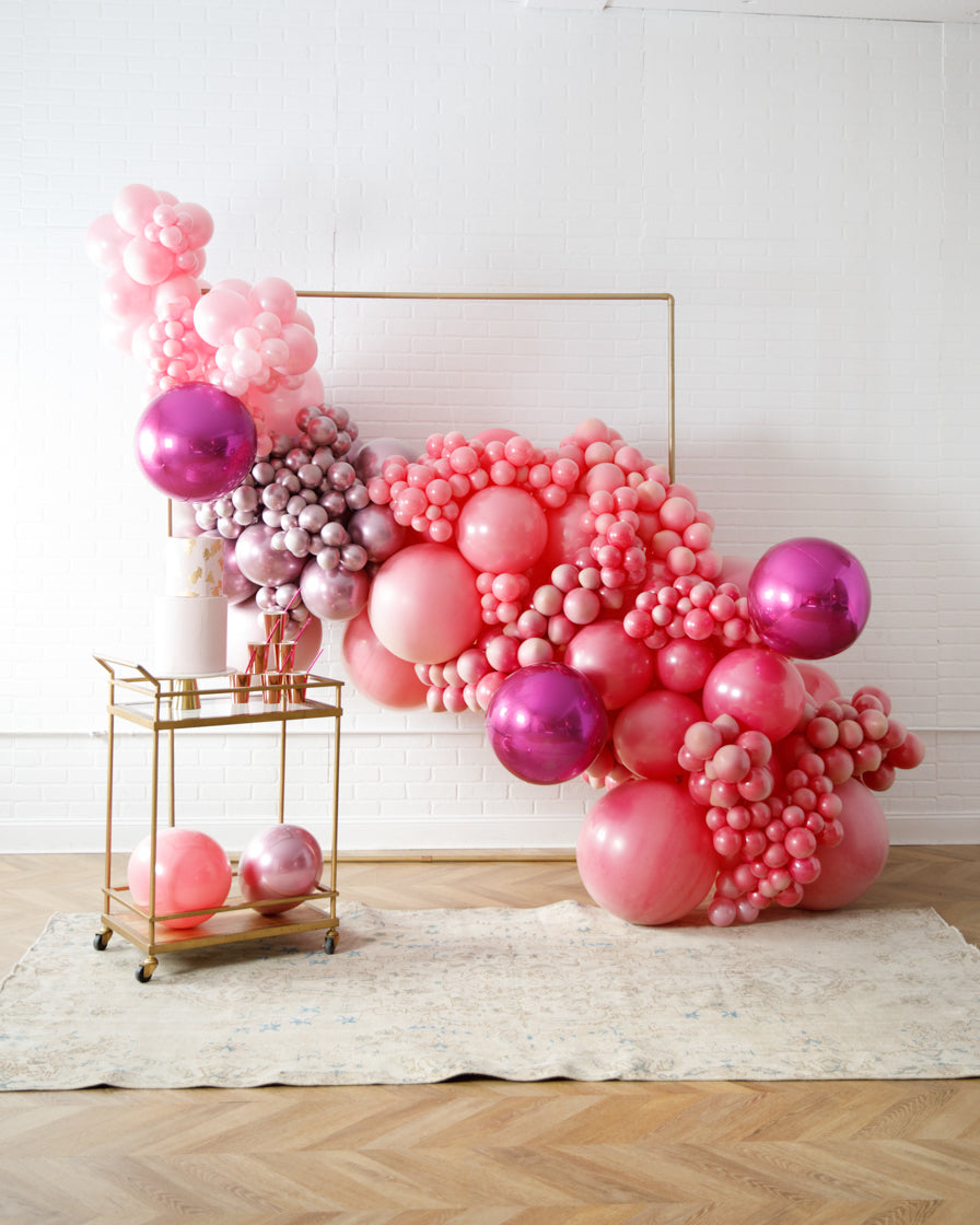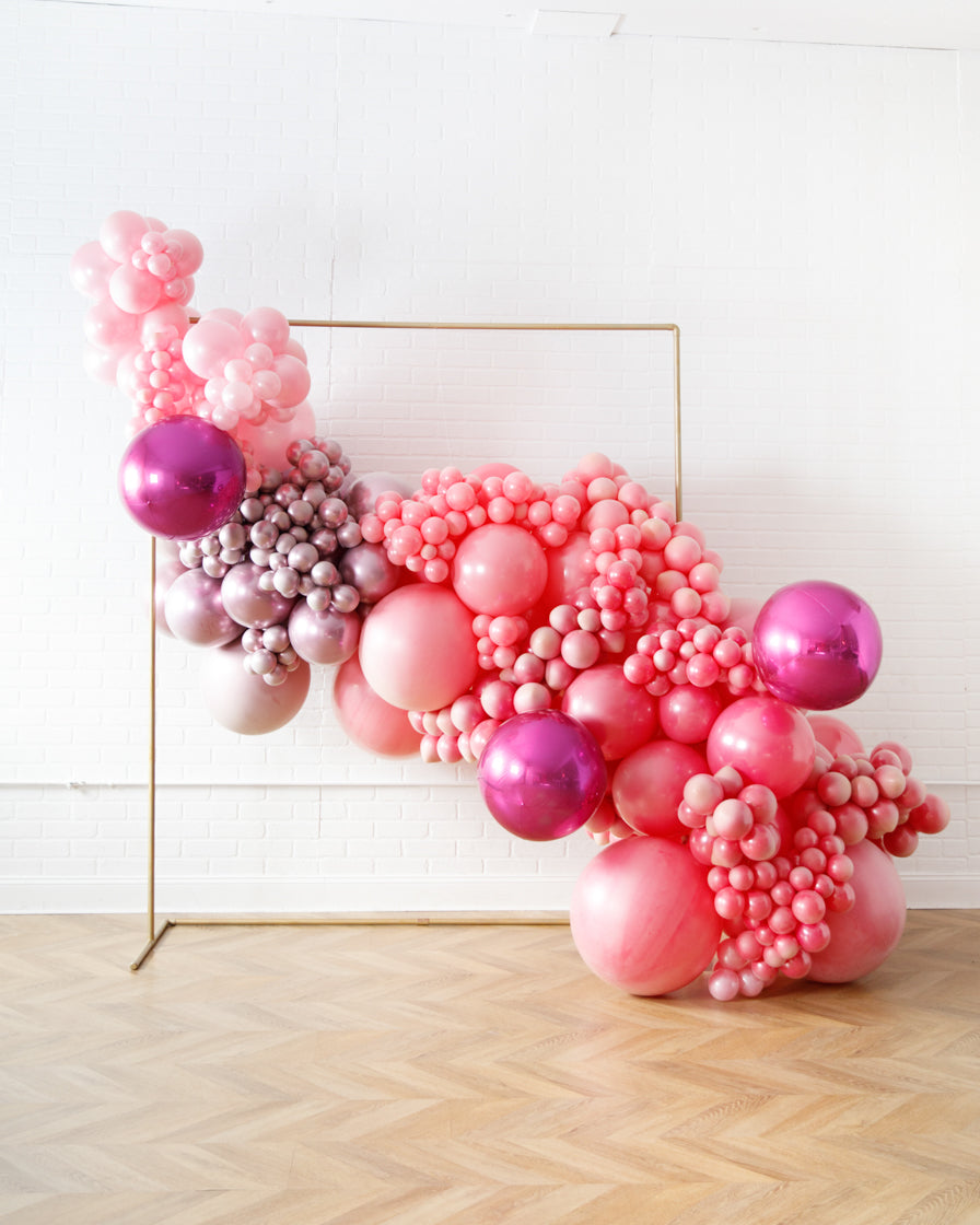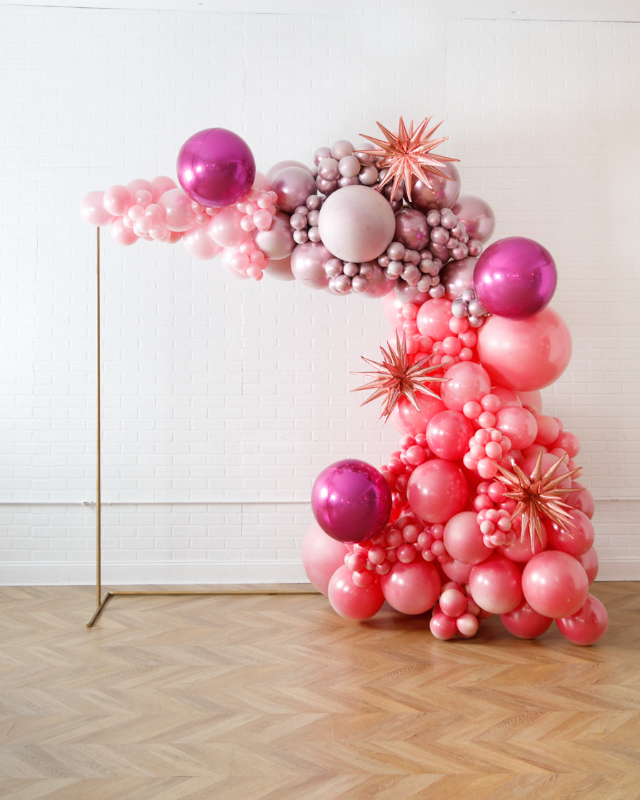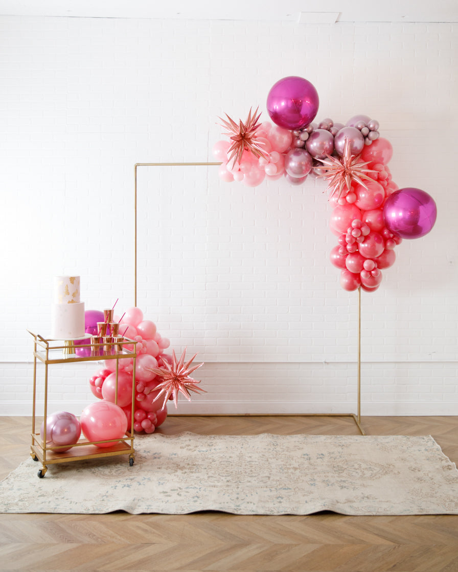 Celebrate boldly with our signature gold frame and diagonal organic garland design! This includes a full balloon garland cascading across the frame, perfect for photos. With added foils, it's an even grander affair!