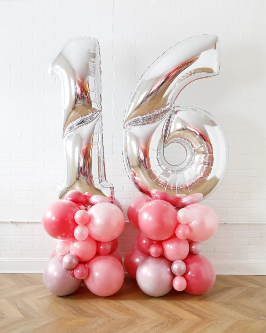 Celebrate your teen's birthday with our jumbo birthday number pedestal. This decor piece includes a silver foil number and bold colorful balloons for a fun and festive birthday bash! Use for photo op backdrop or as part of a decor set. Complete the look with balloons from this collection.