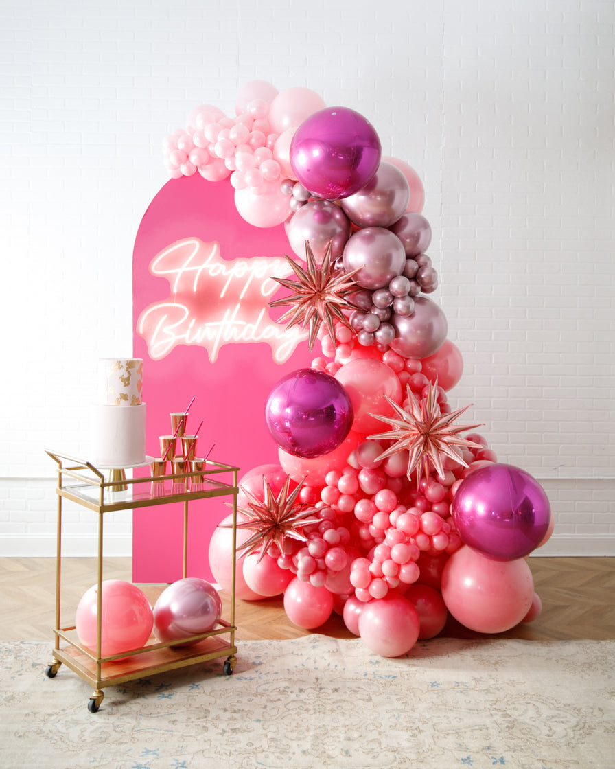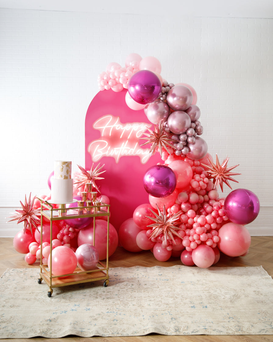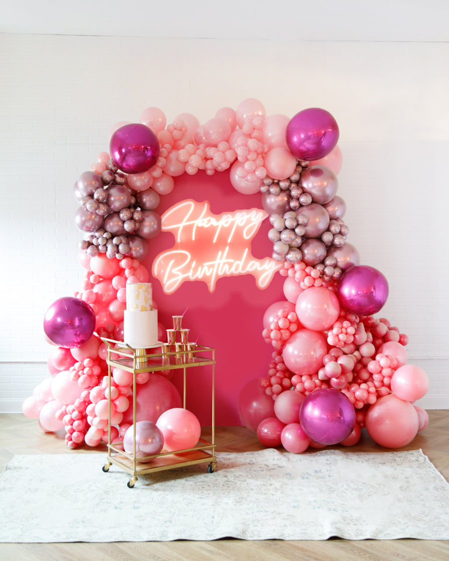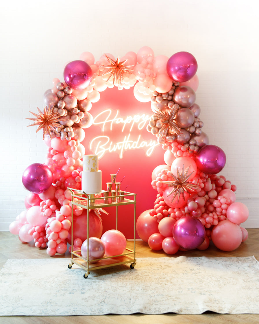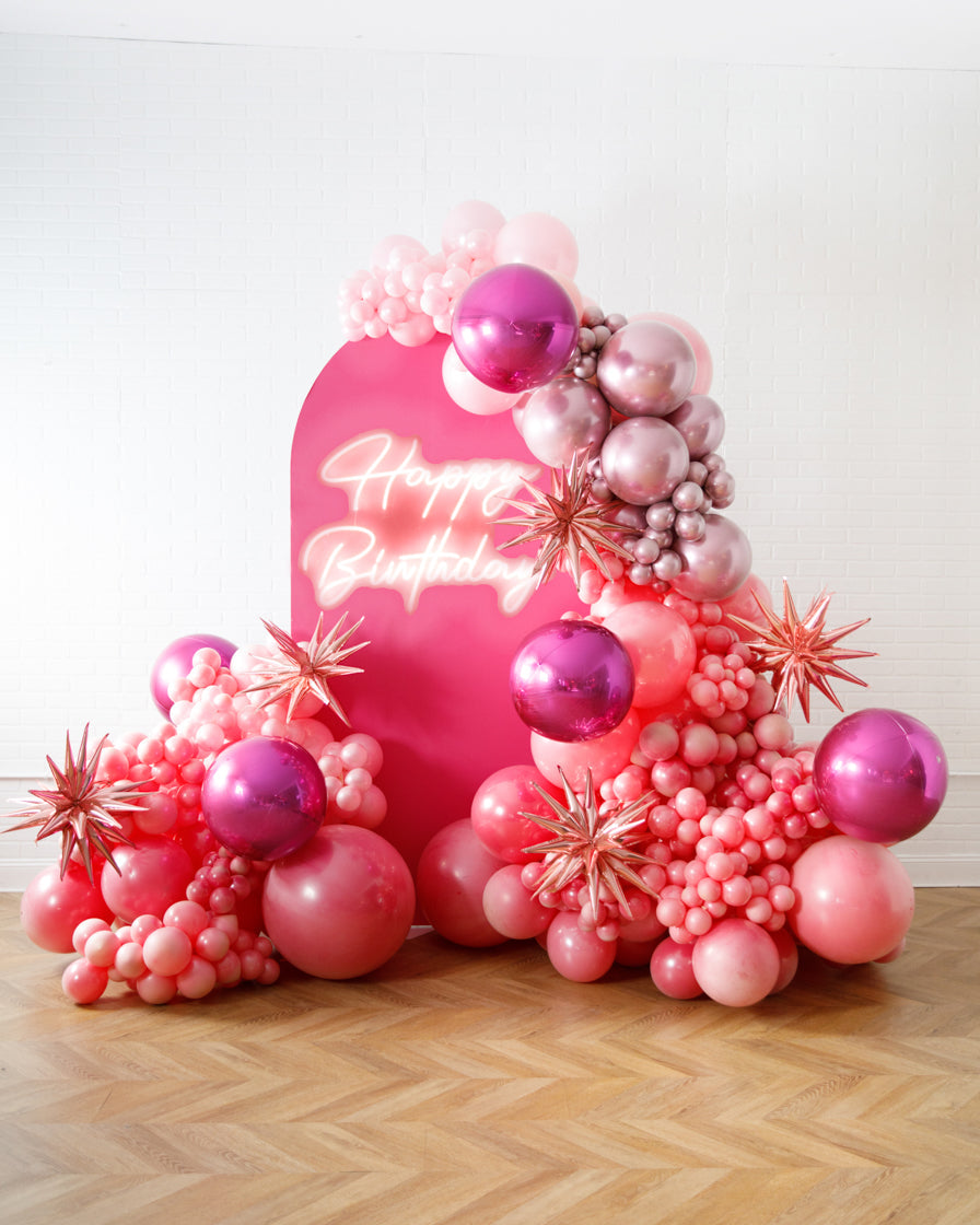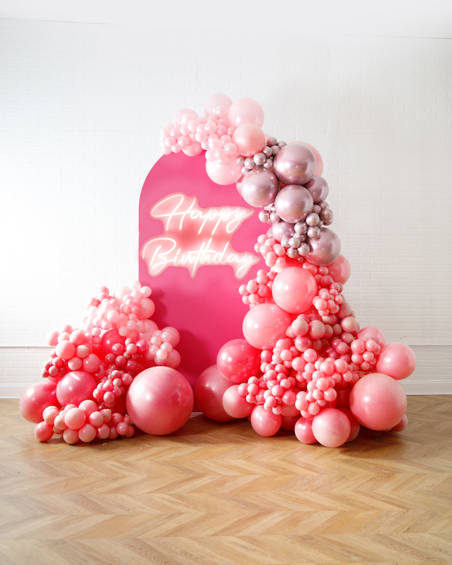 Stand out in style with this panel and balloon garland design. This includes a 7ft panel backdrop, happy birthday neon sign and accompanying organic balloon garland to match. Add foil accents to make your photo backdrop stand out even more!