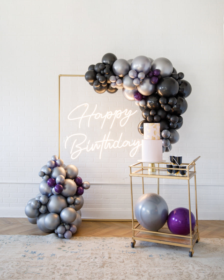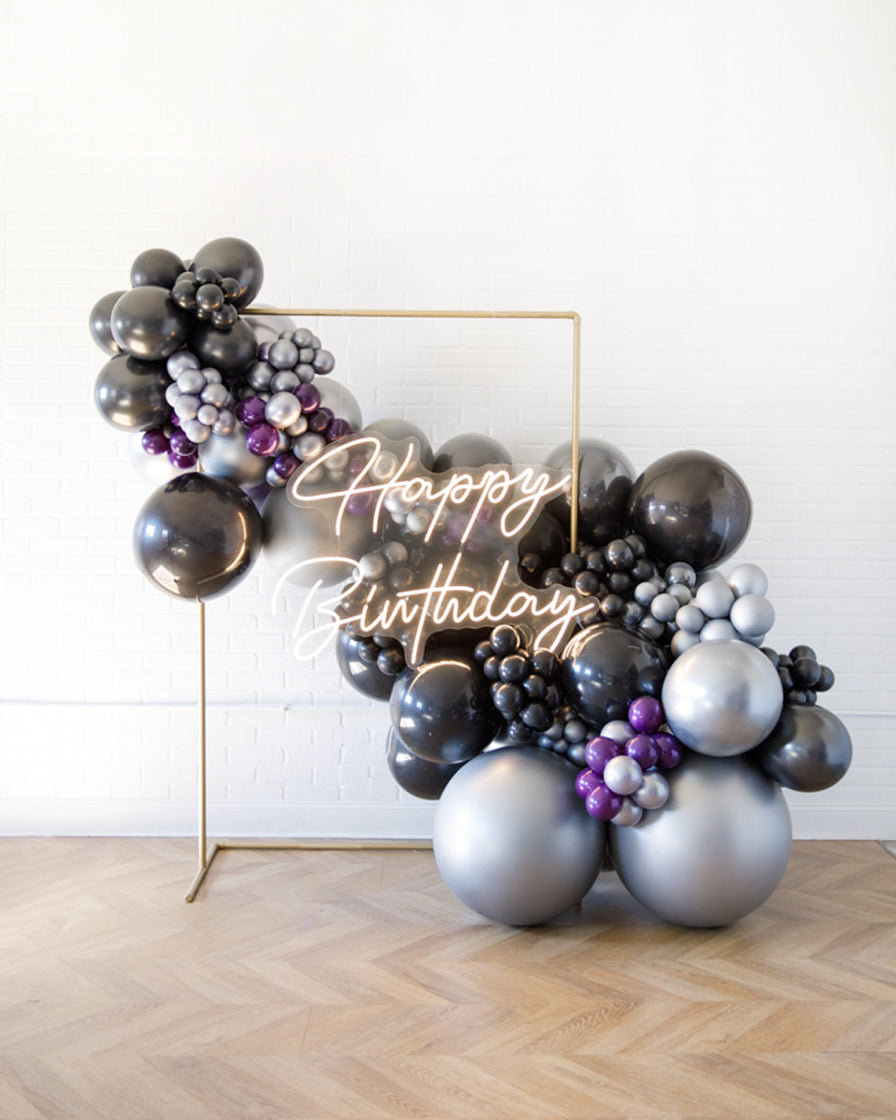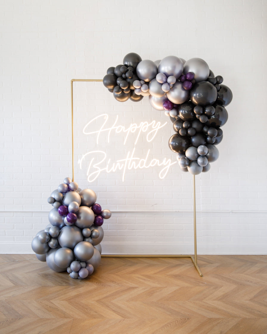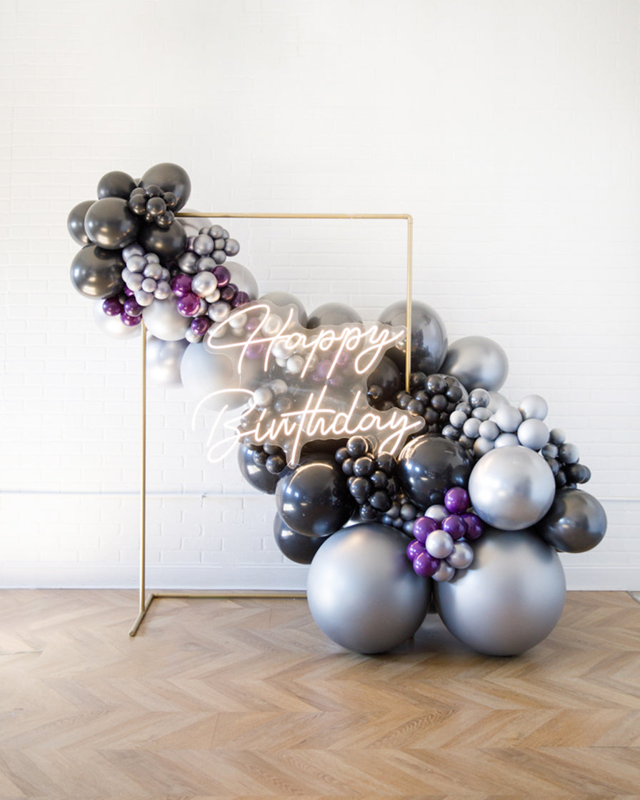 Light up your event with this neon sign, frame and balloon garland set! This picture perfect backdrop includes our neon sign, and an overflowing balloon garland draped around our small gold frame that creates a beautiful backdrop.