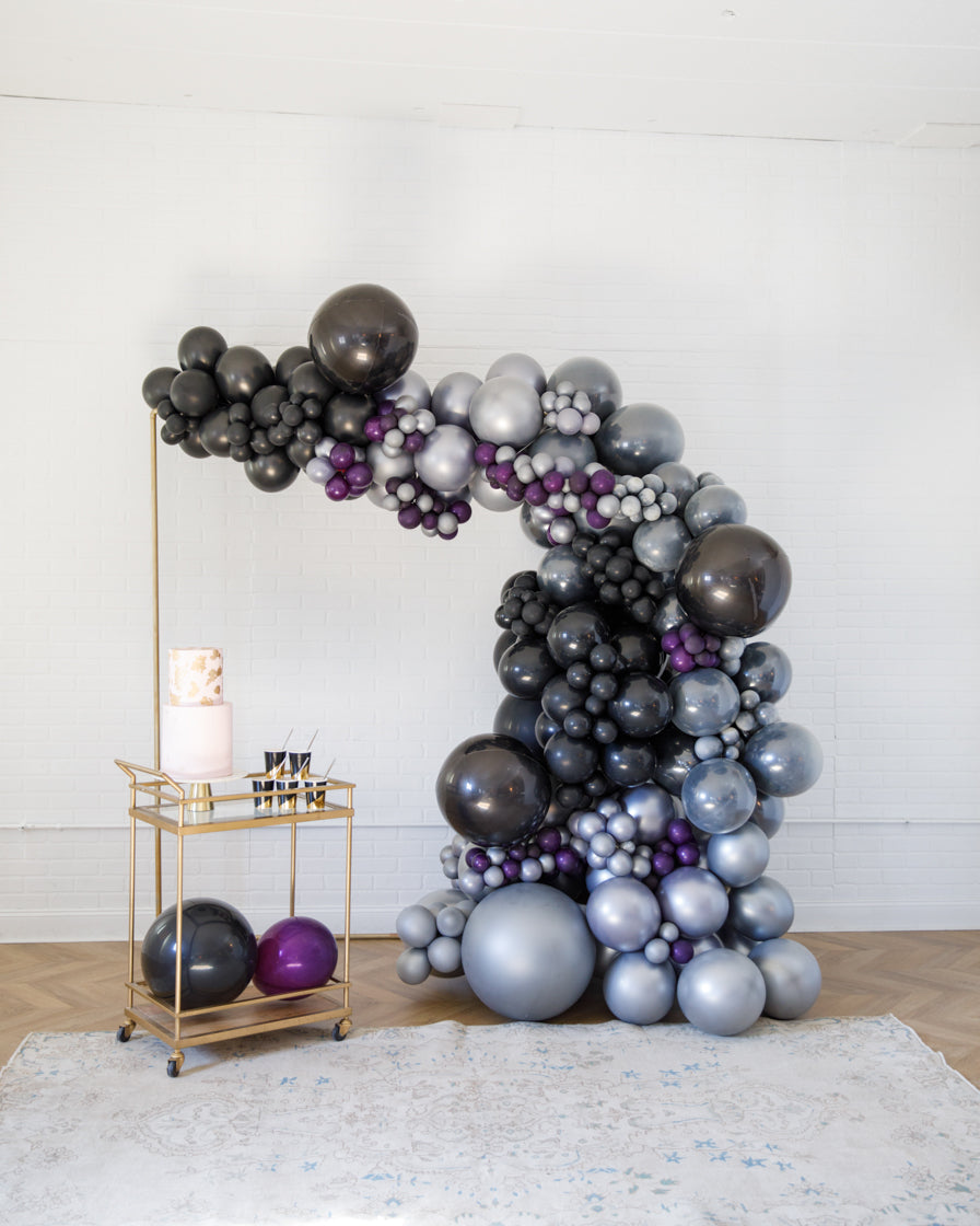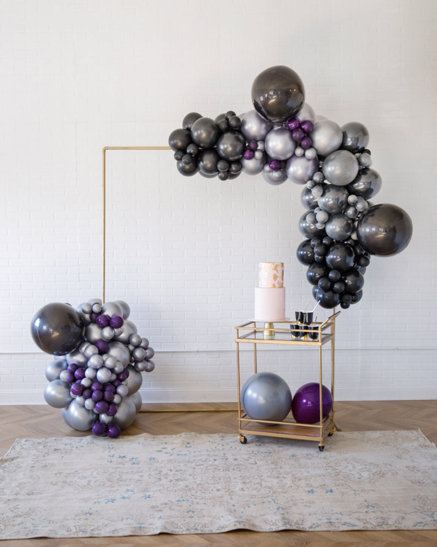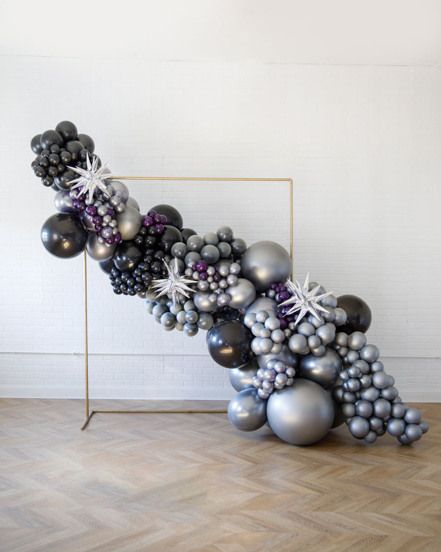 Celebrate boldly with our signature gold frame and diagonal organic garland design! This includes a full balloon garland cascading across the frame, perfect for photos. With added foils, it's an even grander affair!