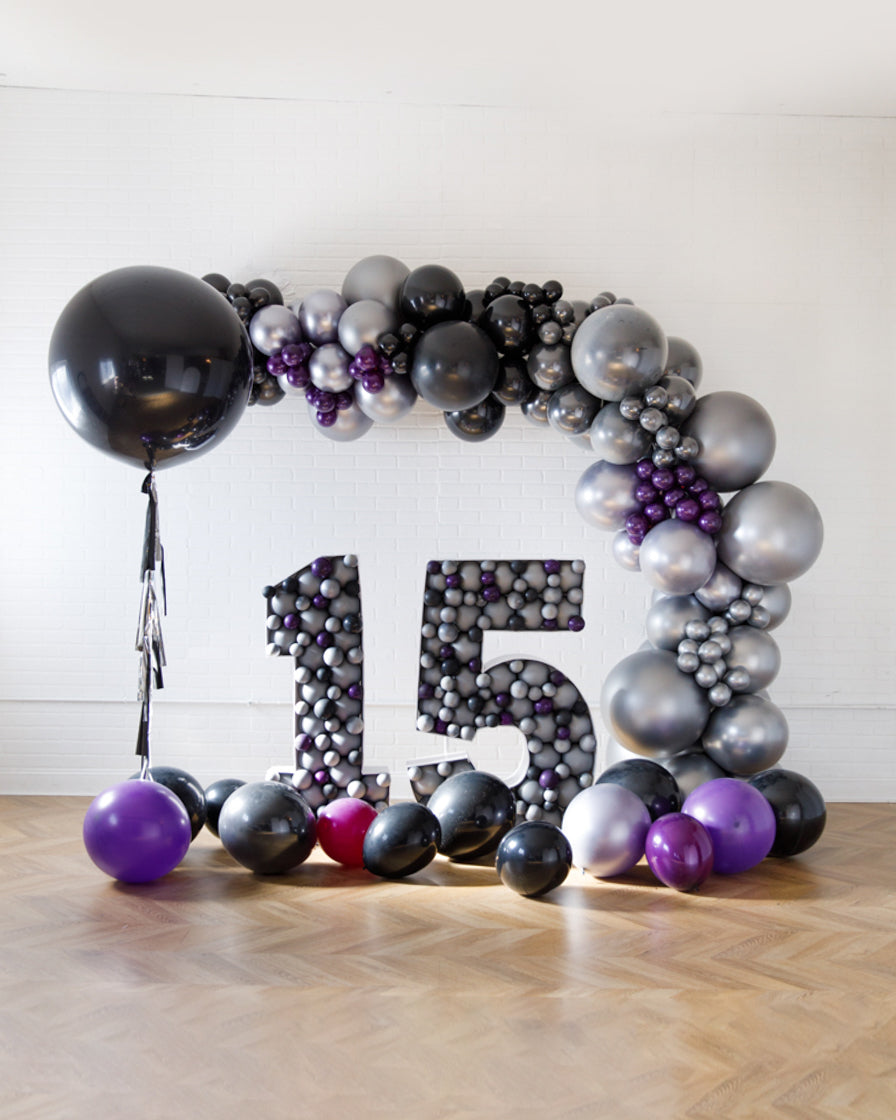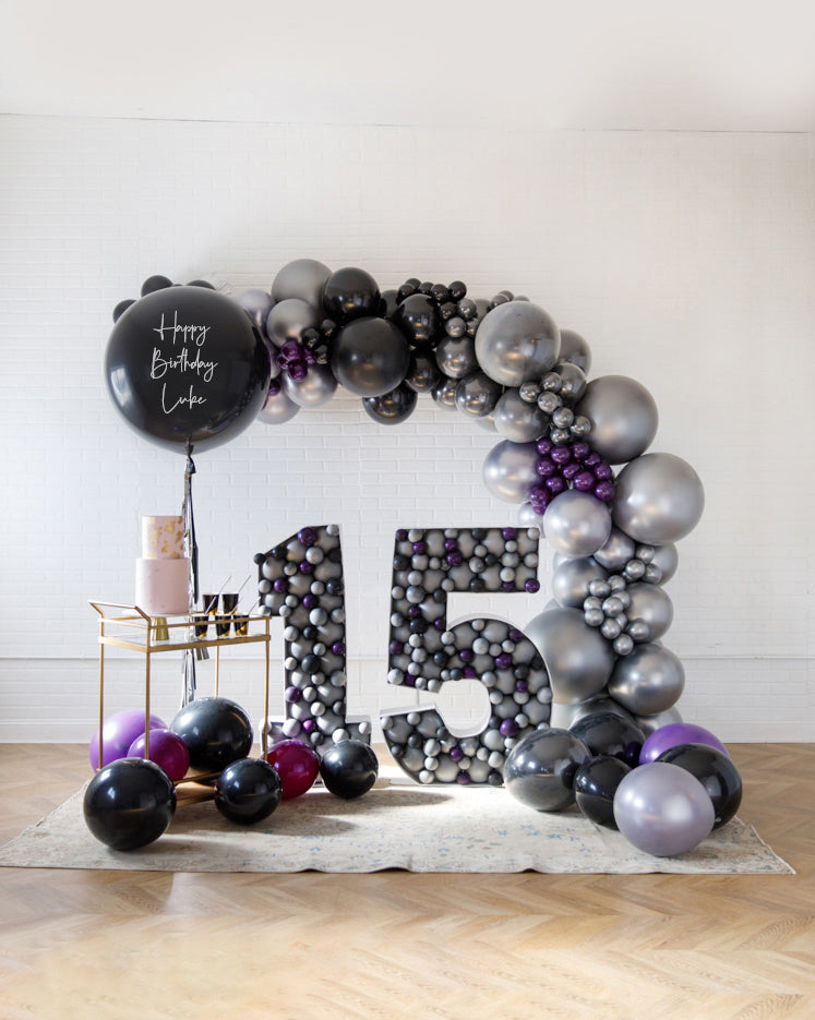 Fill the space effortlessly with this festive backdrop set for your teen's Tik Tok inspired party! This includes a balloon garland on frame, giant balloon with tassel, floor balloons and mosaic numbers to help celebrate any age.