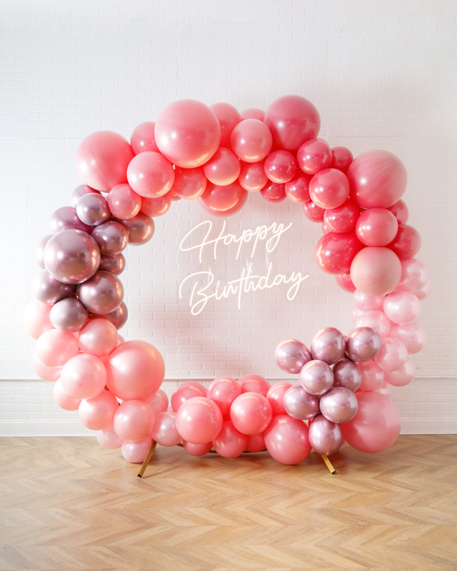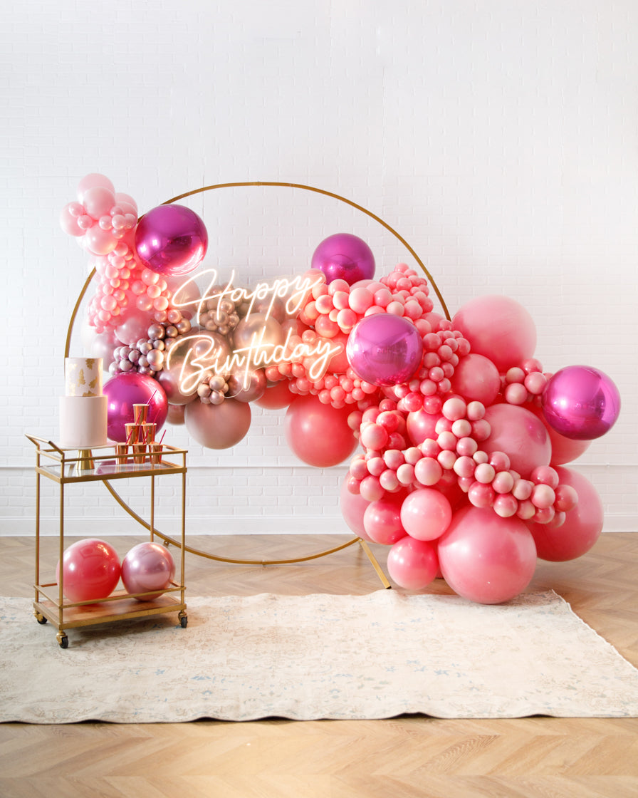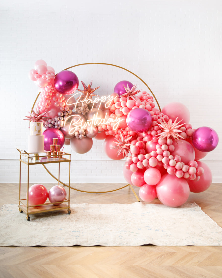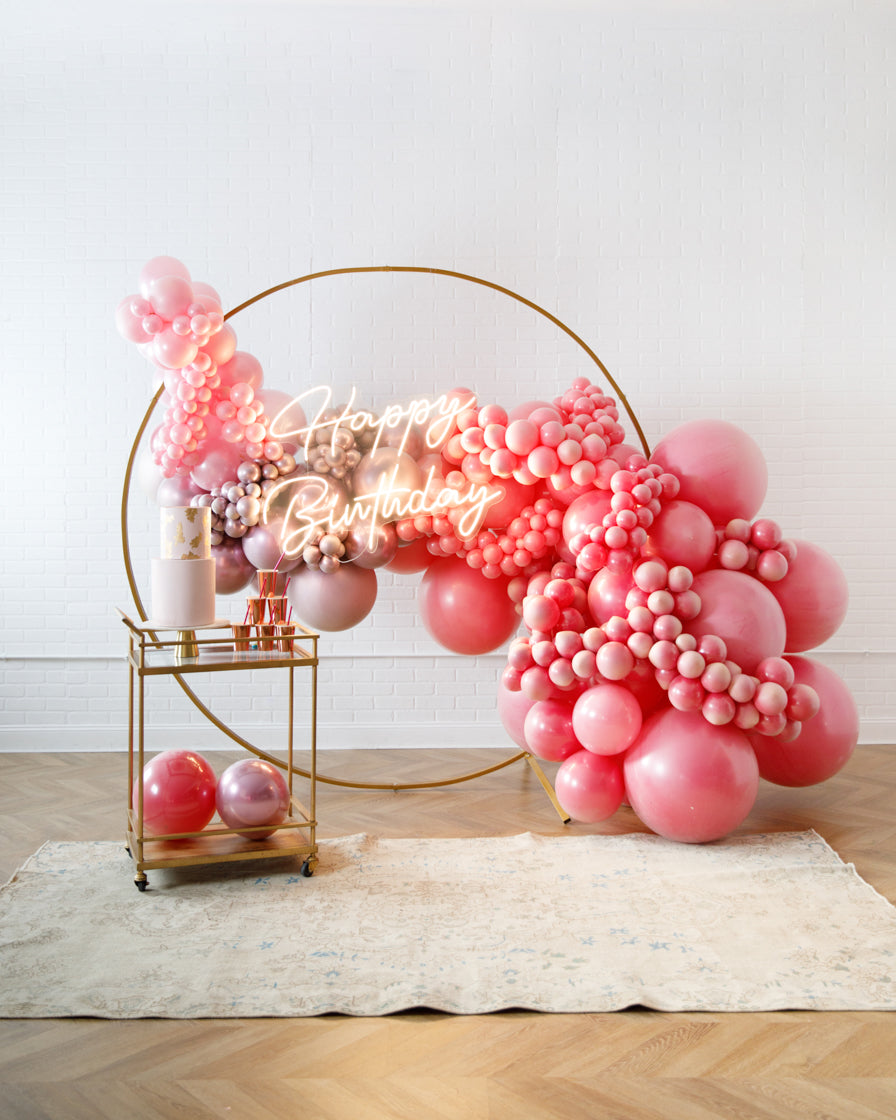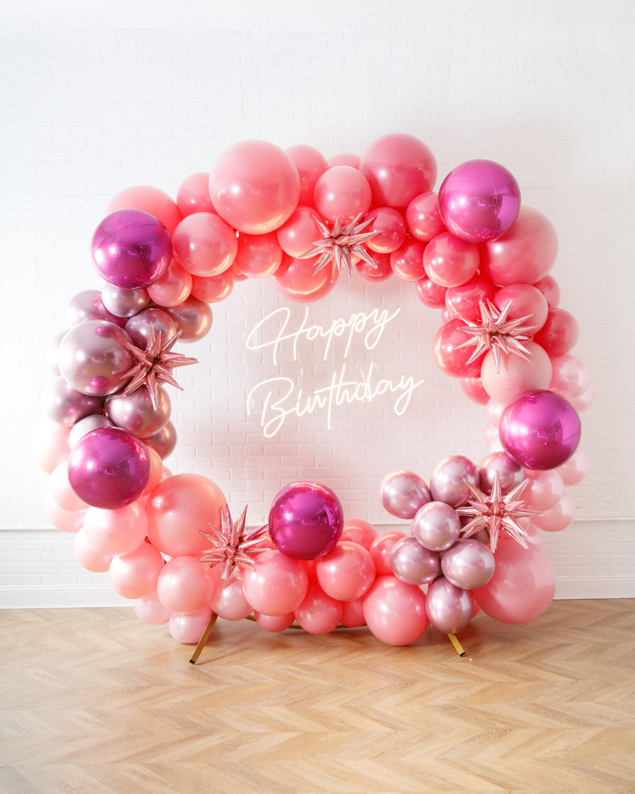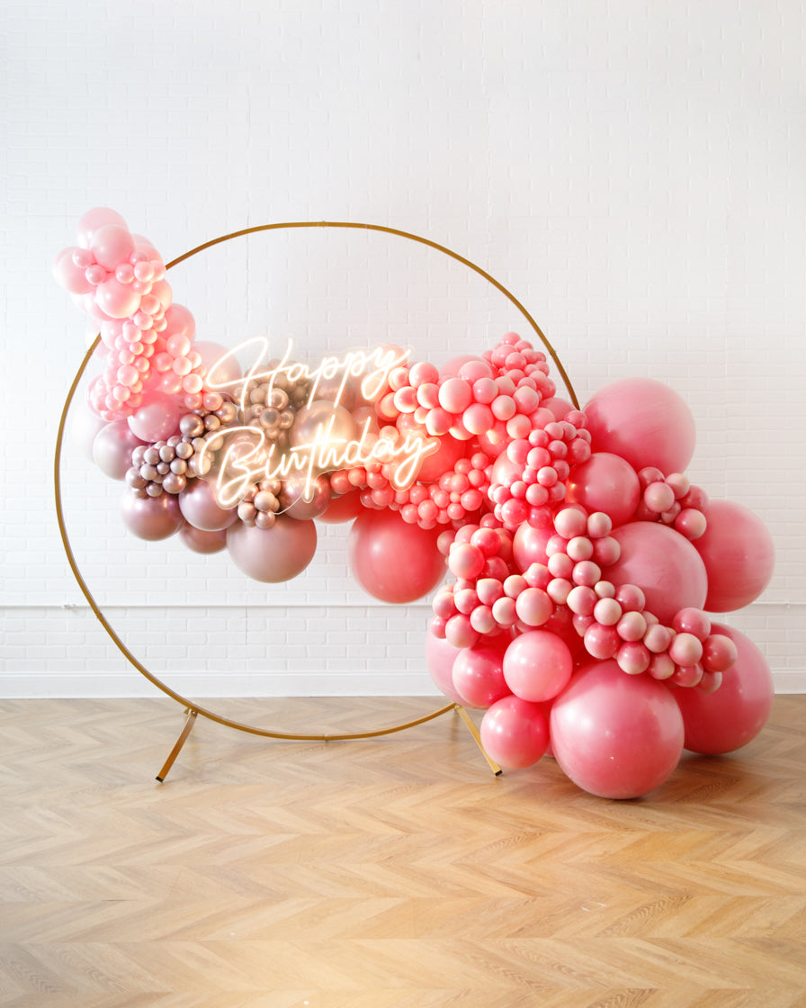 Light up your event with the ultimate backdrop! This balloon garland design includes balloons along a circular frame, as well as a beautiful neon sign to highlight your occasion in style! This works perfectly in any space and will wow your guests!