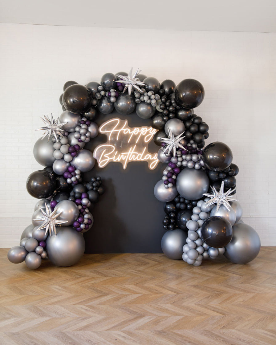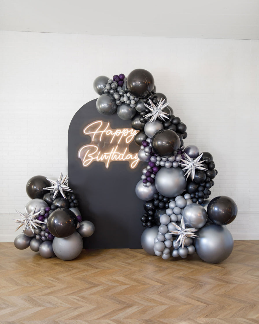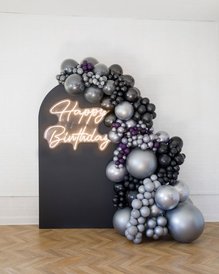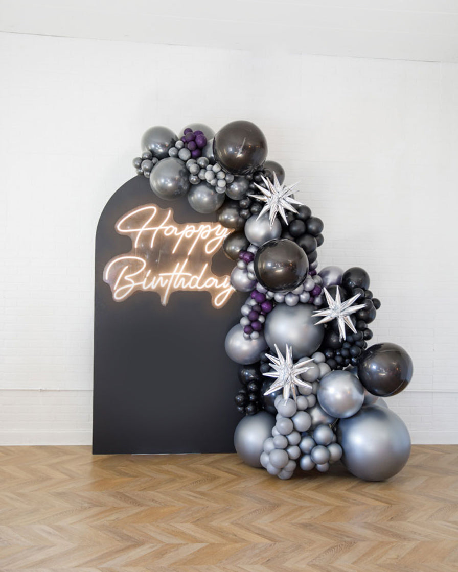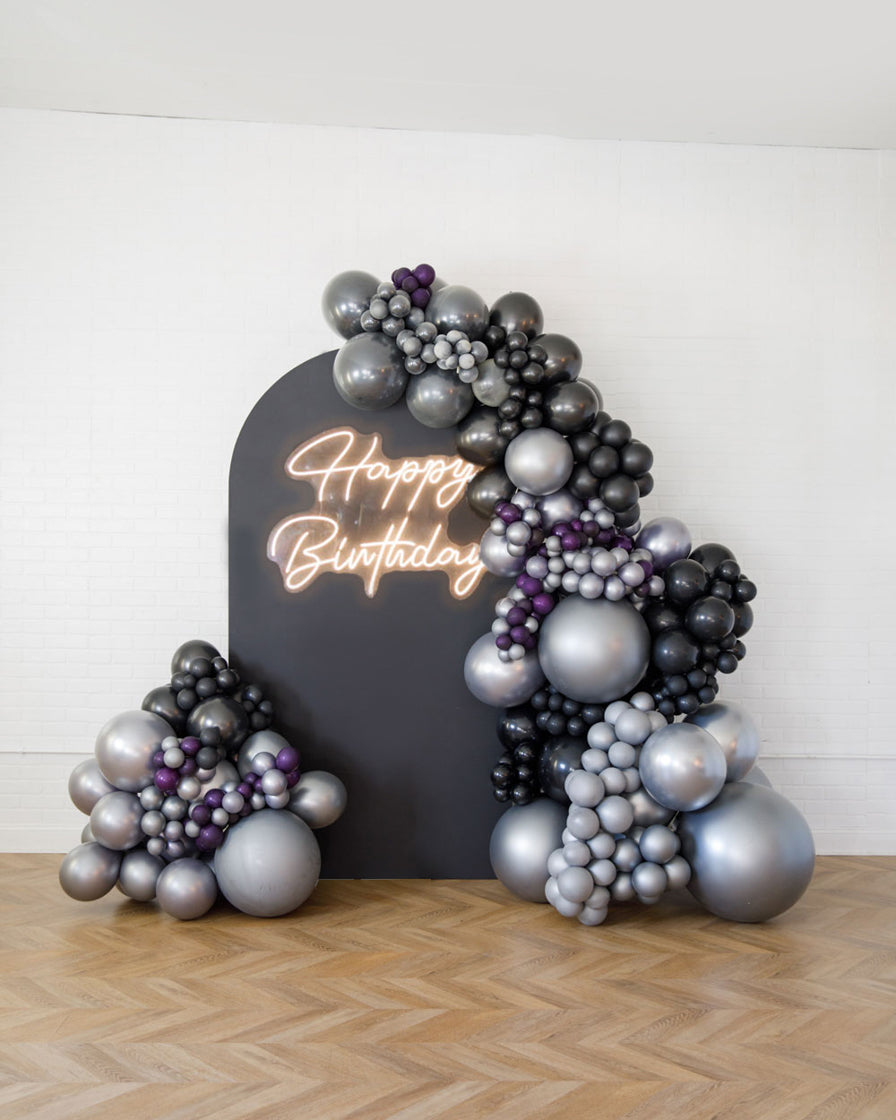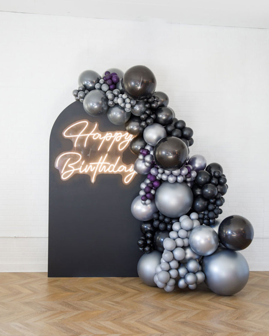 Stand out in style with this panel and balloon garland design. This includes a 7ft panel backdrop, happy birthday neon sign and accompanying organic balloon garland to match. Add foil accents to make your photo backdrop stand out even more!
