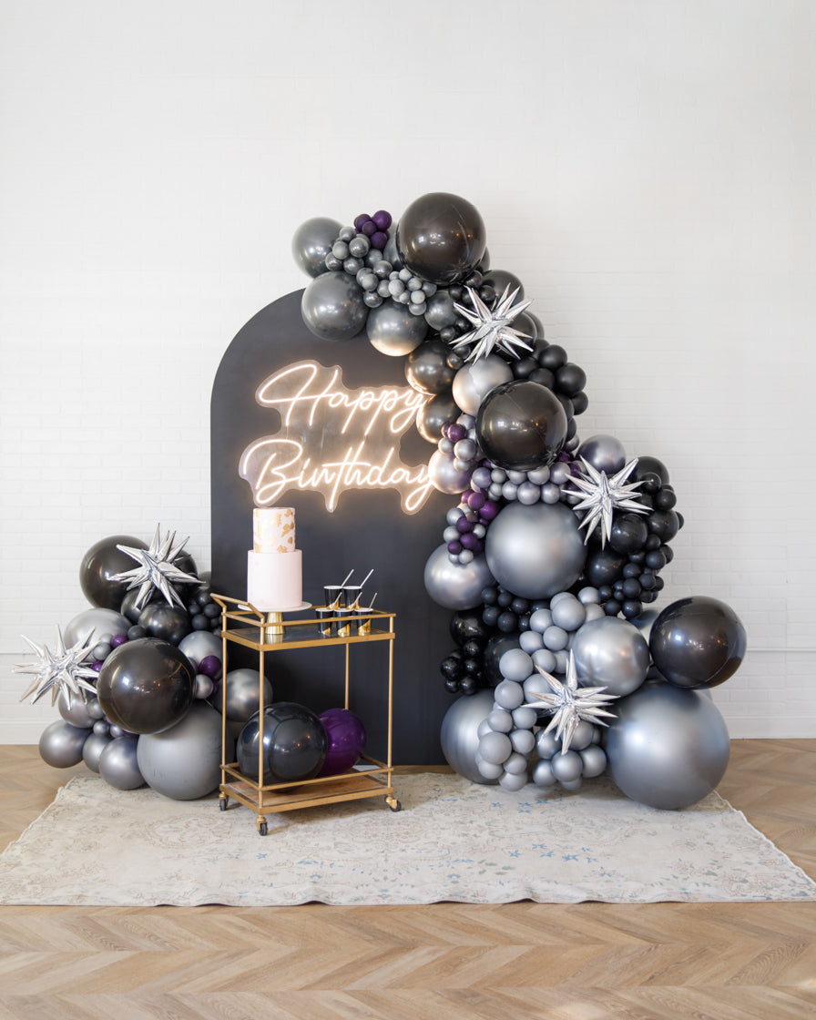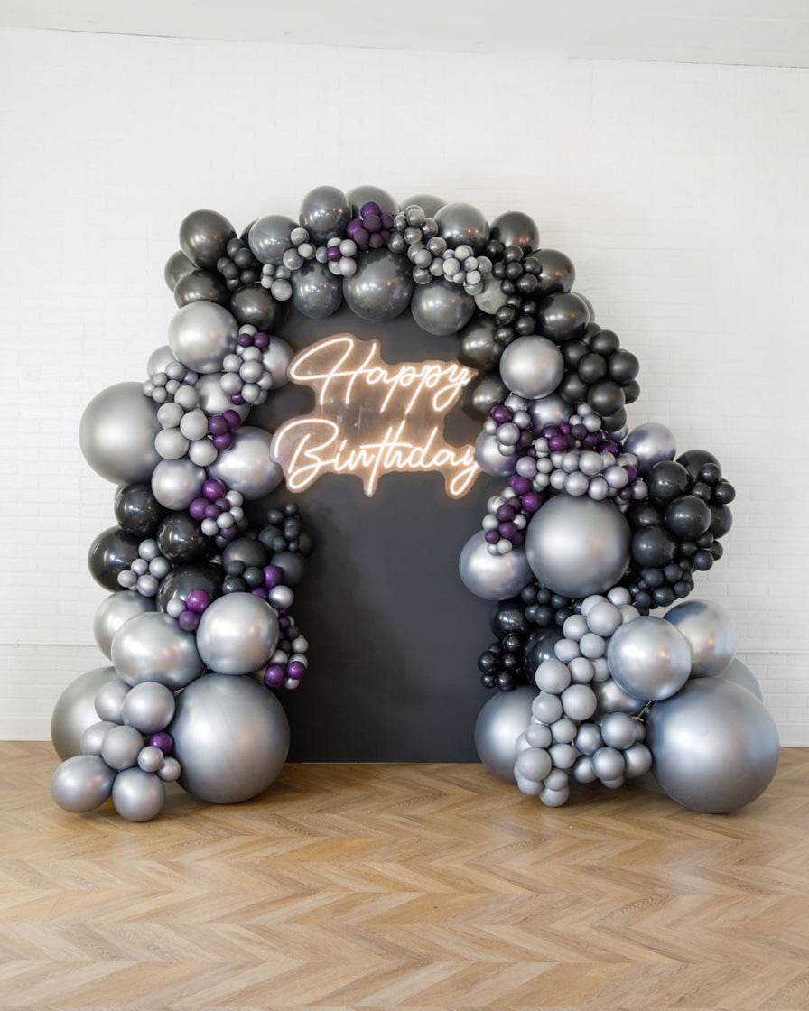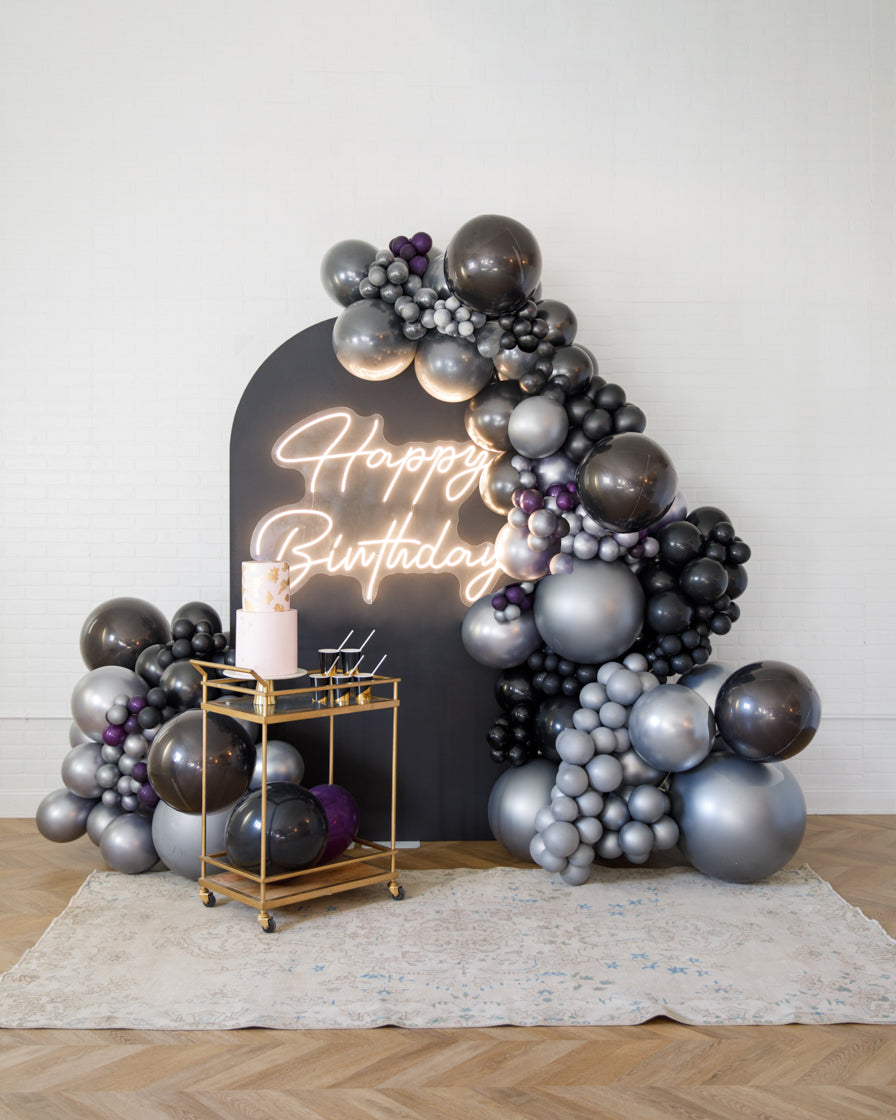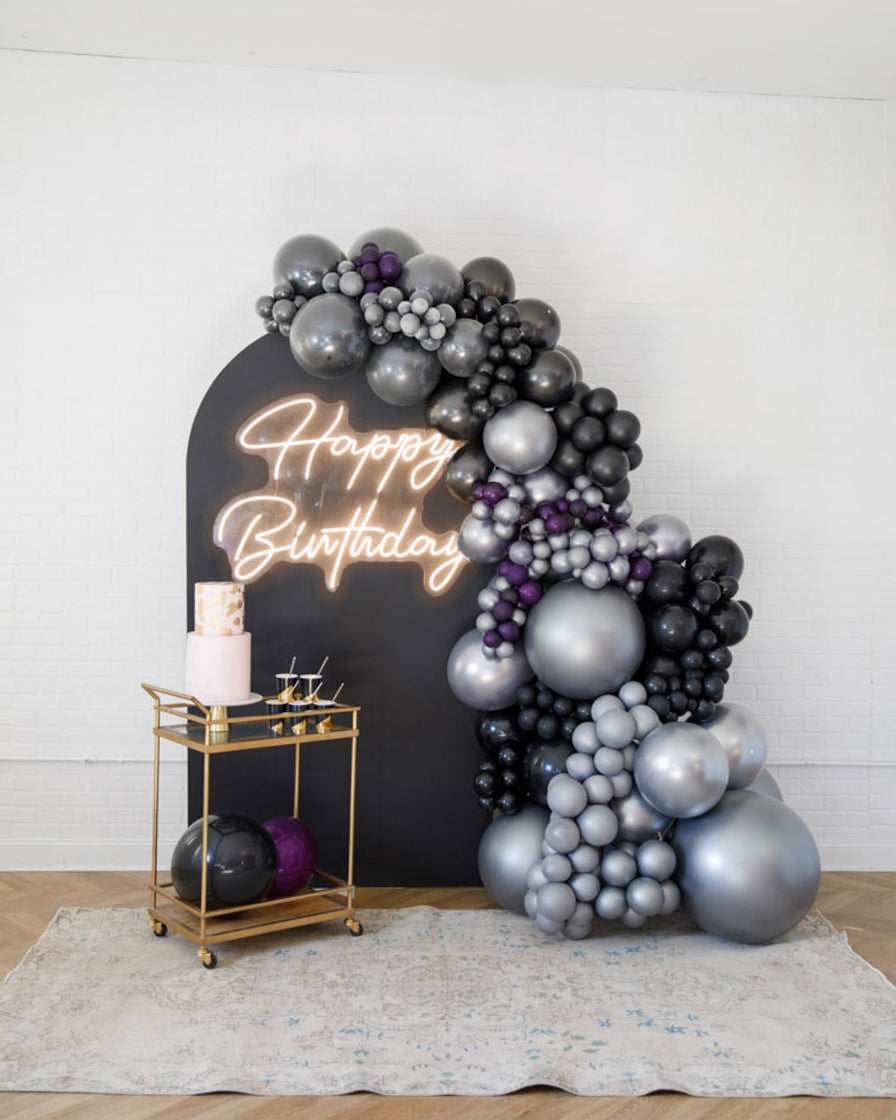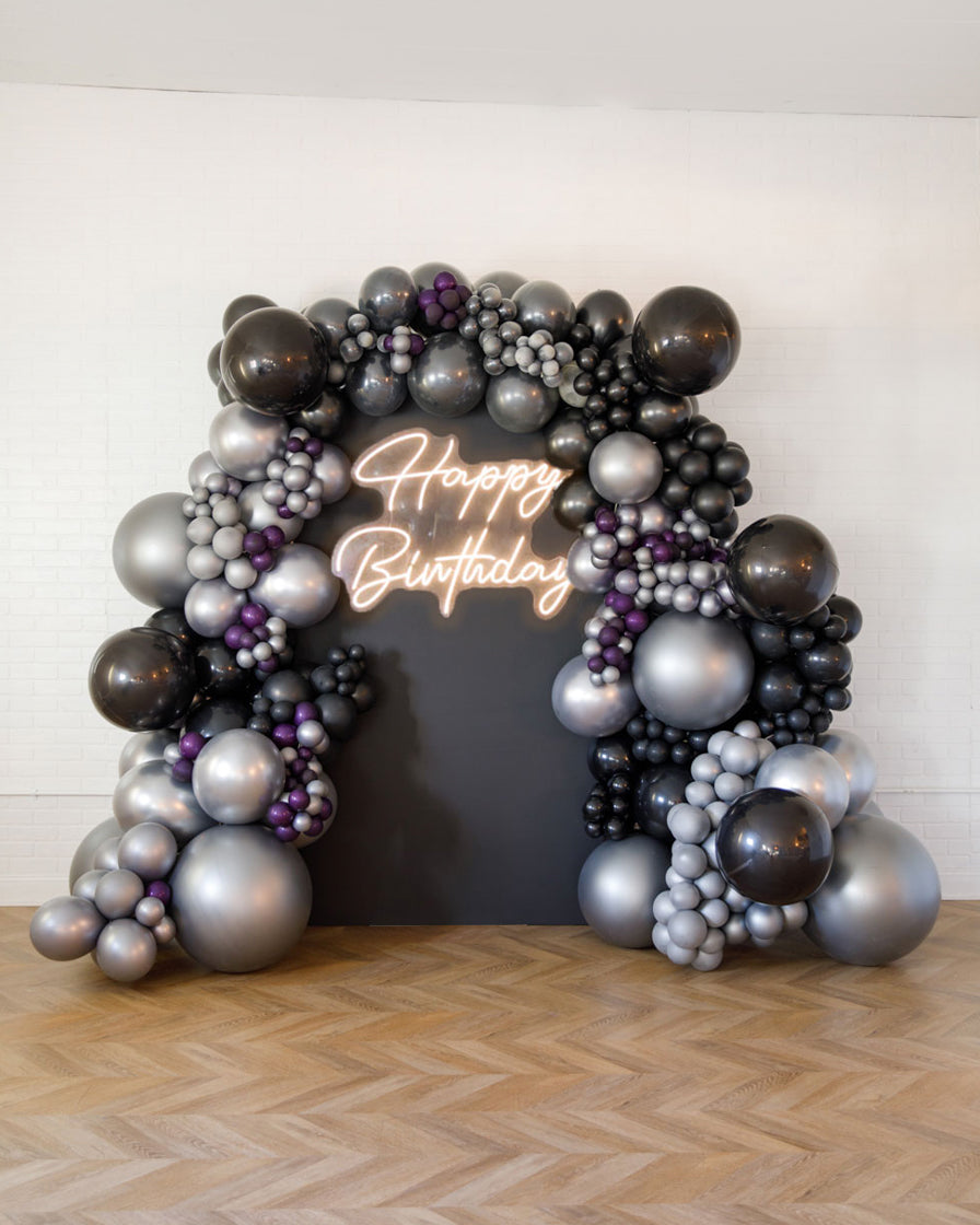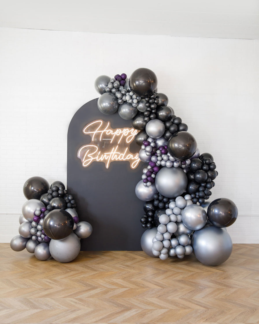 Stand out in style with this panel and balloon garland design. This includes a 7ft panel backdrop, happy birthday neon sign and accompanying organic balloon garland to match. Add foil accents to make your photo backdrop stand out even more!