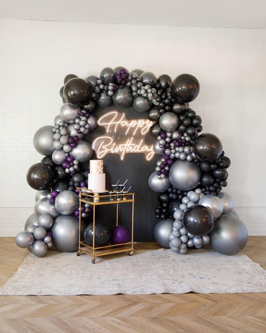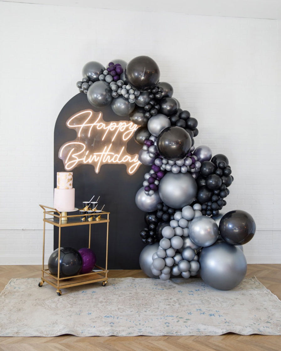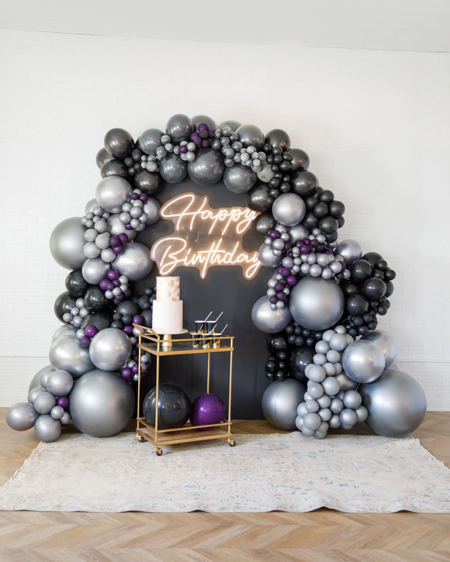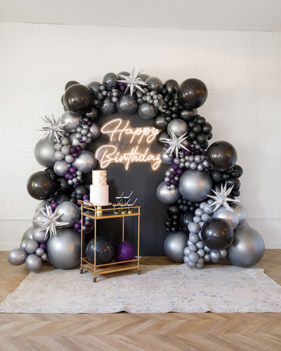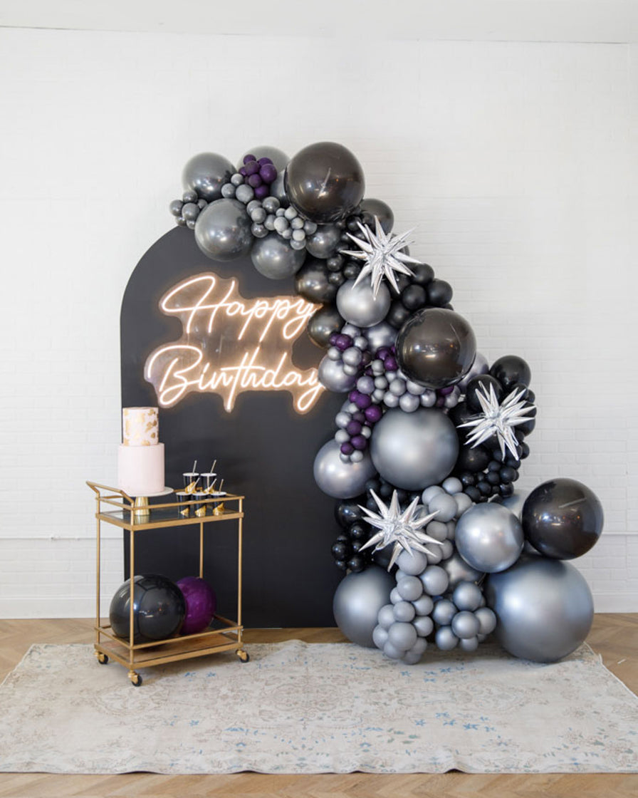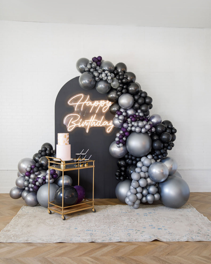 Stand out in style with this panel and balloon garland design. This includes a 7ft panel backdrop, happy birthday neon sign and accompanying organic balloon garland to match. Add foil accents to make your photo backdrop stand out even more!