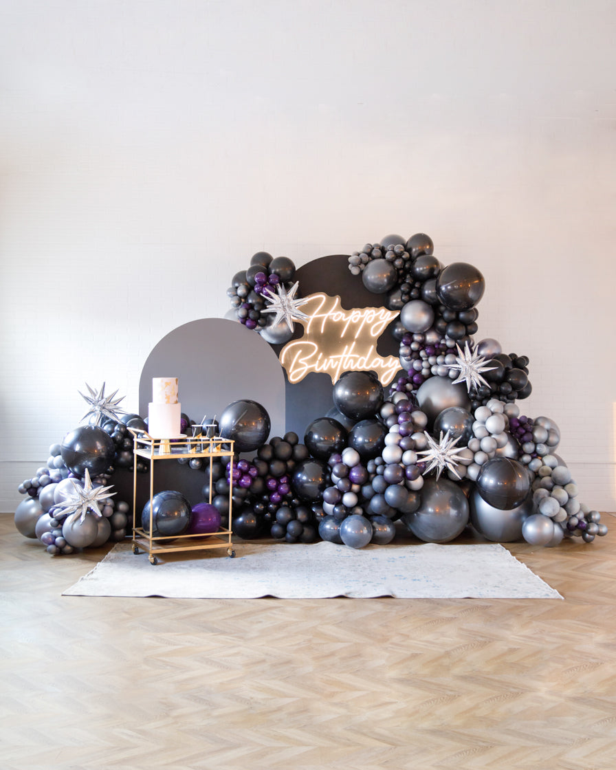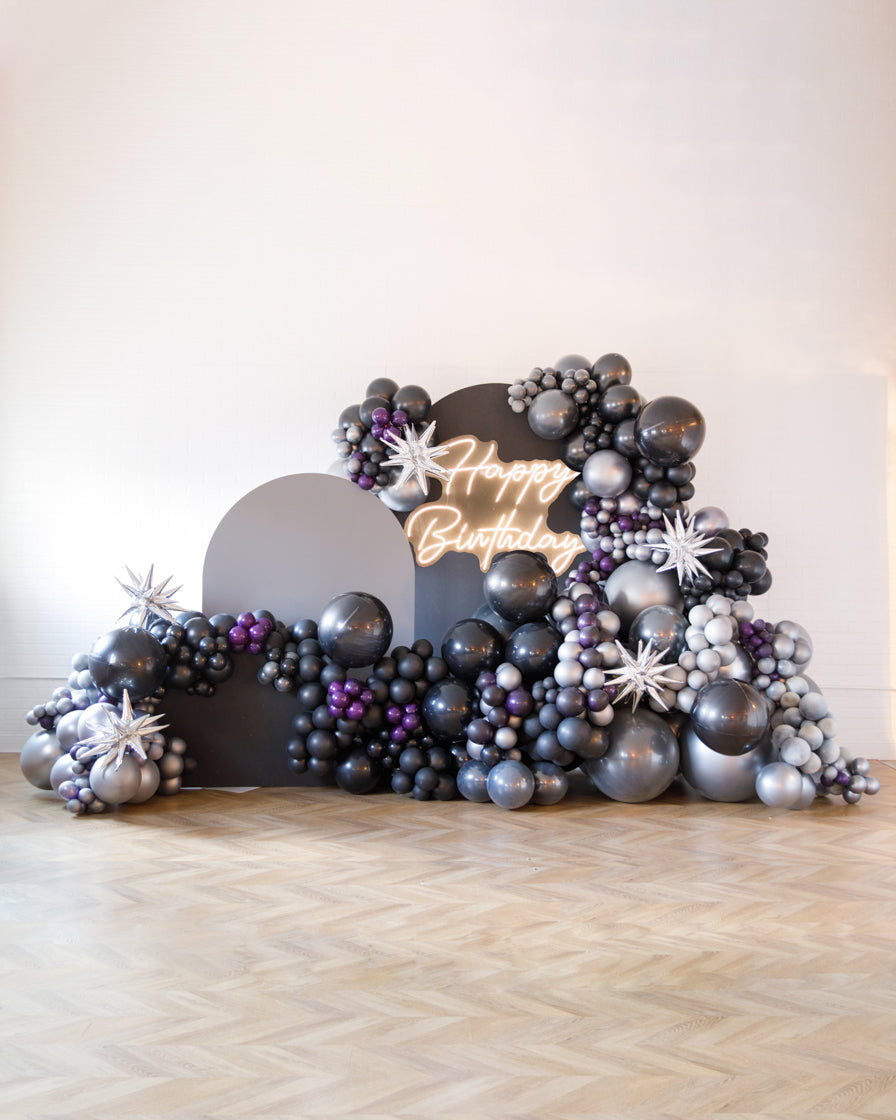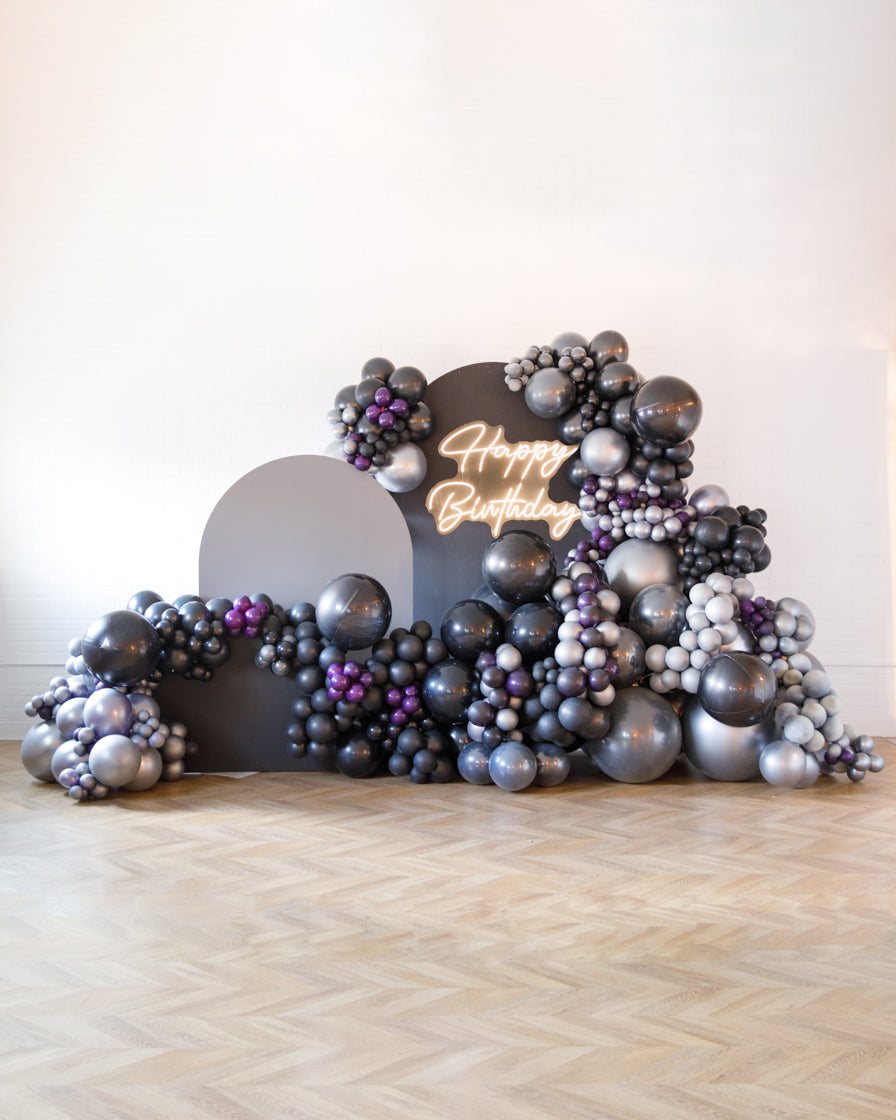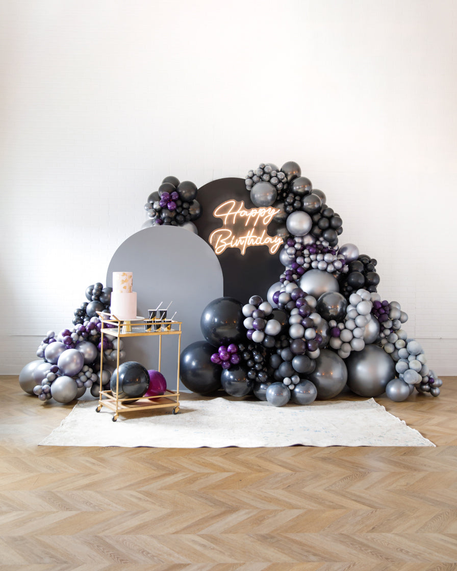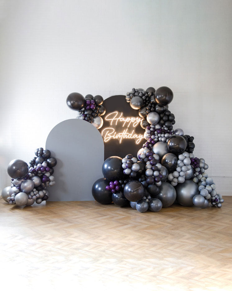 Stand out in style with this panel and balloon garland design. This includes a panel backdrops, neon happy birthday sign and organic balloon garlands to match. Add foil accents to make your photo backdrop stand out even more!