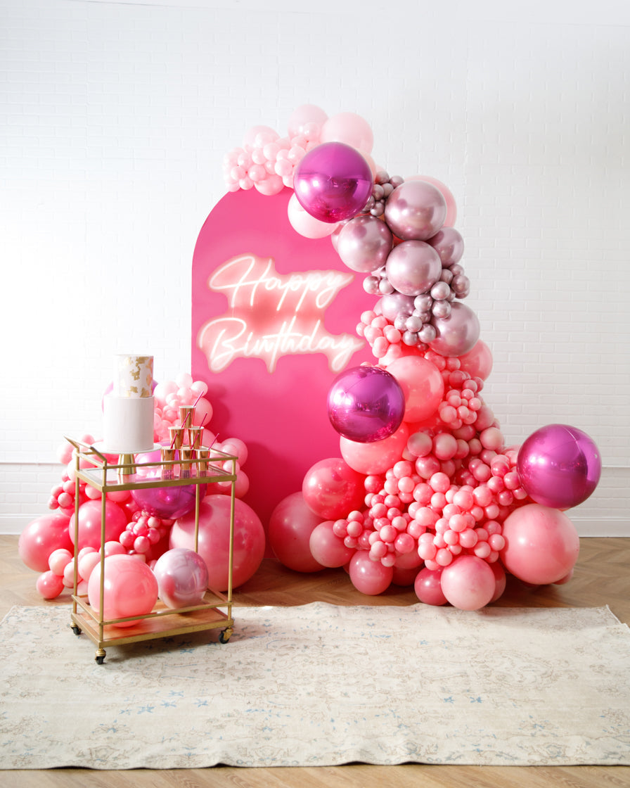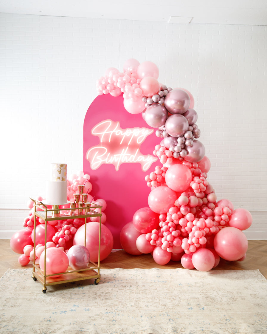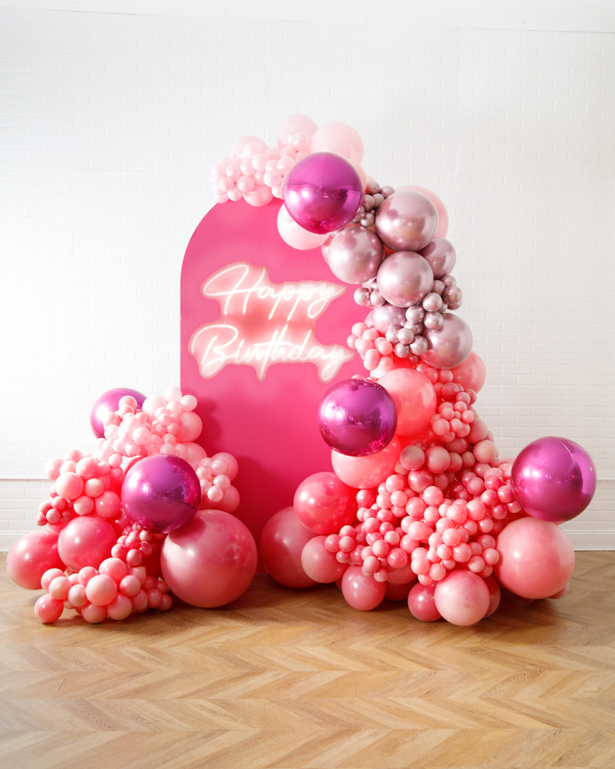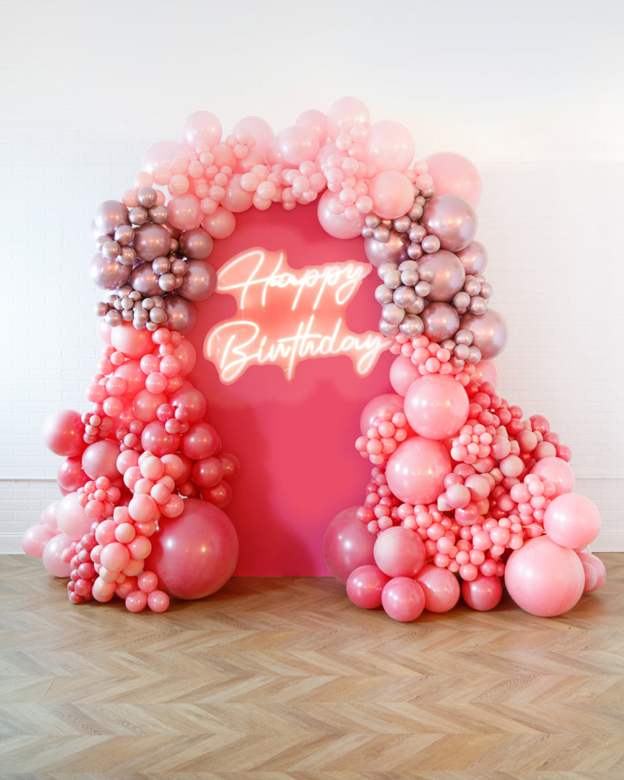 Stand out in style with this panel and balloon garland design. This includes a 7ft panel backdrop, happy birthday neon sign and accompanying organic balloon garland to match. Add foil accents to make your photo backdrop stand out even more!