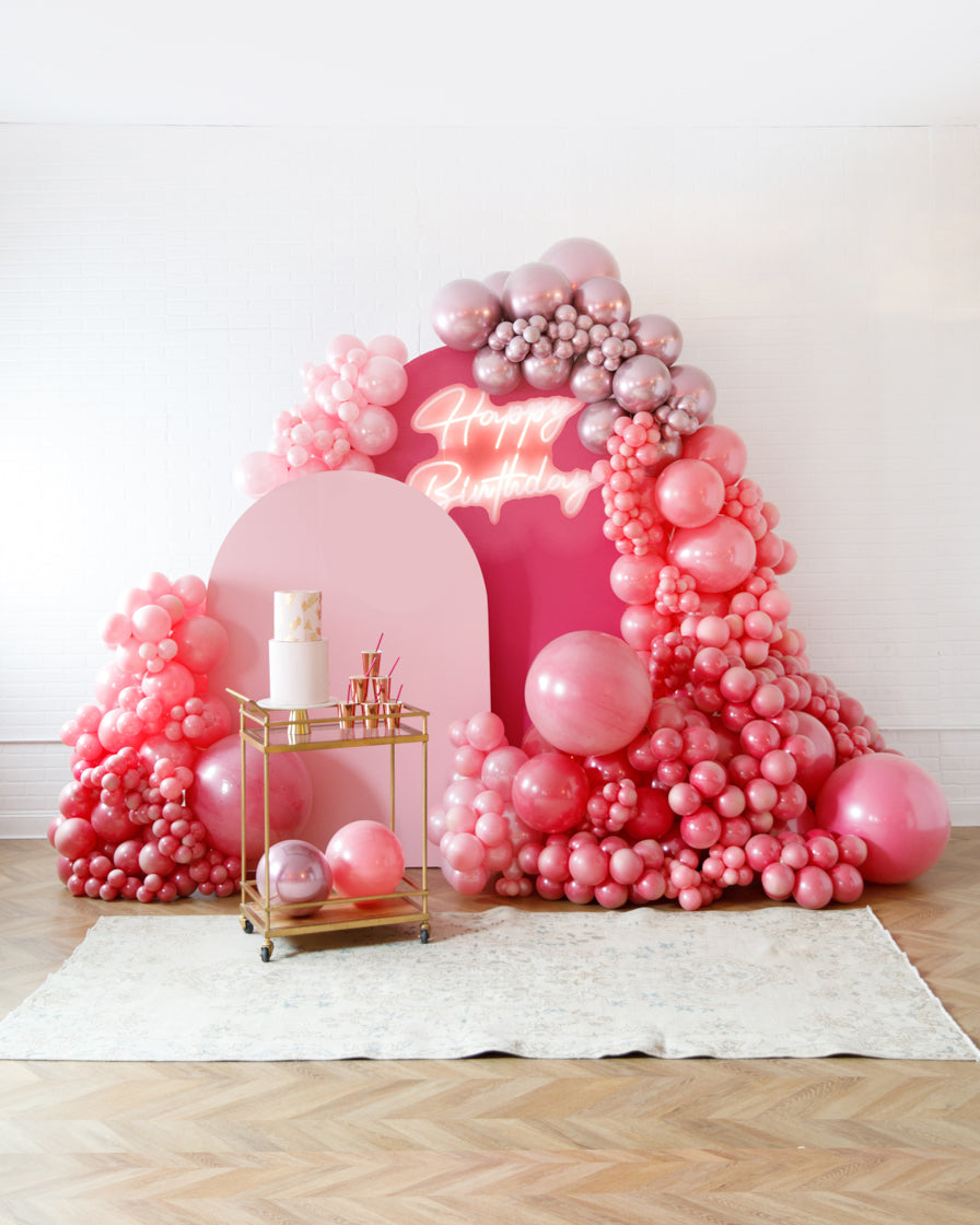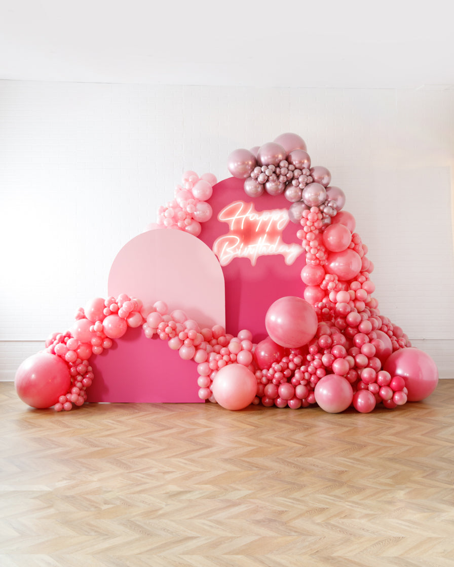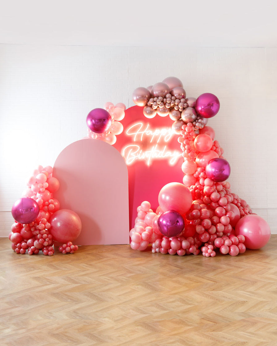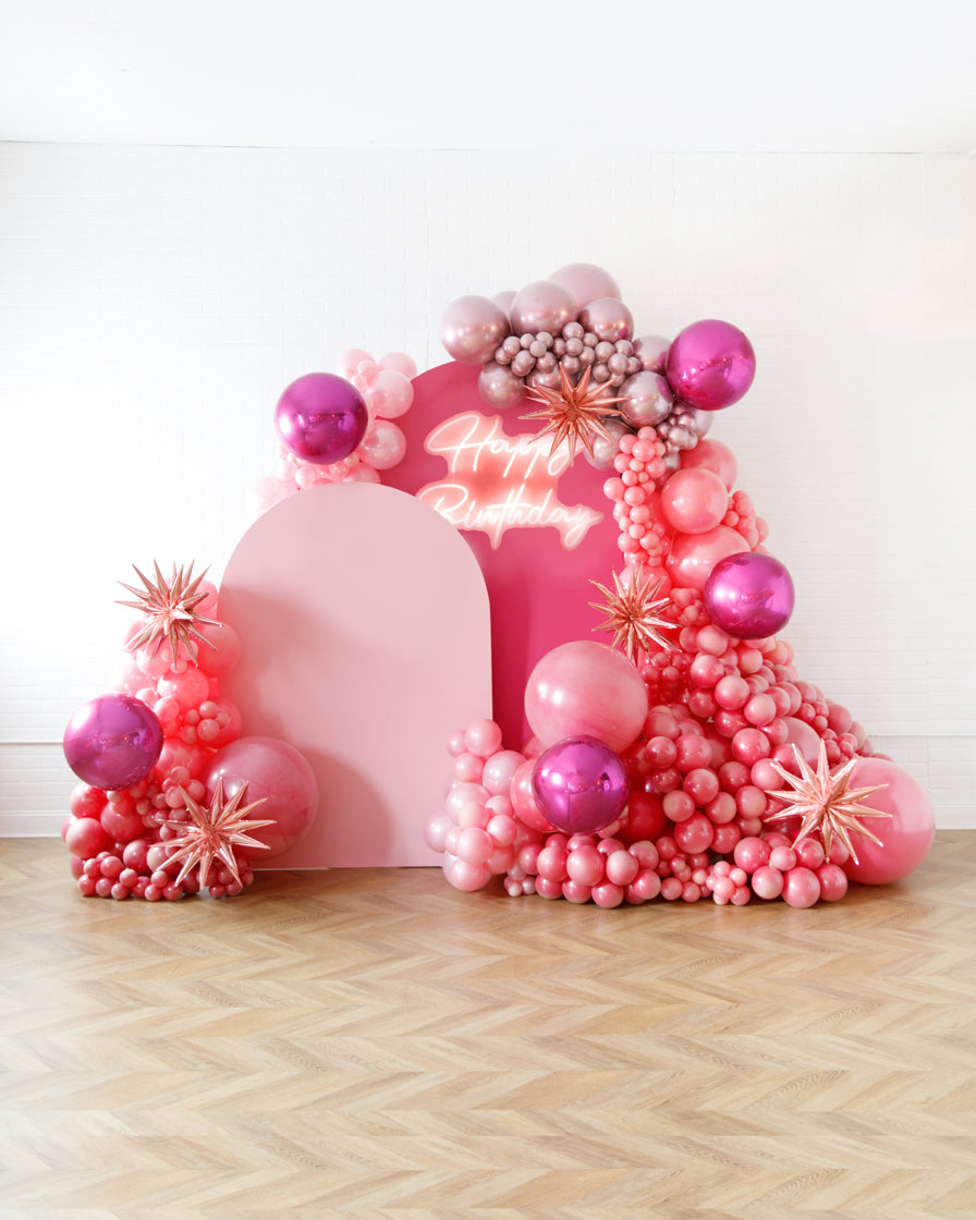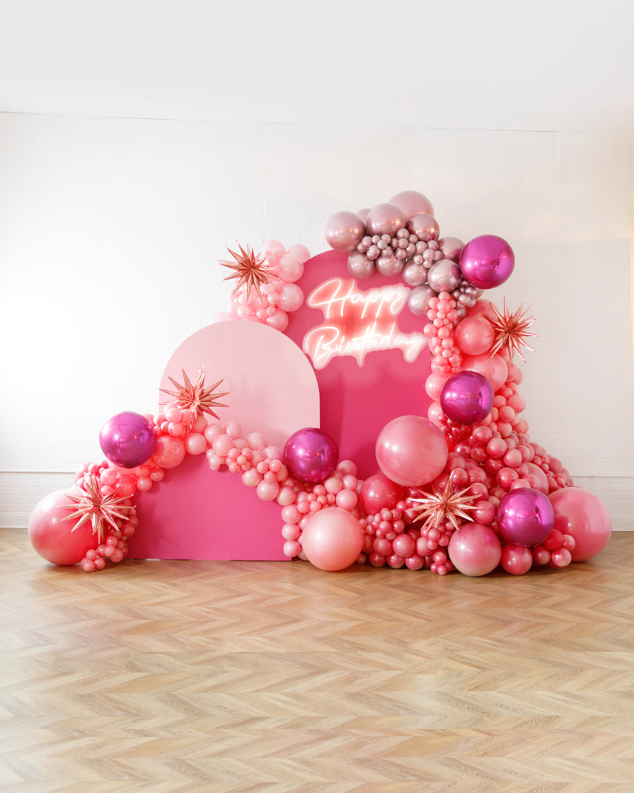 Stand out in style with this panel and balloon garland design. This includes a panel backdrops, neon happy birthday sign and organic balloon garlands to match. Add foil accents to make your photo backdrop stand out even more!